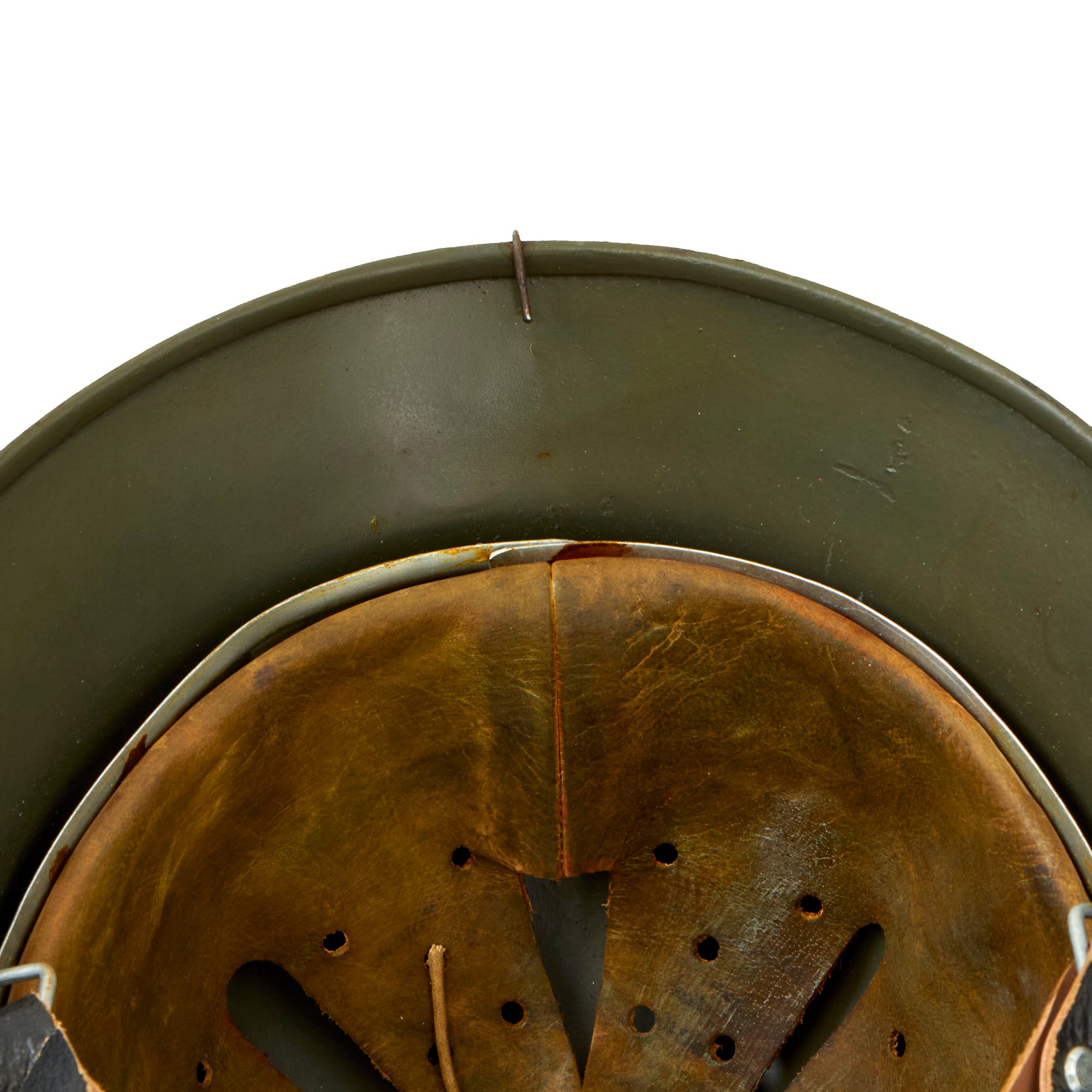 What does refurbished mean? While the shell is 100% genuine WWII manufacture, we have tasked, perhaps the very best German Helmet restorer in the USA, to customize this helmet. Every detail is hand done, with the finest materials including a hand painted shell, with a hand hand aged high quality reproduction liner. Please know that the paint, liner and chinstrap, while they look totally original are all new and the helmet has been refurbished to look as if it was picked up off the battlefield by a USGI and brought home as a war trophy.