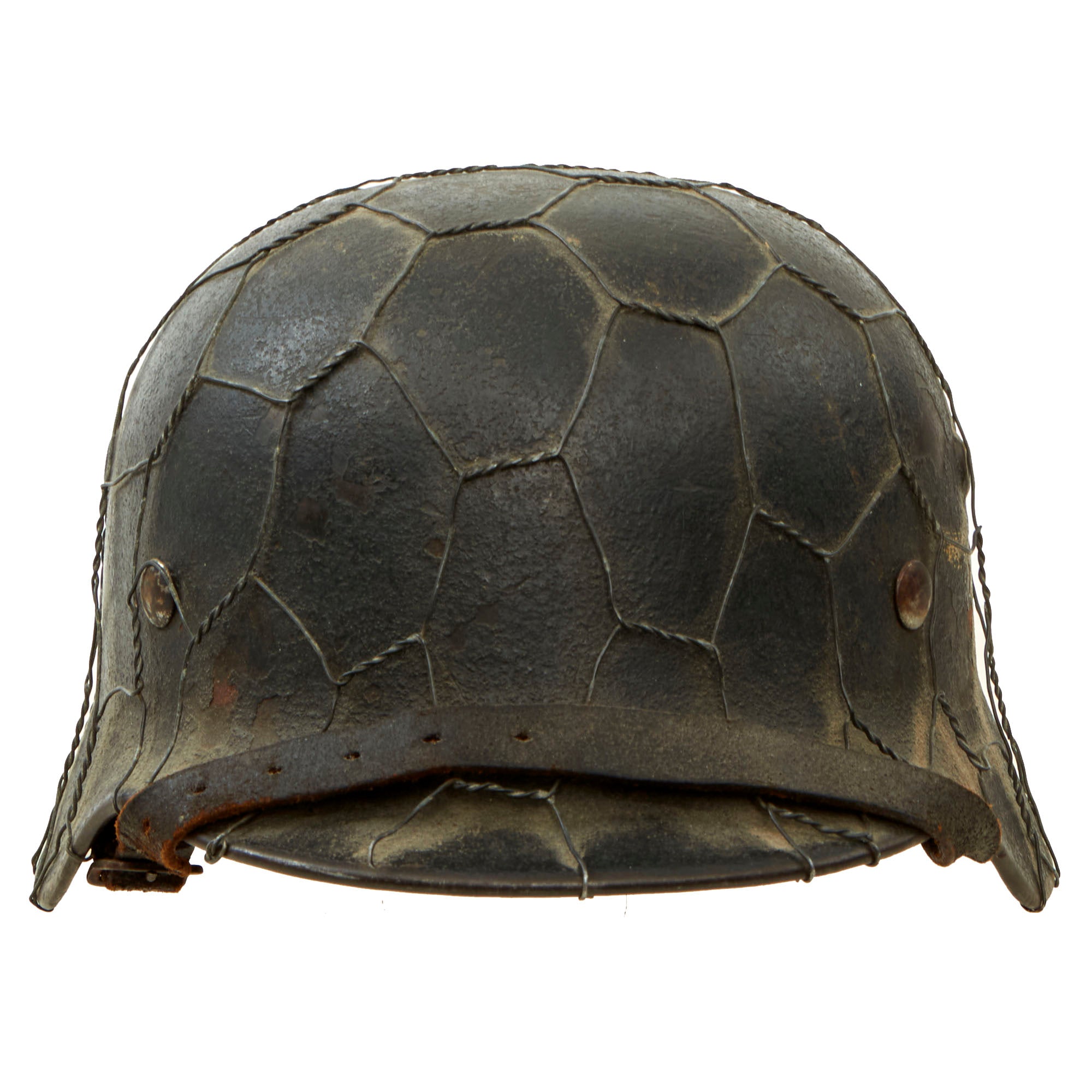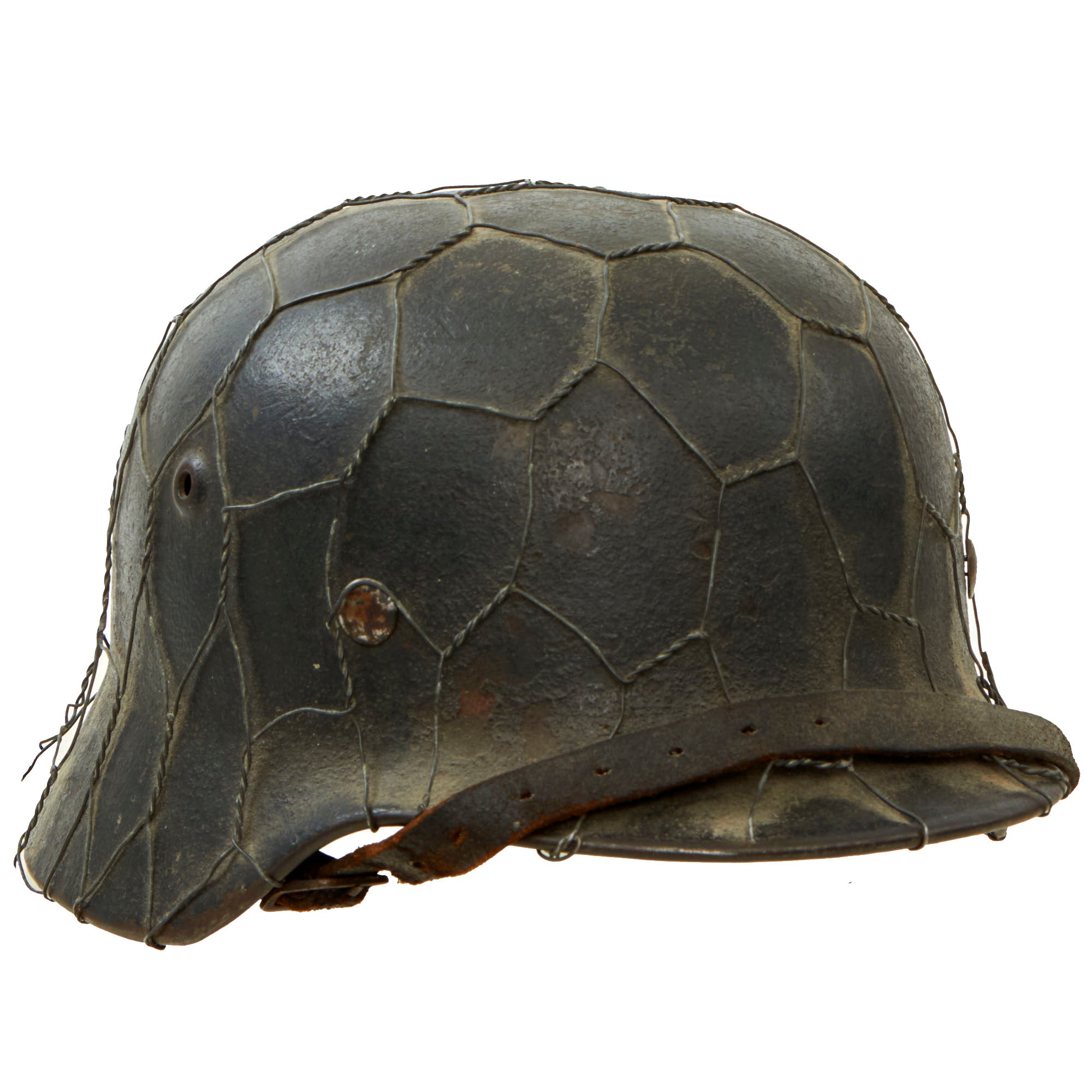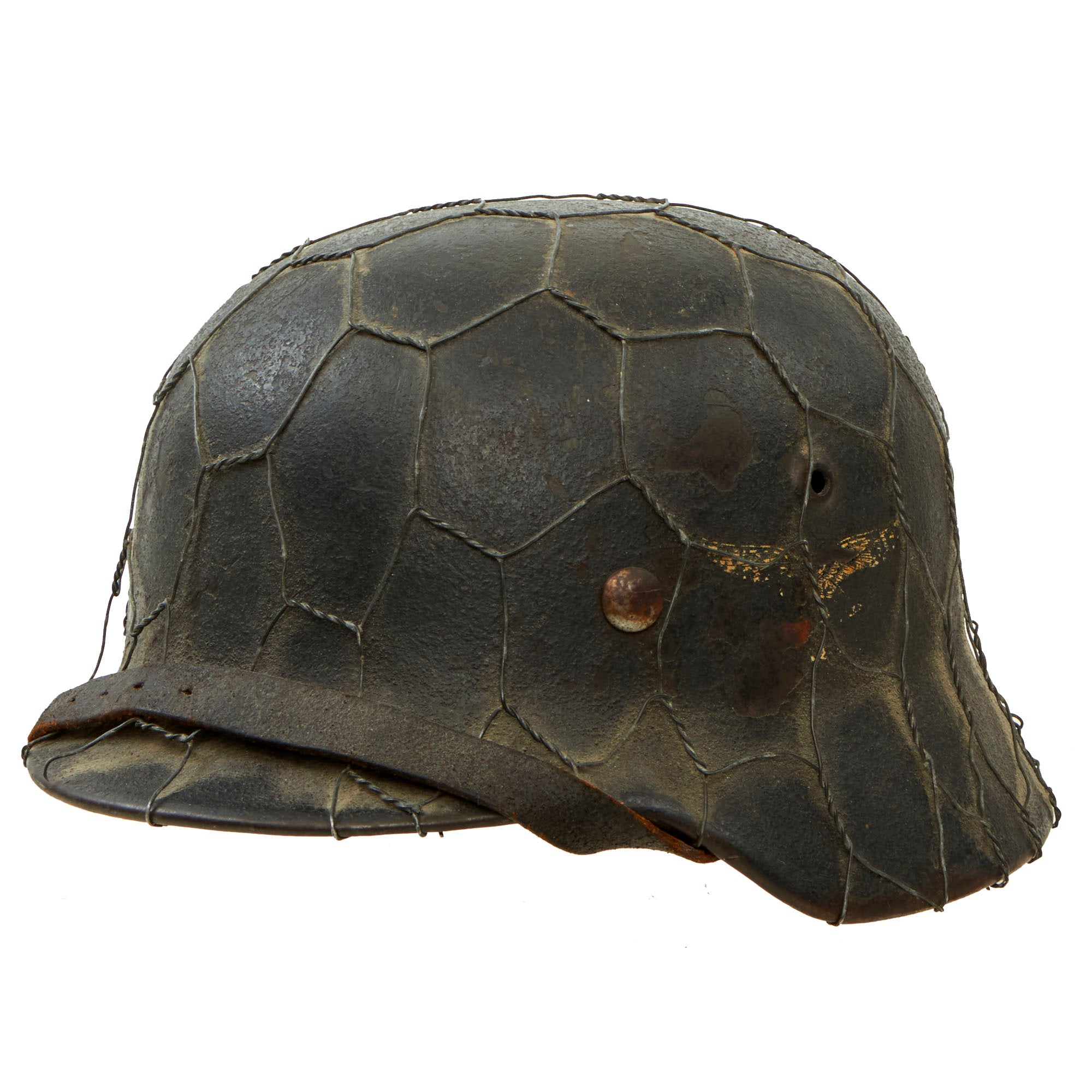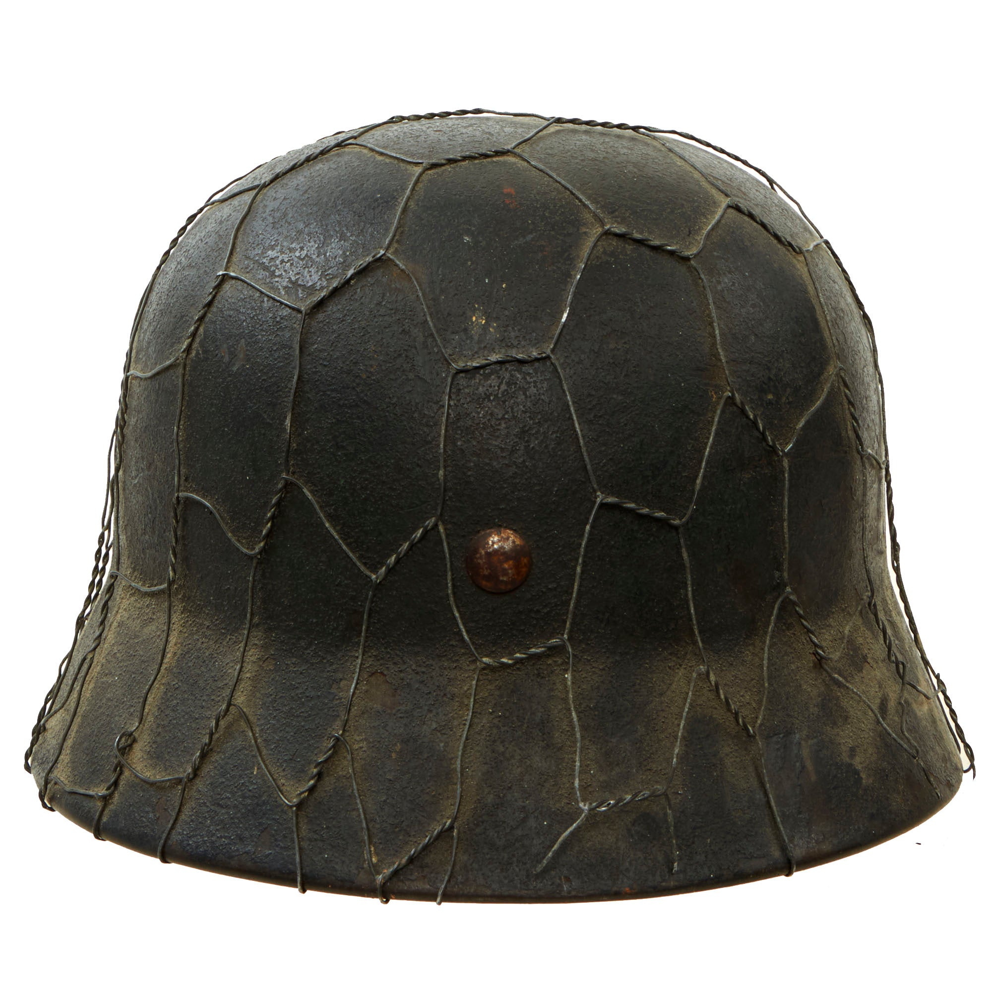 Original Item: Only One Available. This is a fantastic all original example Model 1940 German WWII helmet with a single Luftwaffe Eagle decal and a great original Chicken Wire Cover. The wire was used to easily attach foliage and other camouflage items from the area, and could easily be redecorated for a new season. This is the thicker style of wire used with wider openings, and we have had several experts examine the wire and confirm that it is the correct type of wire used during WWII. Unfortunately, as with all "chicken wire" helmets, it is virtually impossible to verify when exactly it was added to the helmet. However with the rust and patination on the wire as well as the helmet, we are fairly certain it was added during wartime.