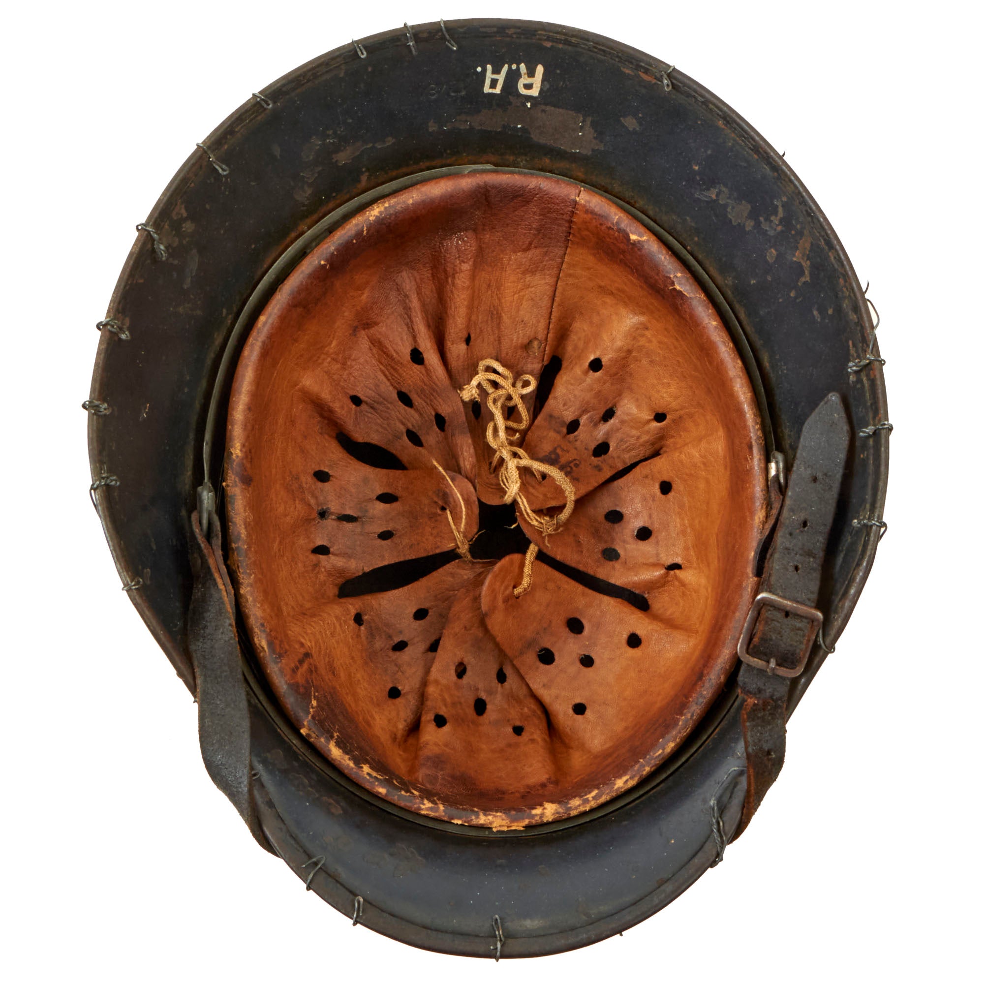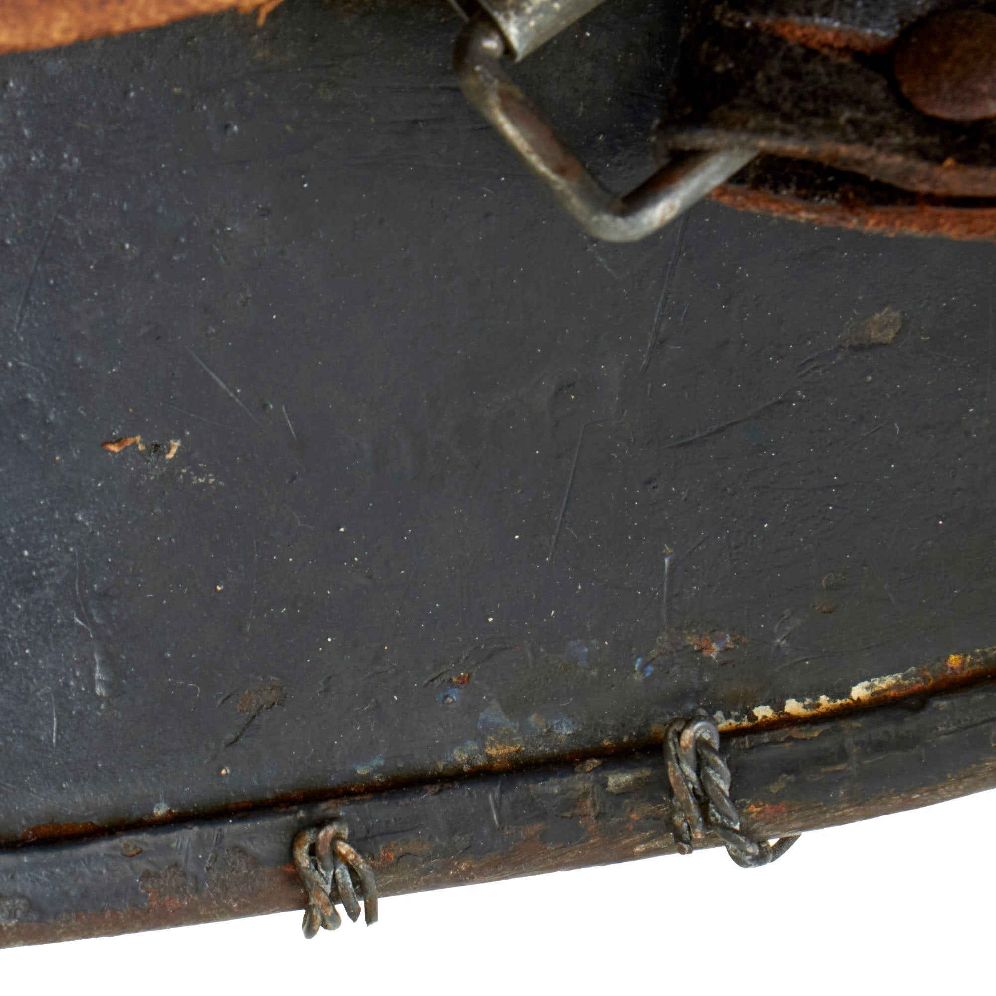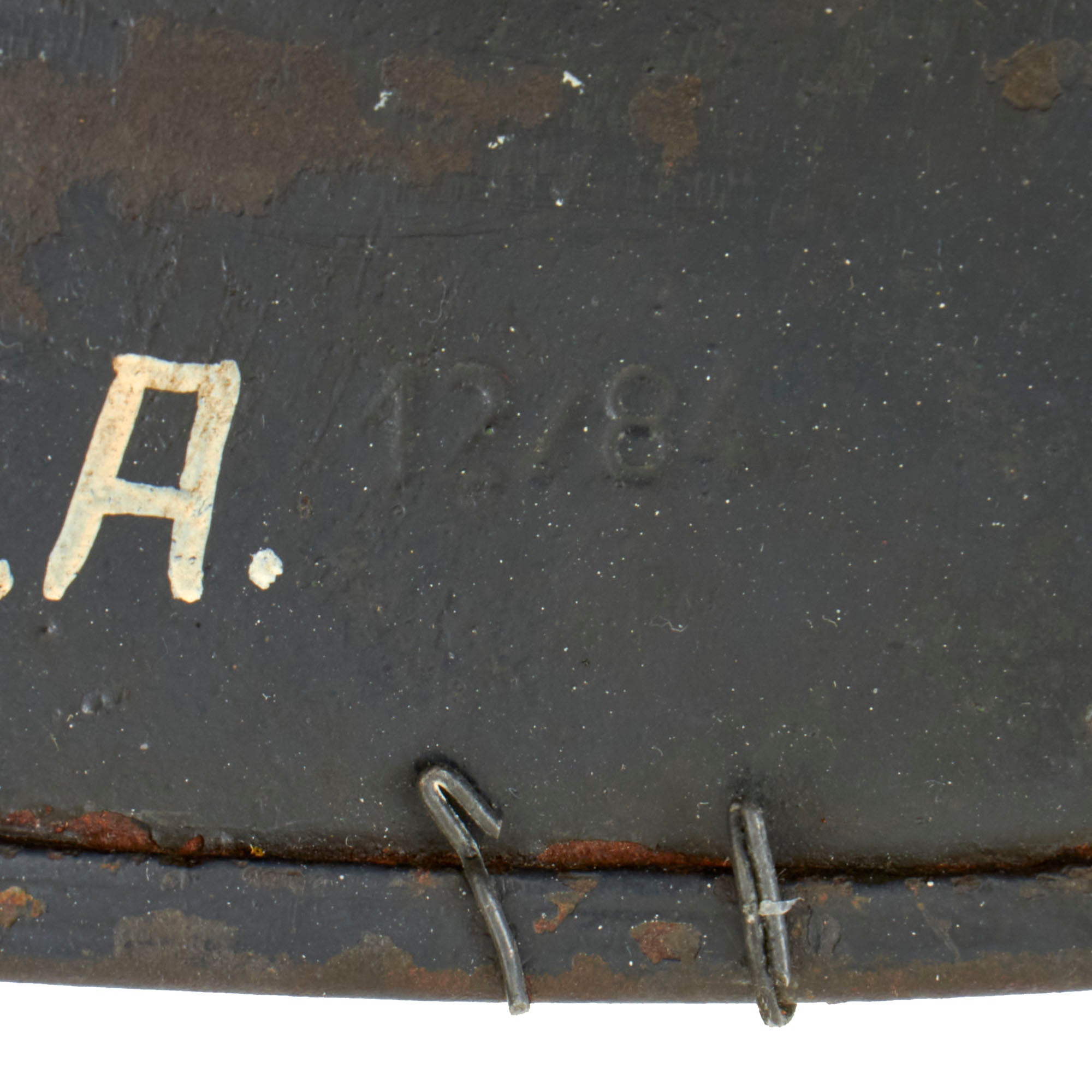 Above the left ear interior of the apron has a stamped manufacturer's code and size hkp64, indicating it was manufactured by Sächsische Emaillier und Stanzwerke A.G., Germany. It is also marked with lot number 12784 on the underside of the rear skirt. Towards the end of the war, the SE marking was discontinued in favor of three letter code "hkp", and later this was moved to the rear skirt. Size 64 is a nice smaller size that can accommodate liners from 56cm to 57cm or US 7 to 7 1/8. Size 64 shells are harder to find and are therefore more valuable to a collector. There are the initials R.A. on the rear skirt as well, and it looks like there was another name marking previously above this, but the paint was scratched off.