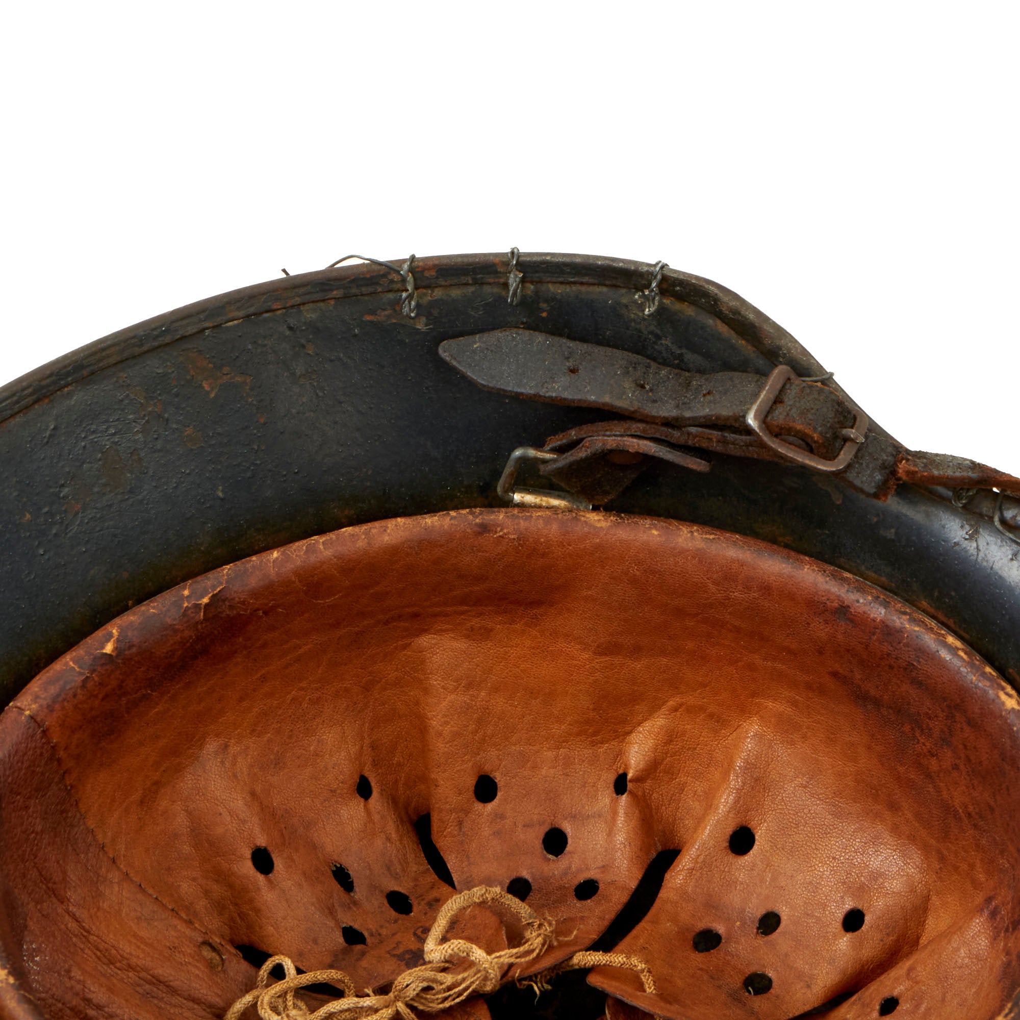 The helmet has a lovely "been there" look, and is fitted with a lovely 56cm M-31 liner, as well as a service worn original chin strap, which is in somewhat delicate condition. This stamped sheet steel construction helmet still retains much of the original lightly textured Luftwaffe Fliegerblau (flyer's blue) paint, which utilized aluminum oxide as a texturing agent. There is some scuffing and chipping to the paint, especially around the lower rim, which also shows wear from the chicken wire. The interior paint is a bit better retained, though there is still some chipping and oxidation. The original Luftwaffe eagle decal is present but definitely shows quite a bit of wear, and is only retained at about 40%. This is a great example that really looks the business!