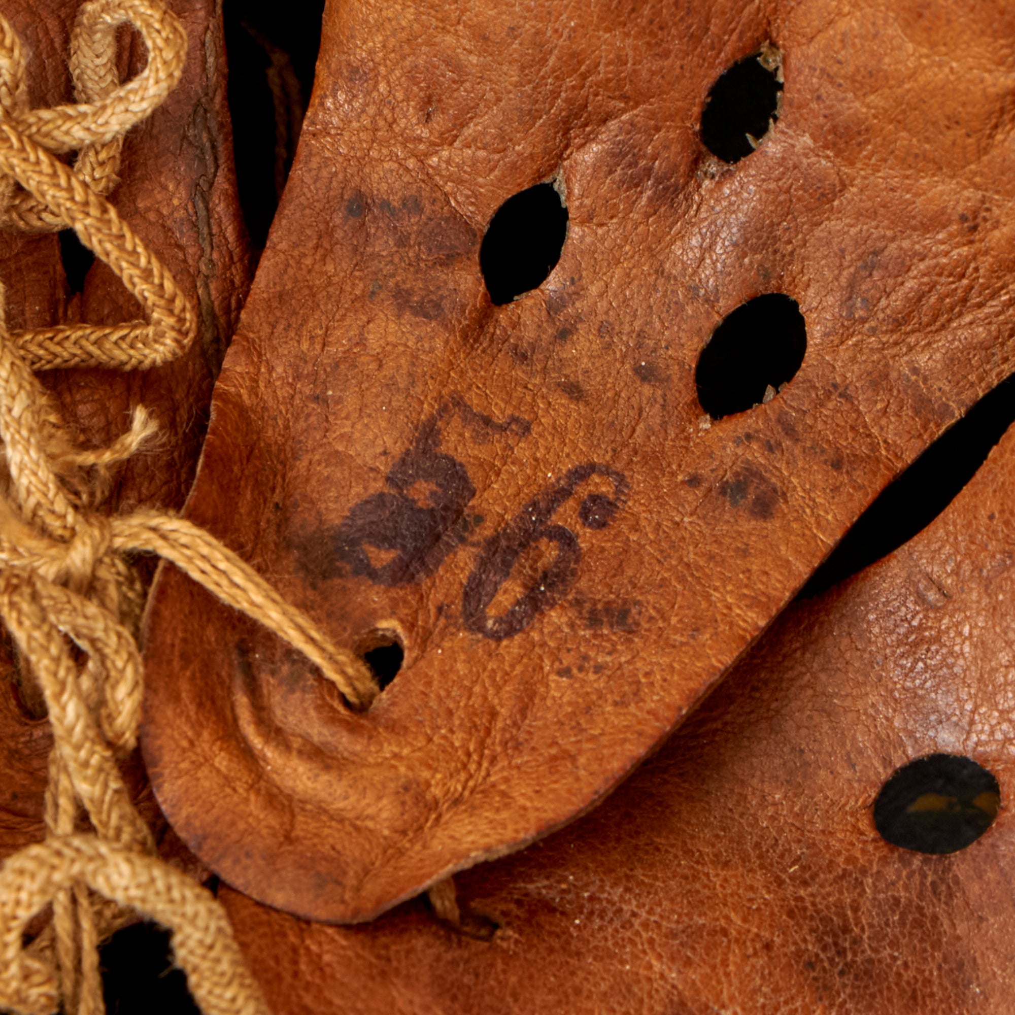 All three liner retaining pins are intact, however they look to be plated, which has oxidized and caused most of the paint to flake off all three. The interior of the helmet still has the original M31 leather liner, with all eight of the original fingers intact along with a worn original top tie. The leather is still soft and supple, and has a lovely light brown color, showing a bit of staining around the edge, and is marked with the size 56 on one of the fingers. The outer side of the galvanized steel liner band is marked 64 n.A / 56, indicating that it is a size 56 liner for a size 64 shell. The right side displays the full manufacture information, as well as a date: