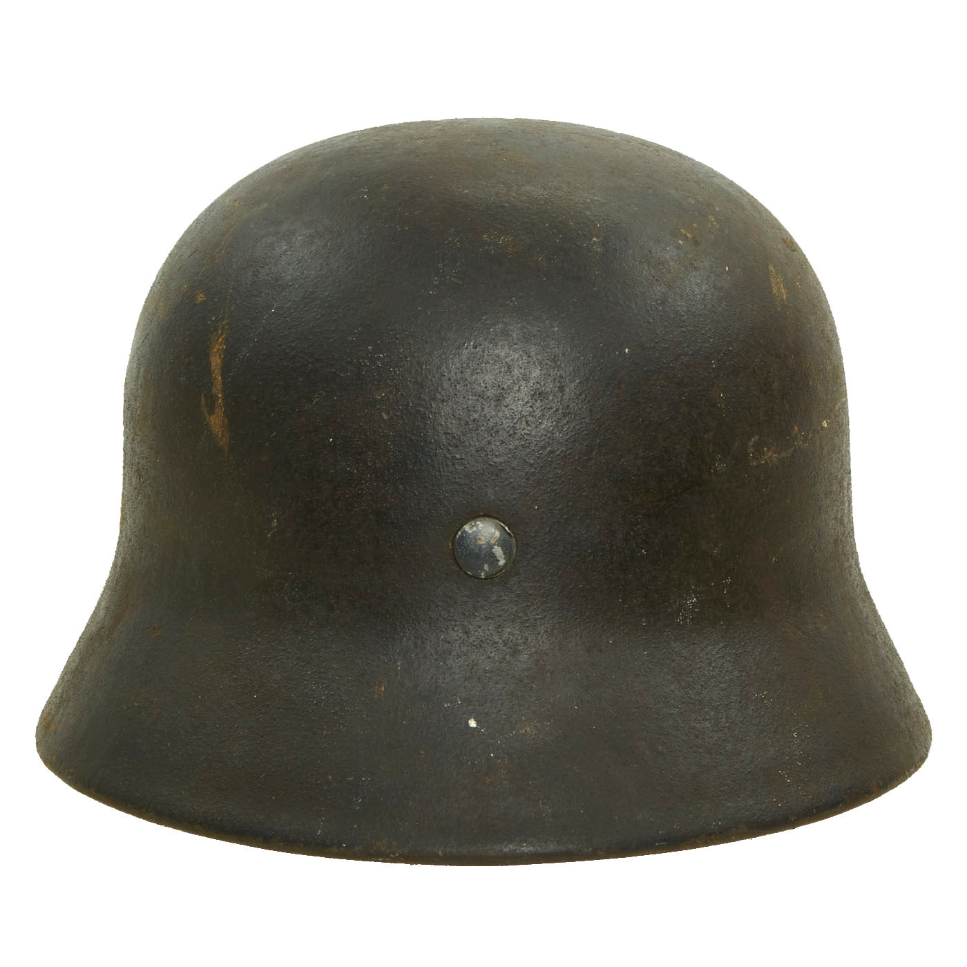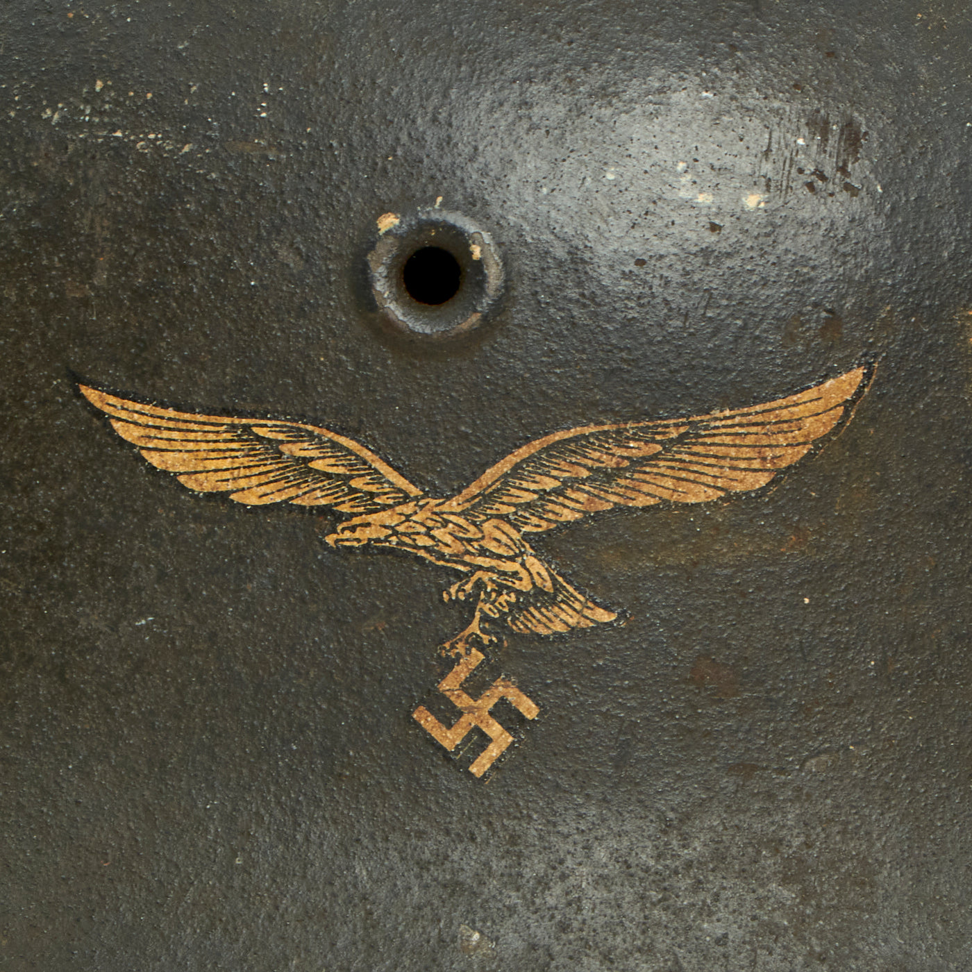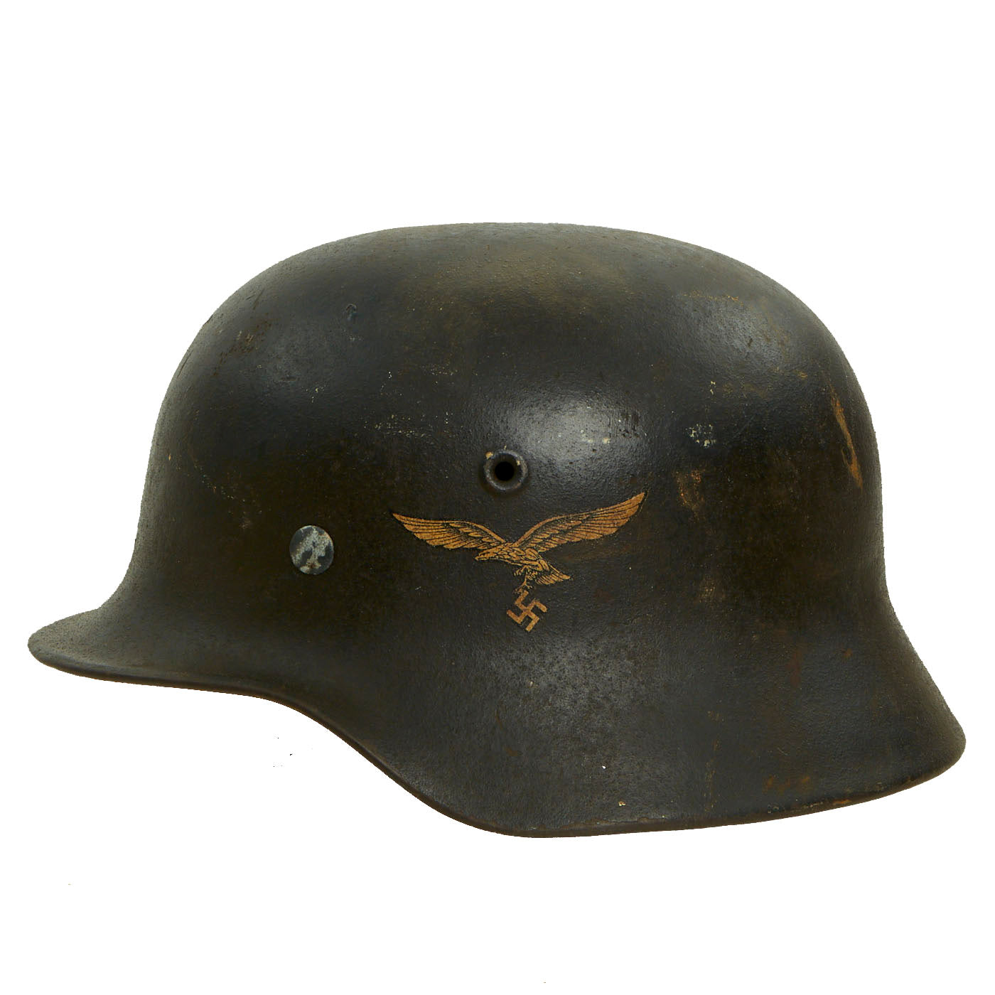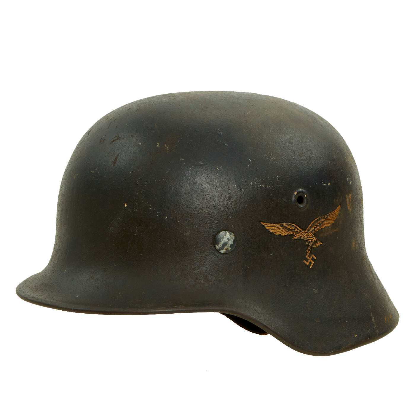Original Item: Only One Available. This is a very nice all original example Model 1940 German WWII helmet with a single Luftwaffe Eagle decal. This stamped sheet steel construction helmet retains almost all of the original lightly textured Luftwaffe Blue-Gray paint, with the expected wear from moderate service. It has a great lightly worn patina and look. The decal is still present and retained at almost 100%, having faded to a lovely beige color due to age and discoloration of the lacquer portion of the decal. Really a great looking helmet here!