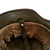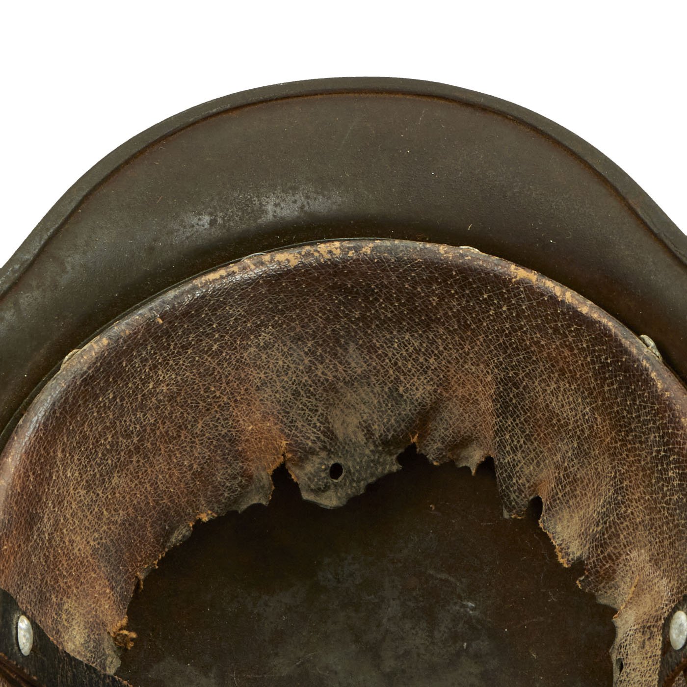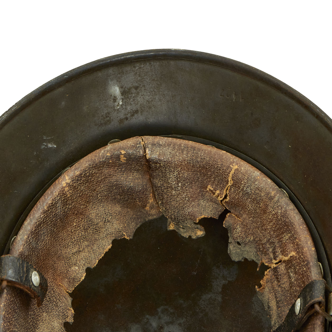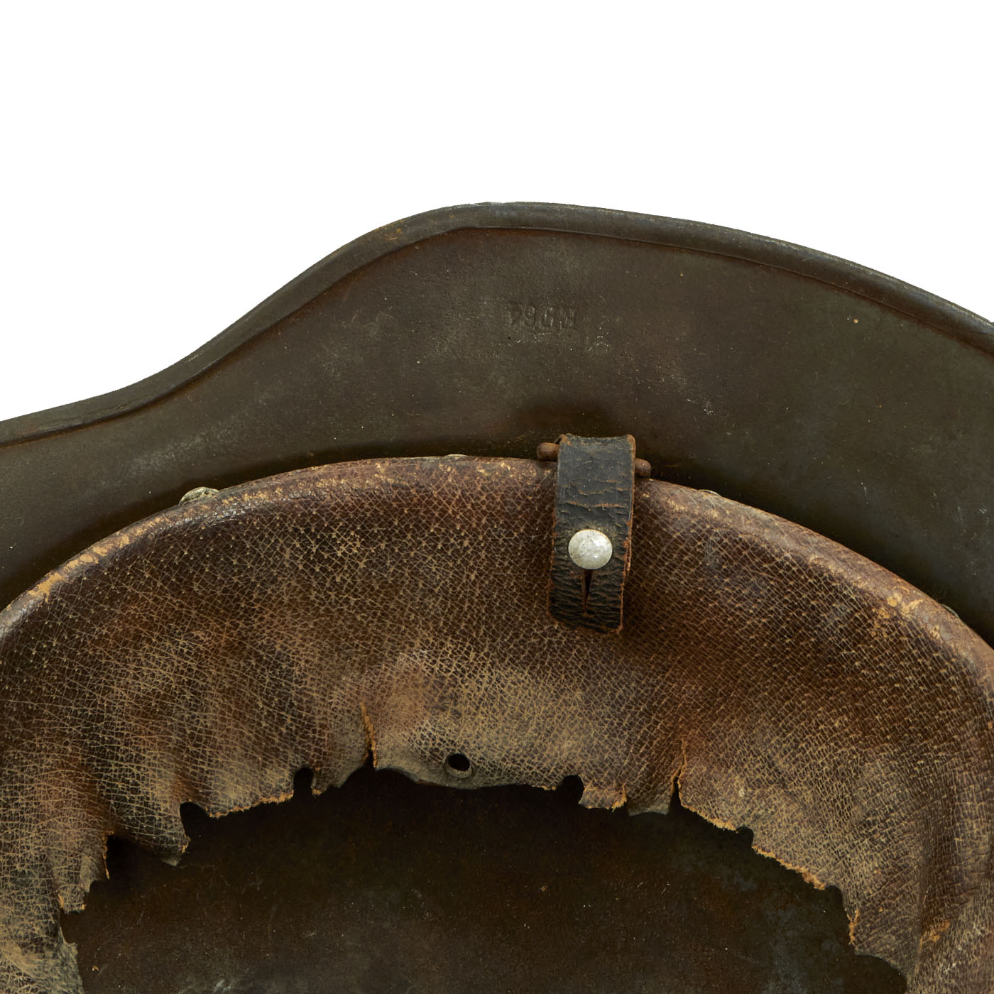 All three original liner retaining pins are intact and still retain some of the original paint. The interior of the helmet still has an original M31 leather liner, however the leather is quite worn, and the ends of all of the "fingers" have torn away, leaving just the 2-3 inch wide leather portion attached to the inner band. The outer side of the galvanized steel liner band over the left ear is marked 64 n.A / 57, indicating that this is a size 57 liner for a size 64 shell. The other side of the band has a round manufacturer marking, however it is too faint to read. There are also remnants of the original chin strap attached to the liner loops.