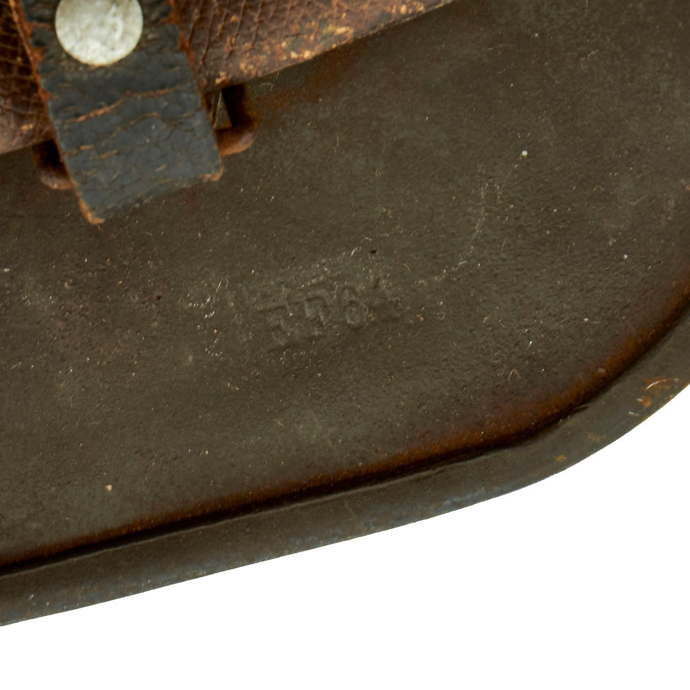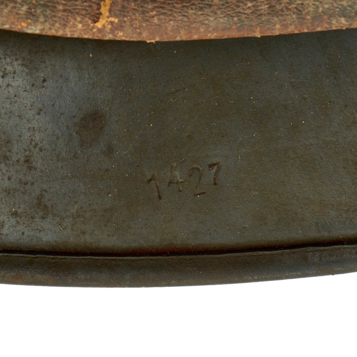 The reverse, interior, neck guard apron is batch number stamped 1427, and the interior, left side, apron has a stamped manufacturer's code and size, EF 64 indicating that indicating it was manufactured by Emaillierwerke AG, of Fulda Germany in size 64. Size 64 is a nice medium size that can accommodate liners from 56cm to 57cm or US 7 to 7 1/8. Size 64 shells are harder to find and are therefore more valuable to a collector.