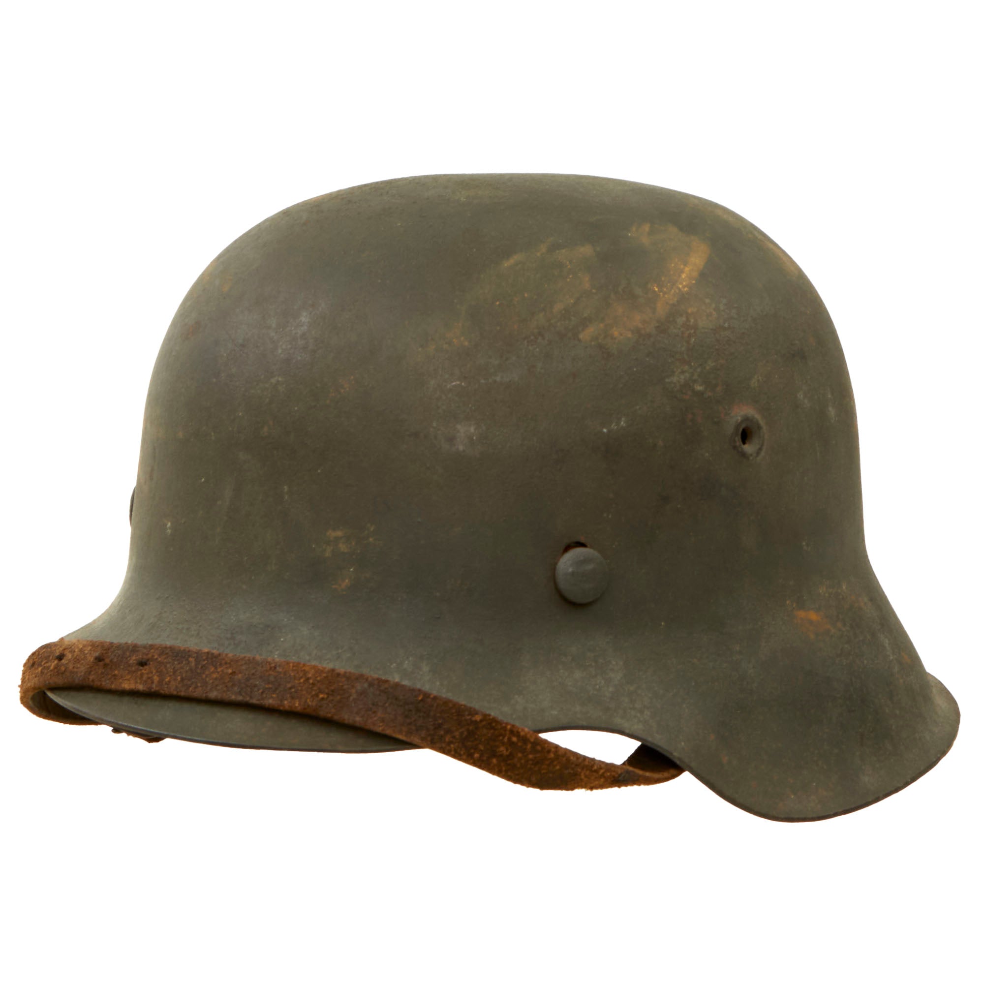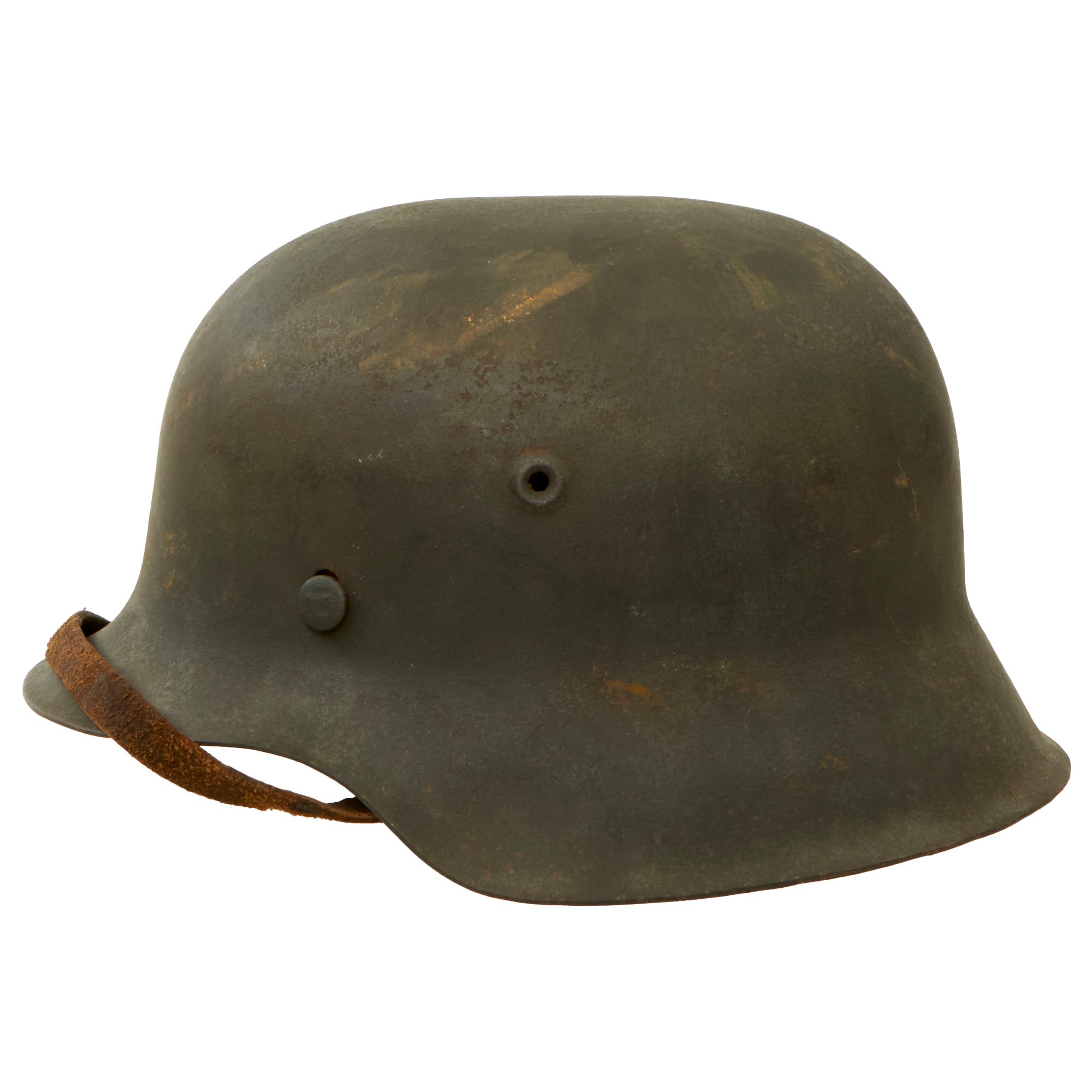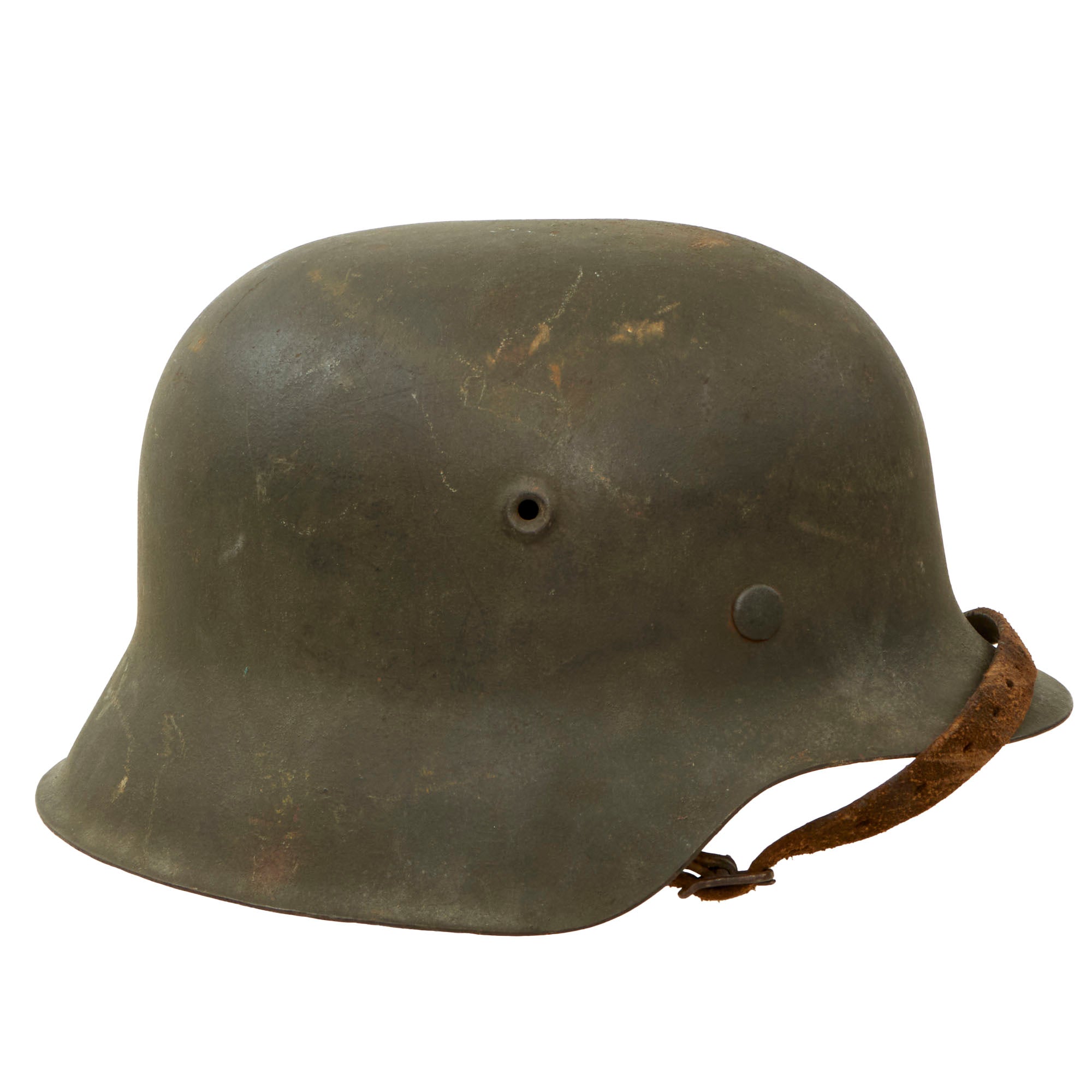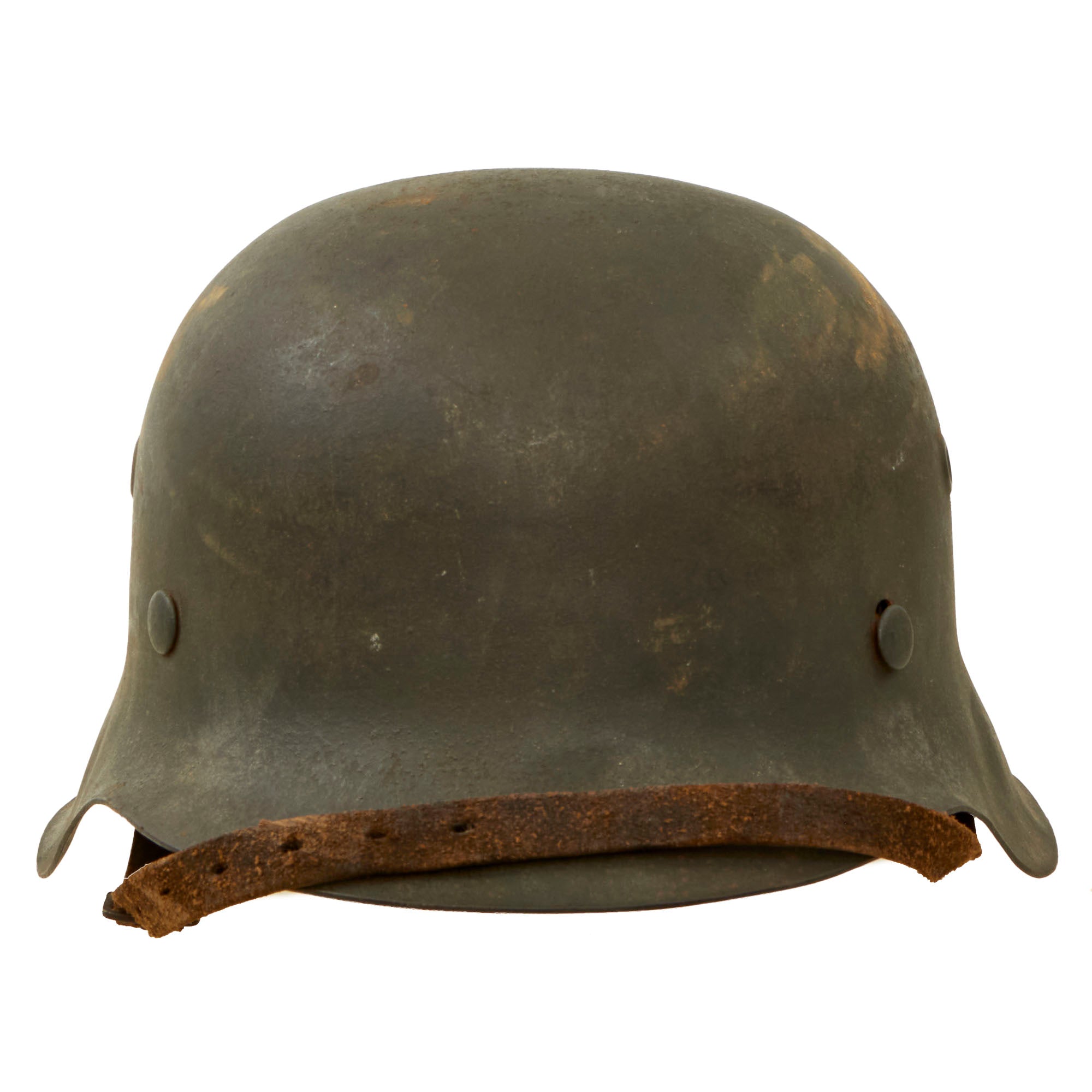 Original Item: Only One Available. This is a lovely all original example of a German Model 42 Steel helmet, as issued to the Wehrmacht Heer (army). This stamped sheet steel construction helmet retains much of the original panzergrau (armored gray) paint, which is lightly textured due to the use of aluminum oxide. It shows some wear and scratches, particularly at the top, but we do not see any major areas of missing paint or oxidation. We do however see irregularities in the surface on the inside and outside from the original steel. There is no decal affixed to the shell, as late in the war they were often omitted due to supply and time constraints, especially late in the war. This helmet looks to have seen light to moderate use during the war, and was well cared for.