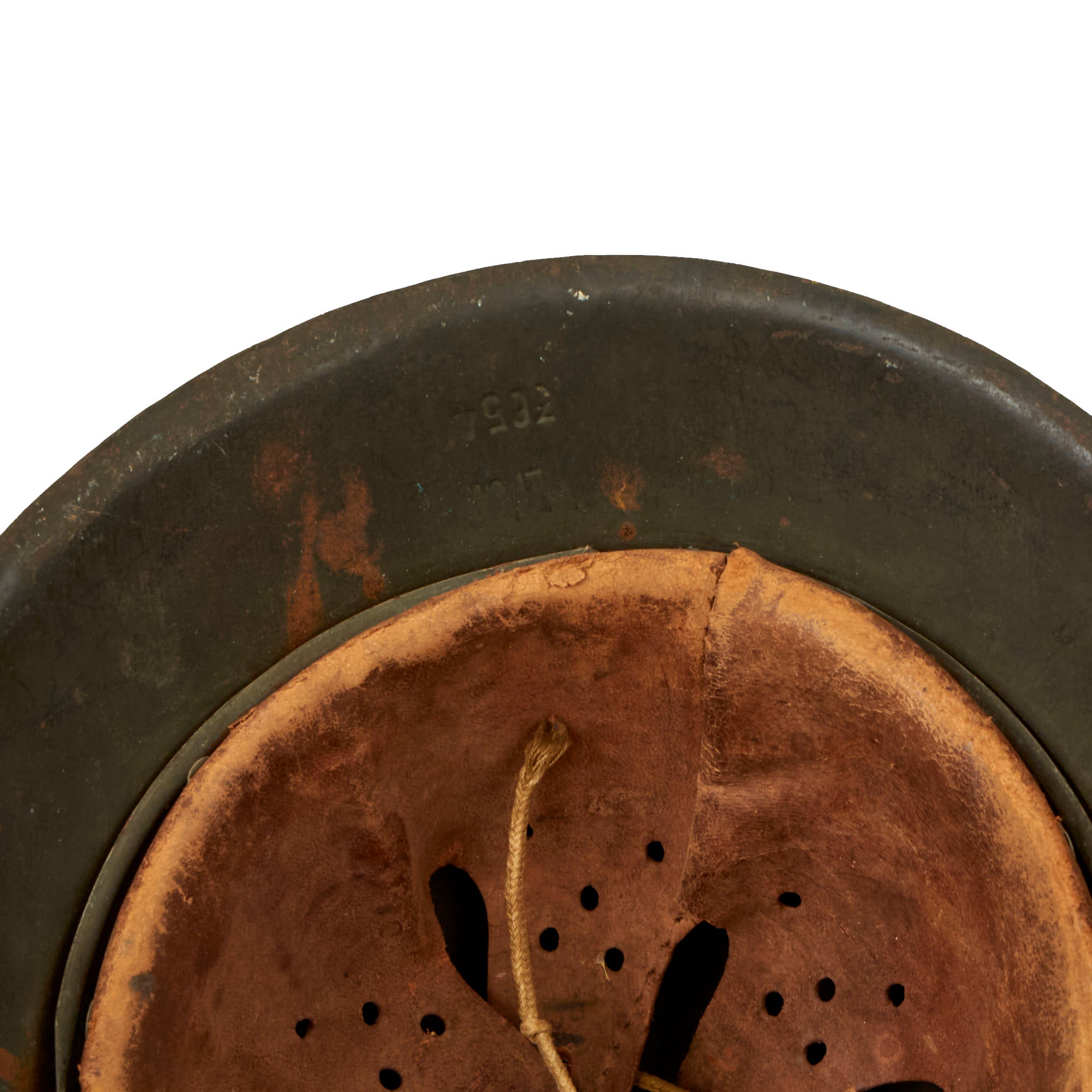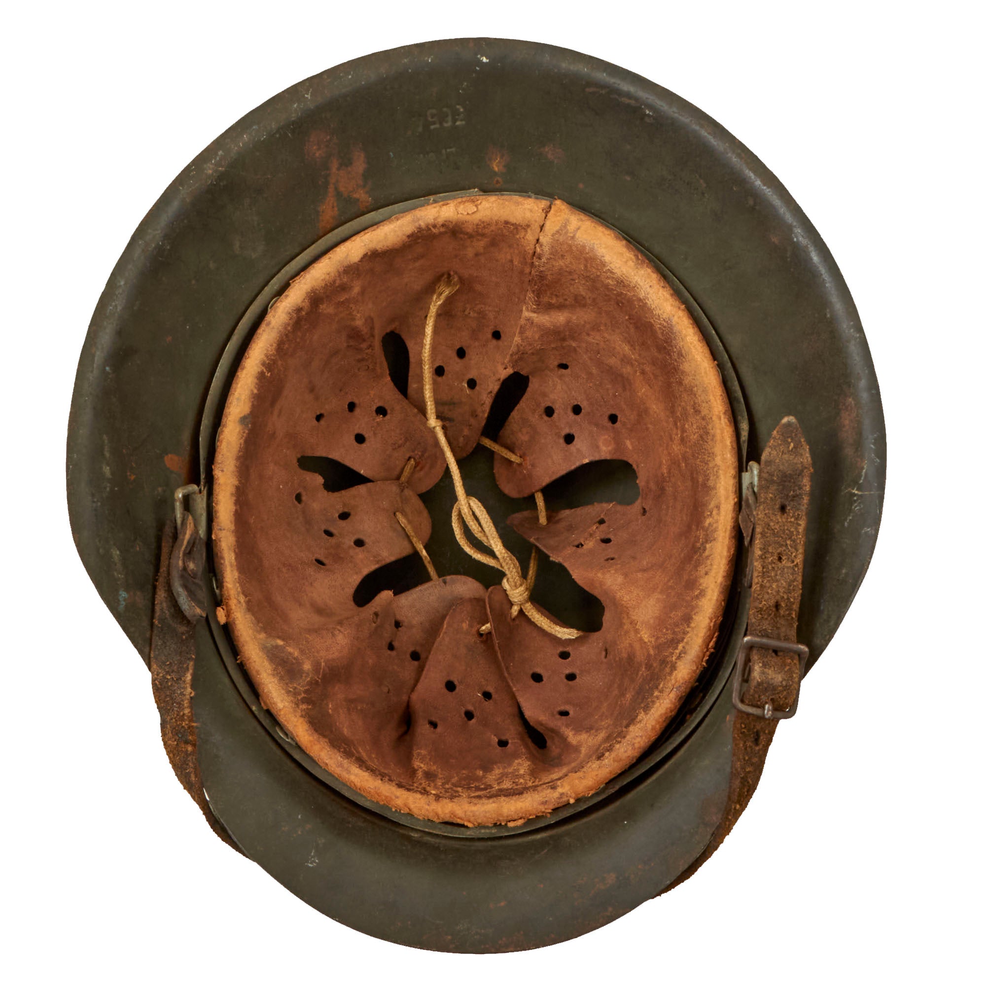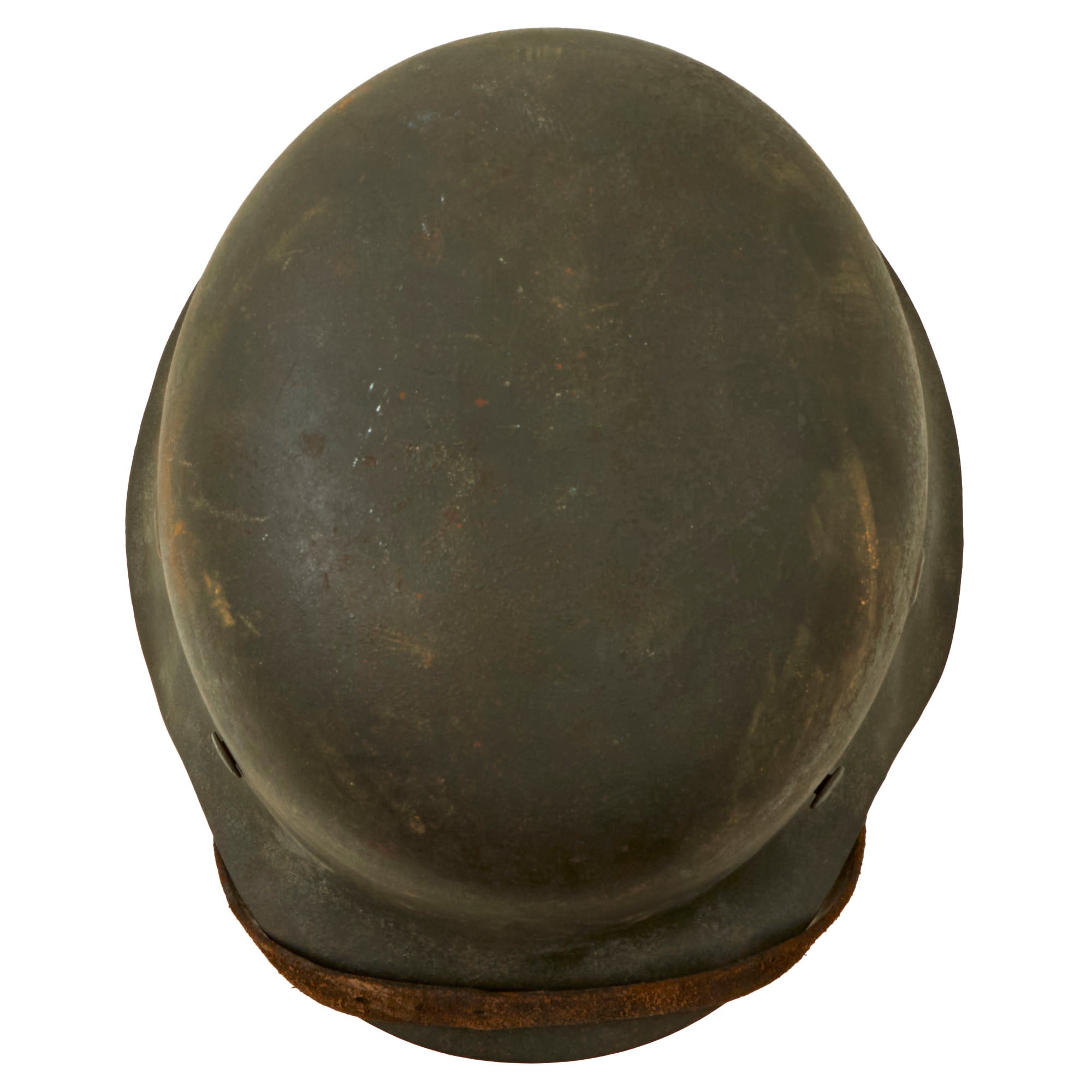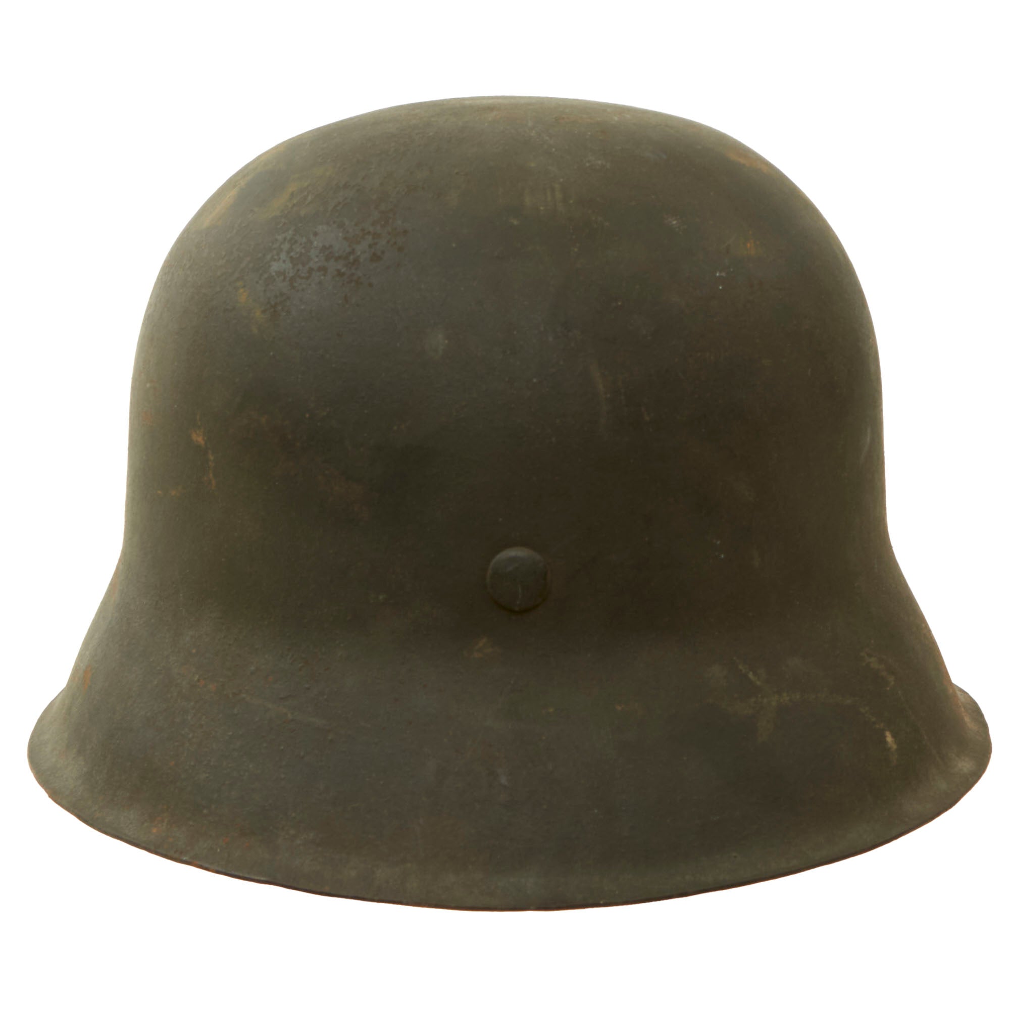 Original Item: Only One Available. This is a lovely all original example of a German Model 42 Steel helmet, as issued to the Wehrmacht Heer (army). This stamped sheet steel construction helmet retains much of the original panzergrau (armored gray) paint, which is lightly textured due to the use of aluminum oxide. It shows some wear and scratches, particularly at the top, but we do not see any major areas of missing paint or oxidation. We do however see irregularities in the surface on the inside and outside from the original steel. There is no decal affixed to the shell, as late in the war they were often omitted due to supply and time constraints, especially late in the war. This helmet looks to have seen light to moderate use during the war, and was well cared for.