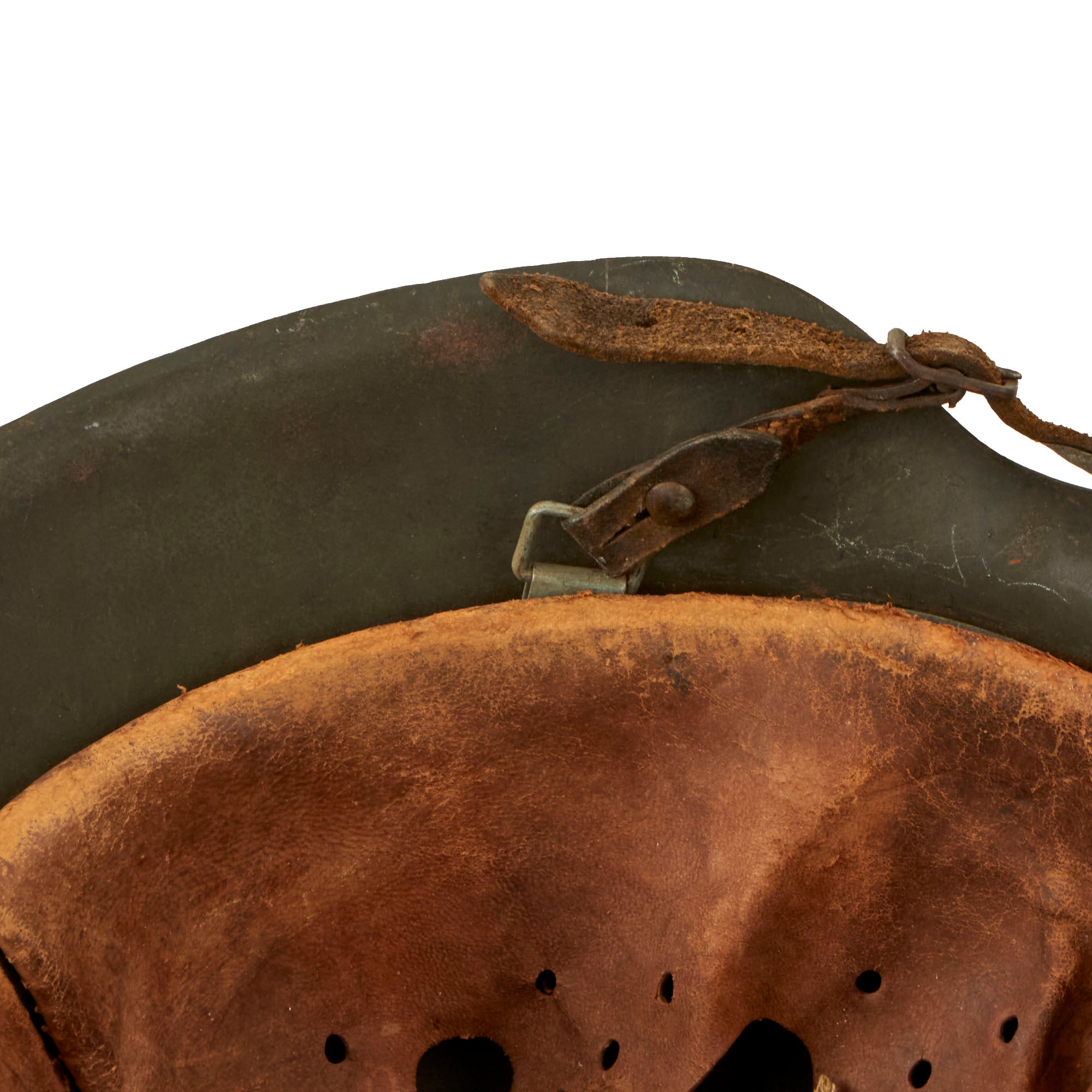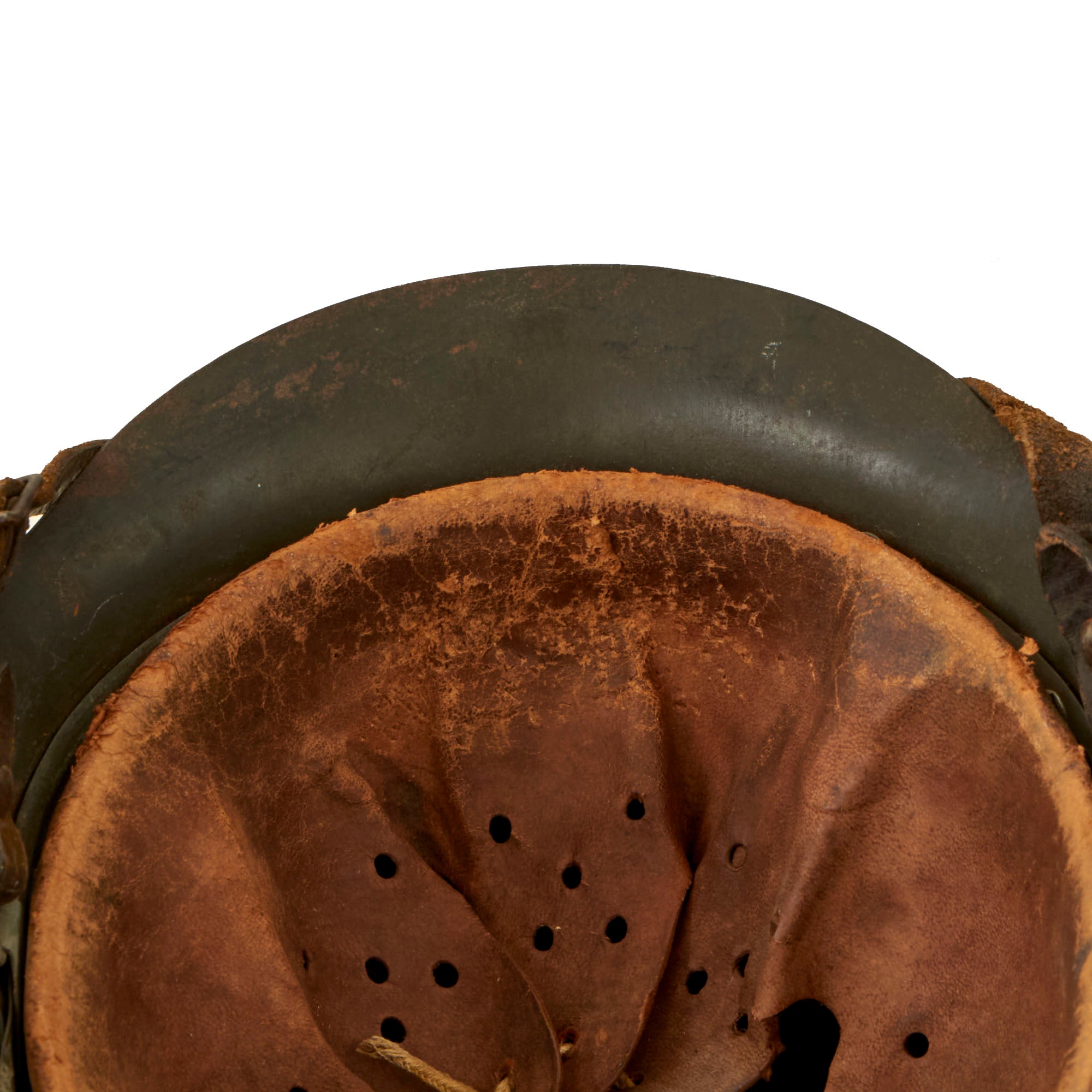 The helmet still retains an original complete chinstrap, with the correct steel buckle and attachment studs. The leather is a bit stretched out and also now a bit stiff, however all 13 adjustment holes are still present on the longer portion, and the buckle is functional as well.