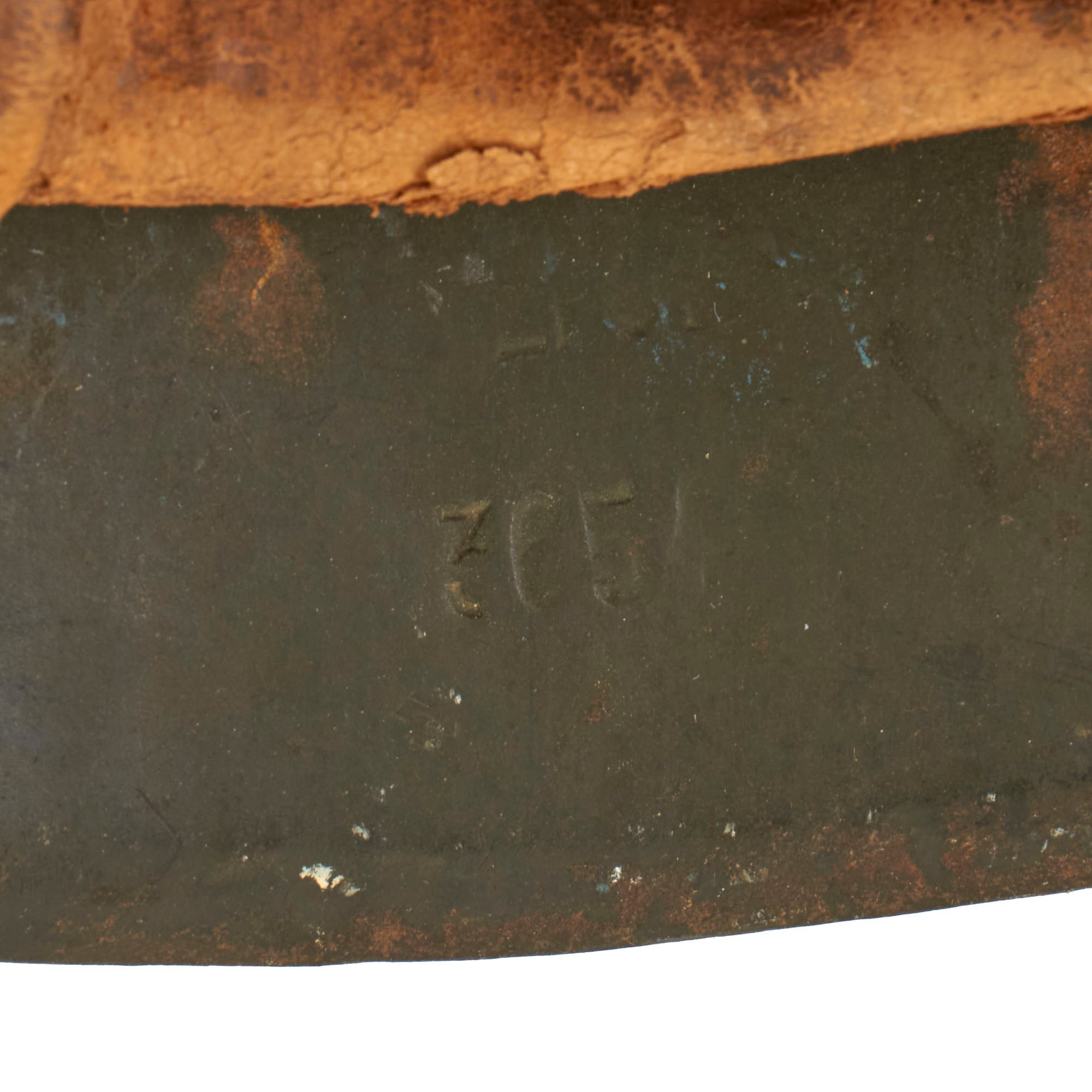On the under side of the rear skirt, the shell has a stamped manufacturer's code and size EF64 over heat lot 3654, indicating it was manufactured by Emaillierwerke AG, of Fulda, Germany. Later in the war, all markings were moved to the rear of the shell, shortly before the change to 3 letter codes by other makers, however Emaillierwerke AG stopped using "EF". Size 64 is a nice medium size that can accommodate liners from 56cm to 57cm or US 7 to 7 1/8. Size 64 shells are harder to find and are therefore more valuable to a collector.