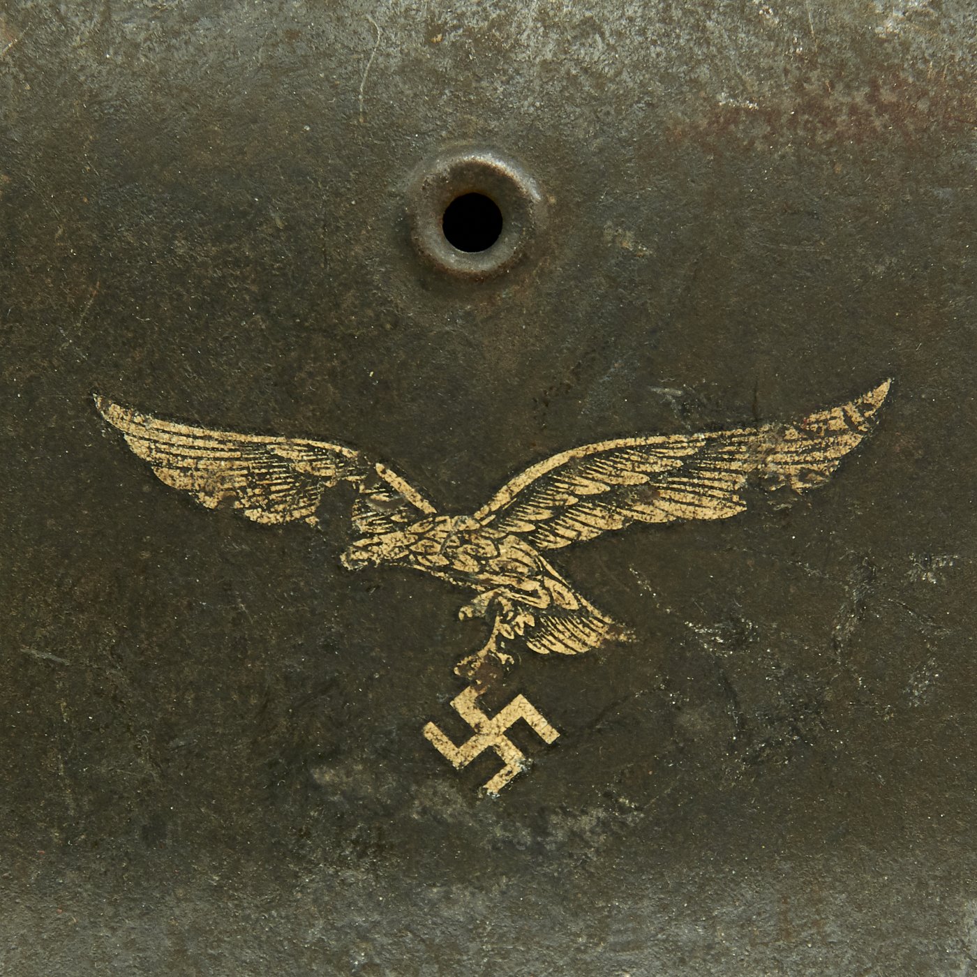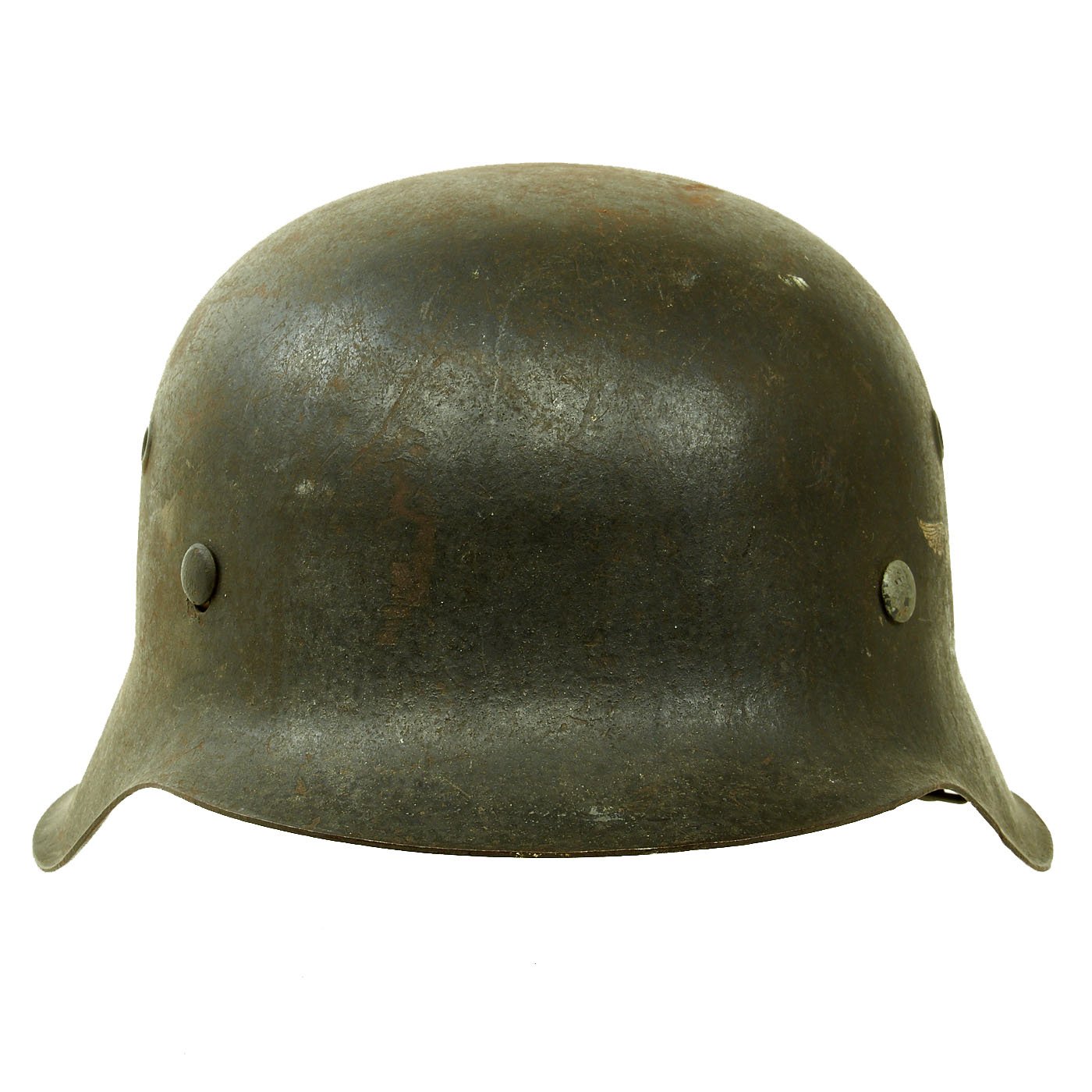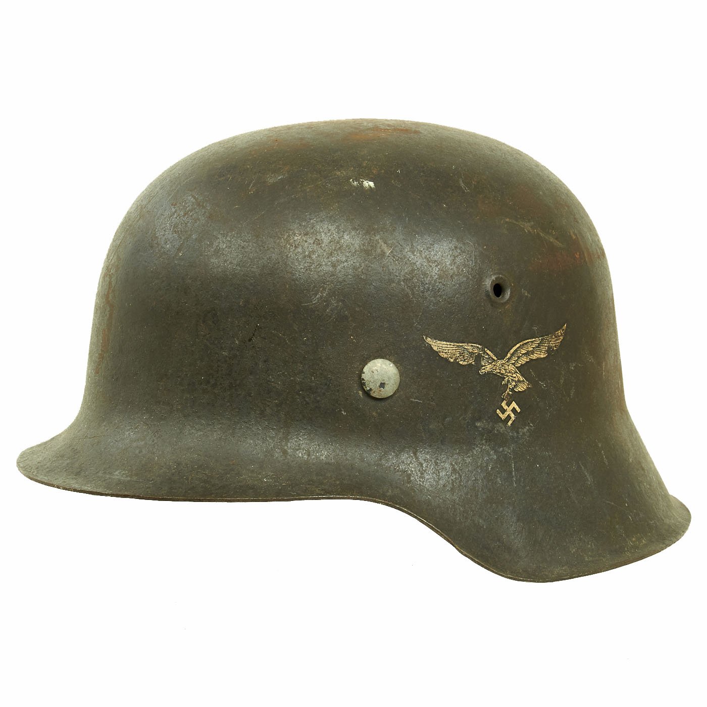 Original Item: Only One Available. This is a very nice all original example Model 1942 German WWII helmet with a single Luftwaffe Eagle decal. This stamped sheet steel construction helmet retains about 75% of the original Luftwaffe Blue-Gray paint, and shows some wear, particularly on the crown. This was definitely a helmet that saw use during the war, with a lovely patina of age. The decal is retained at around the same amount, with some areas chipped away, and overall age degradation. If you were looking for a nice lightly service worn helmet for your collection, this is it!