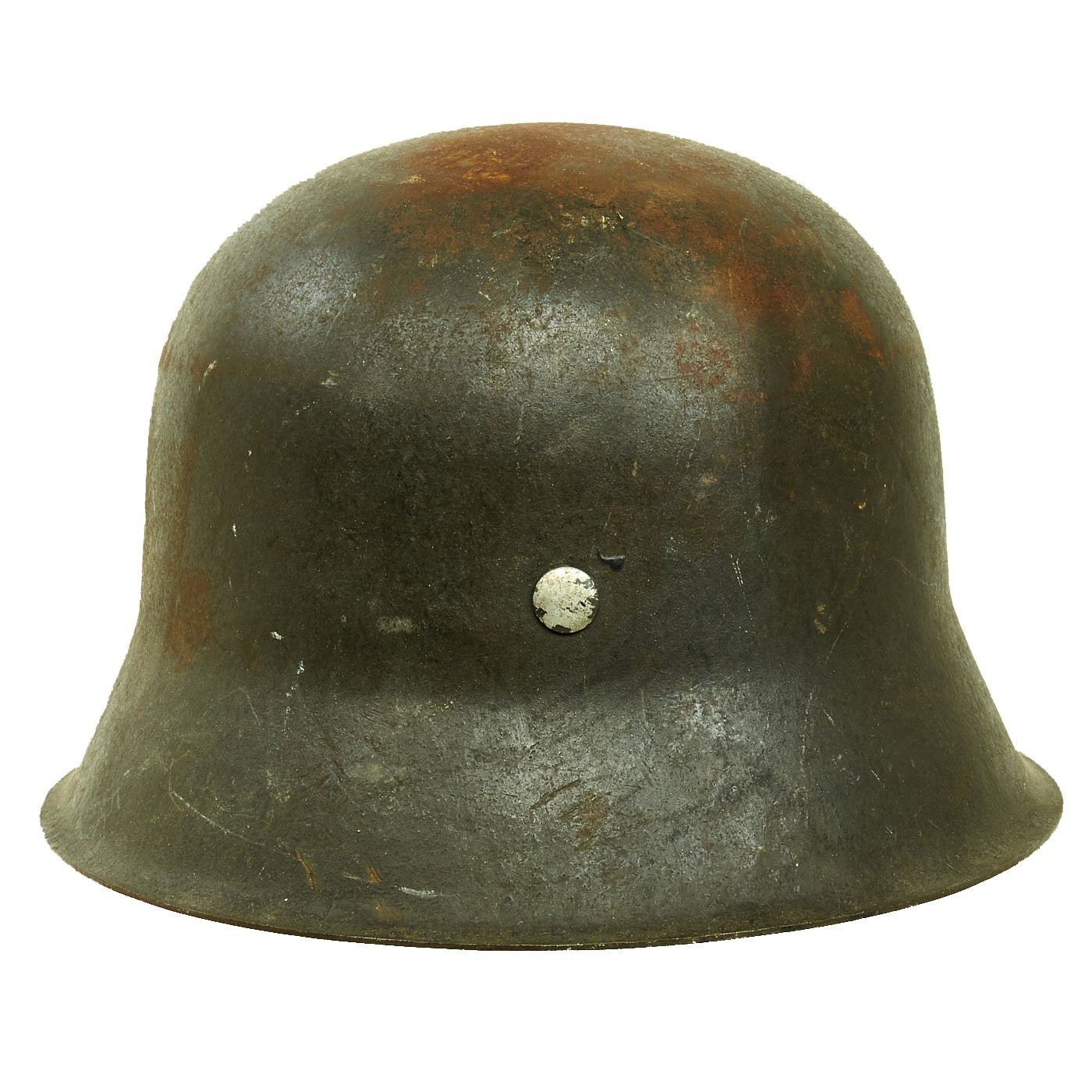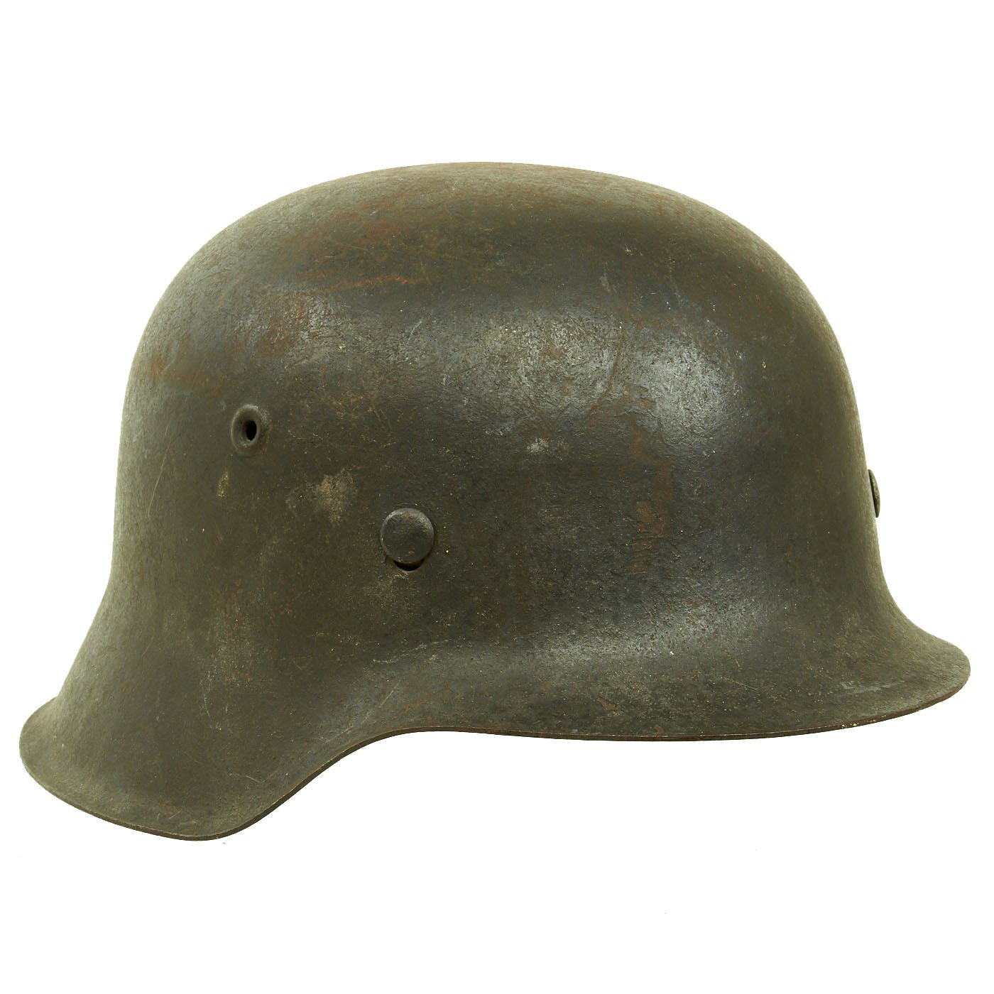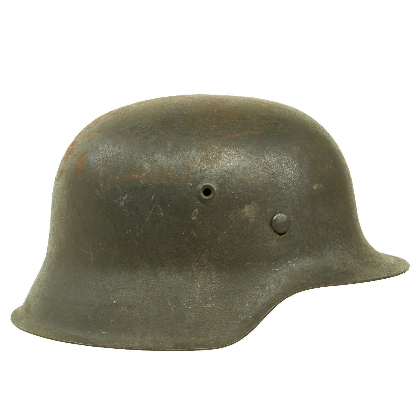 Original Item: Only One Available. This is a very nice all original example Model 1942 German WWII helmet with a single Luftwaffe Eagle decal. This stamped sheet steel construction helmet retains about 75% of the original Luftwaffe Blue-Gray paint, and shows some wear, particularly on the crown. This was definitely a helmet that saw use during the war, with a lovely patina of age. The decal is retained at around the same amount, with some areas chipped away, and overall age degradation. If you were looking for a nice lightly service worn helmet for your collection, this is it!