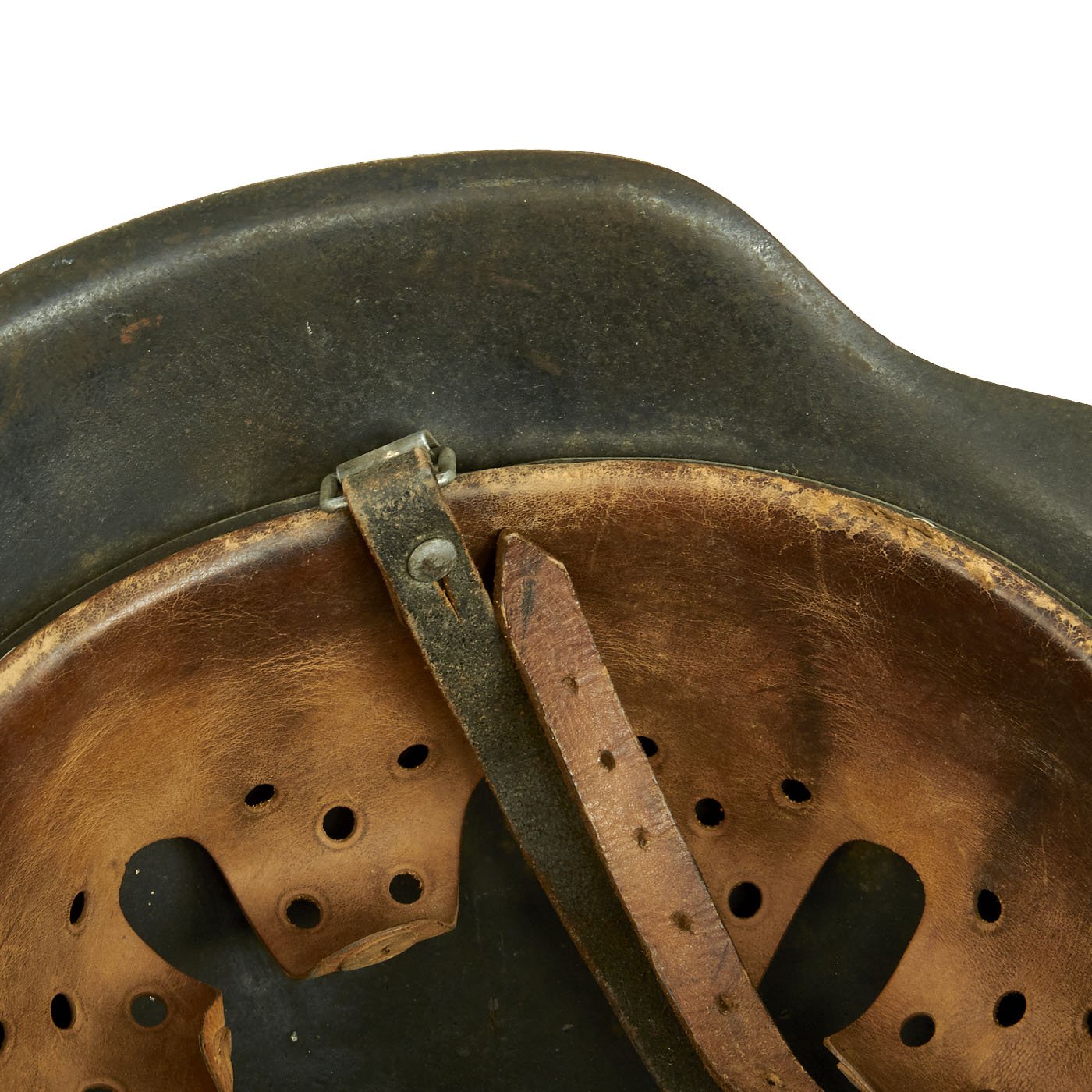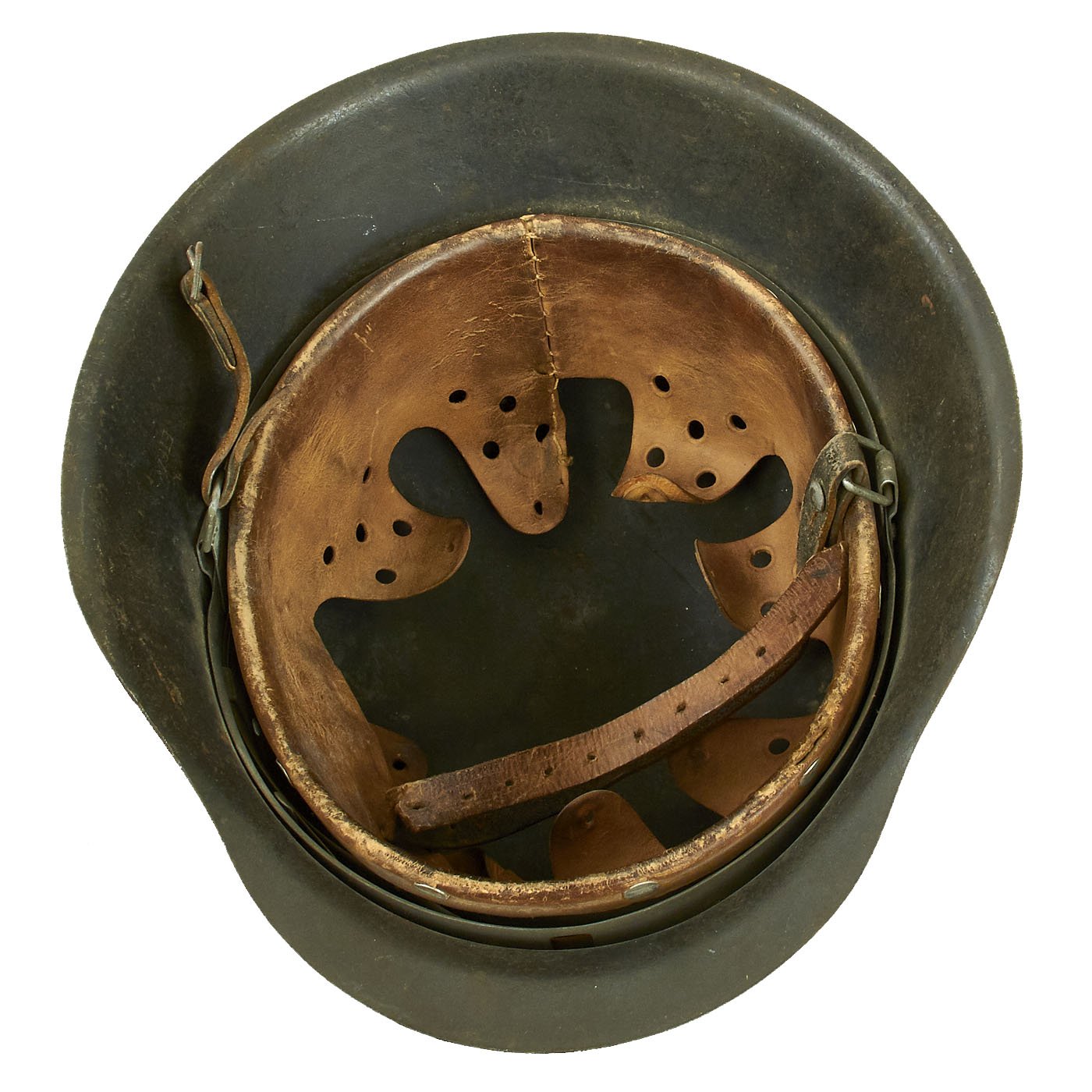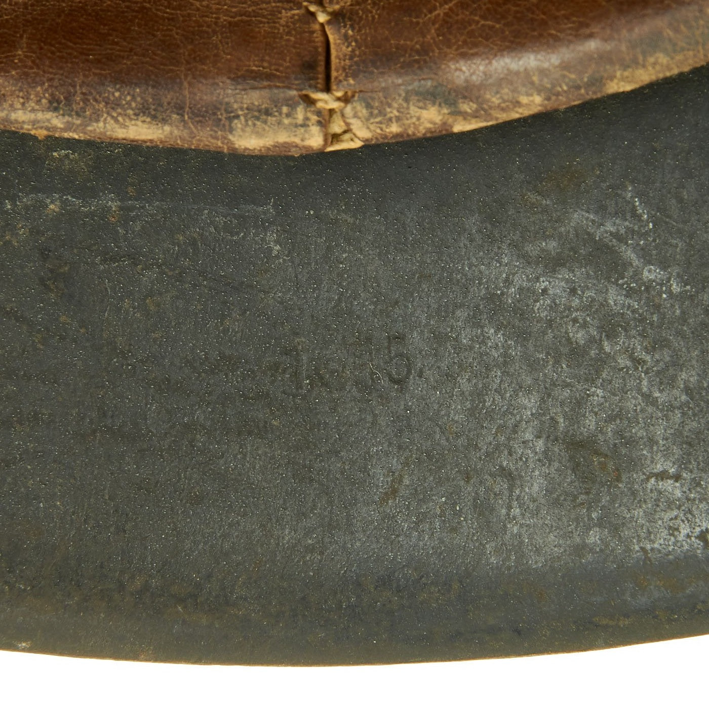 All three liner retaining pins are intact, though only one still has the original paint, while the others have it almost completely removed. The interior of the helmet still has the original M31 leather liner, which shows moderate wear. All 8 of the leather "fingers" are present, though the top tie is missing. The mid war issue galvanized steel liner band is marked on the left outer side with 64 nA / 56, indicating that the liner is a size 56, intended for a 64 shell. The right side displays the full manufacture information, as well as a date: