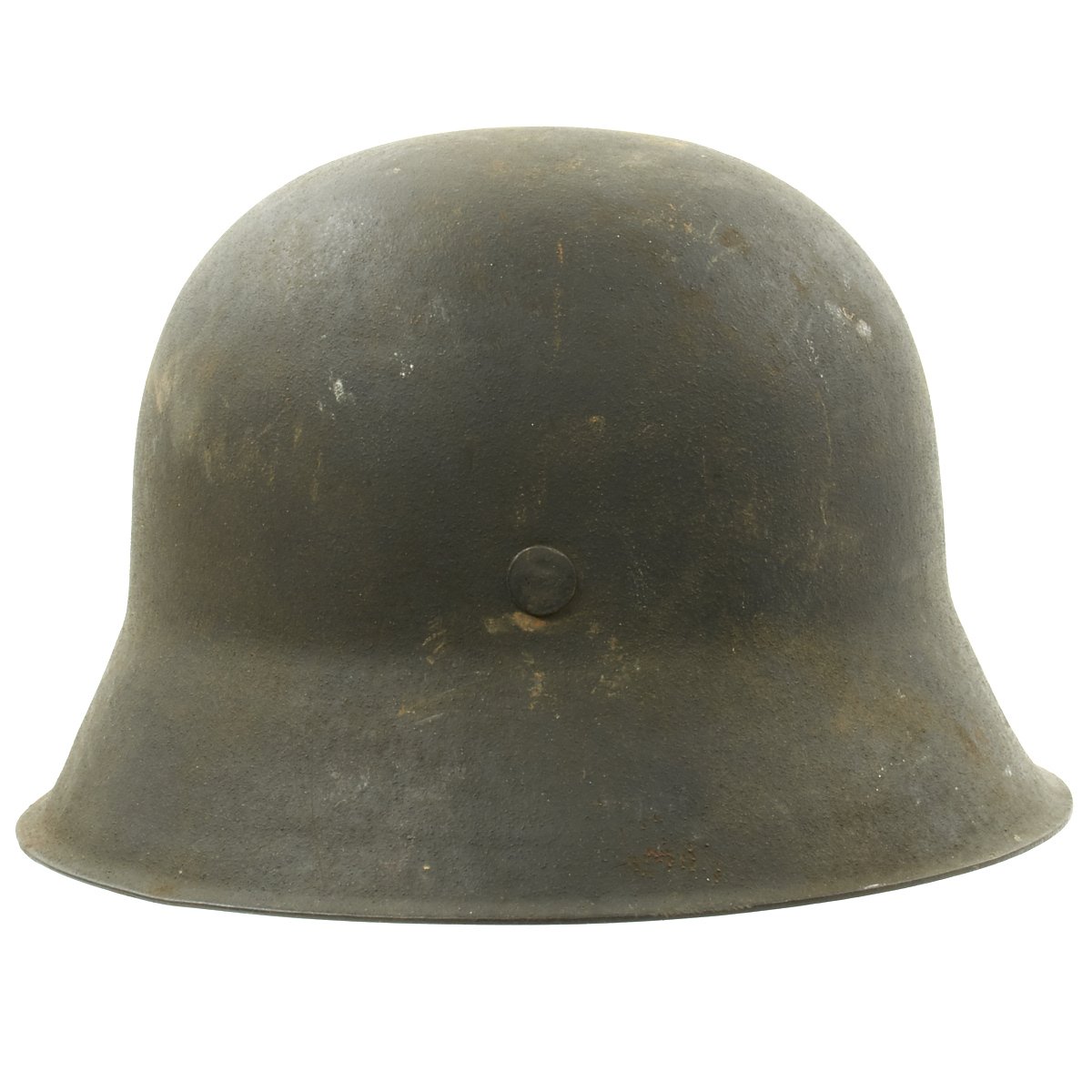 Original Item: Only One Available. This is an excellent all original example Model 1942 German WW2 helmet with a single Luftwaffe Eagle decal. This stamped sheet steel construction helmet retains over 95% of the original blue/grey textured Luftwaffe paint and is in excellent condition overall. The decal is retained at 95%, with some small areas that have flaked off. This is a very good example of this type of helmet, and even has an intact ink Dome Stamp!