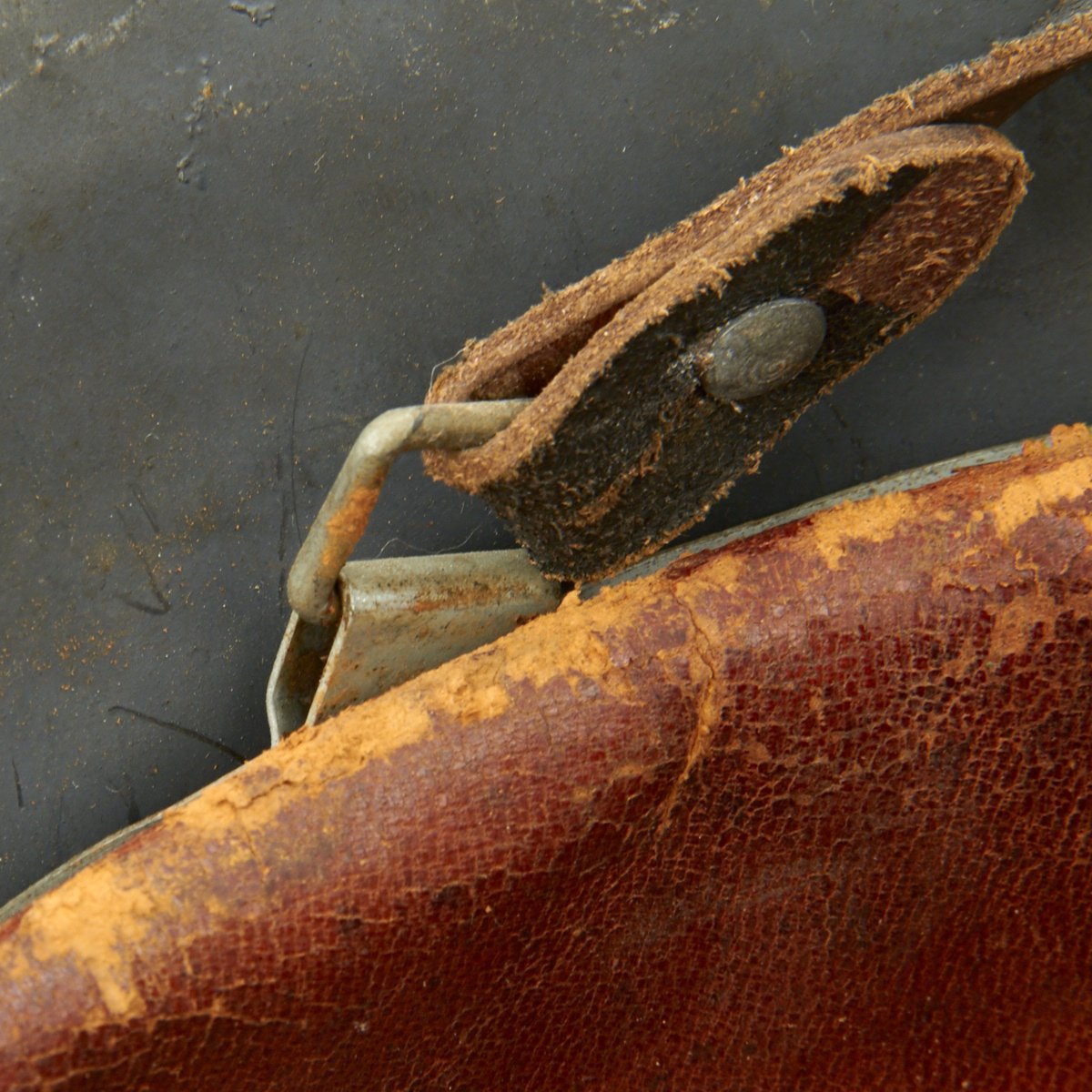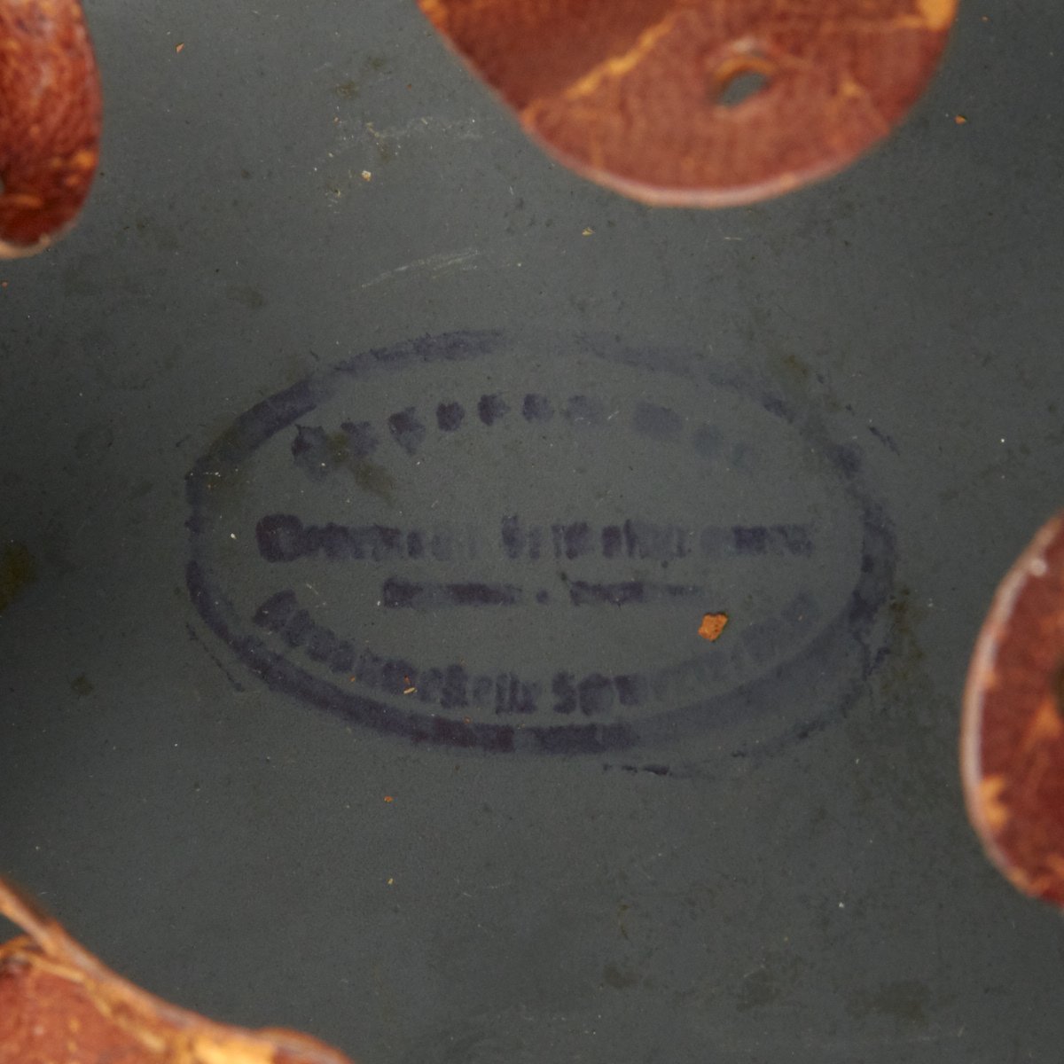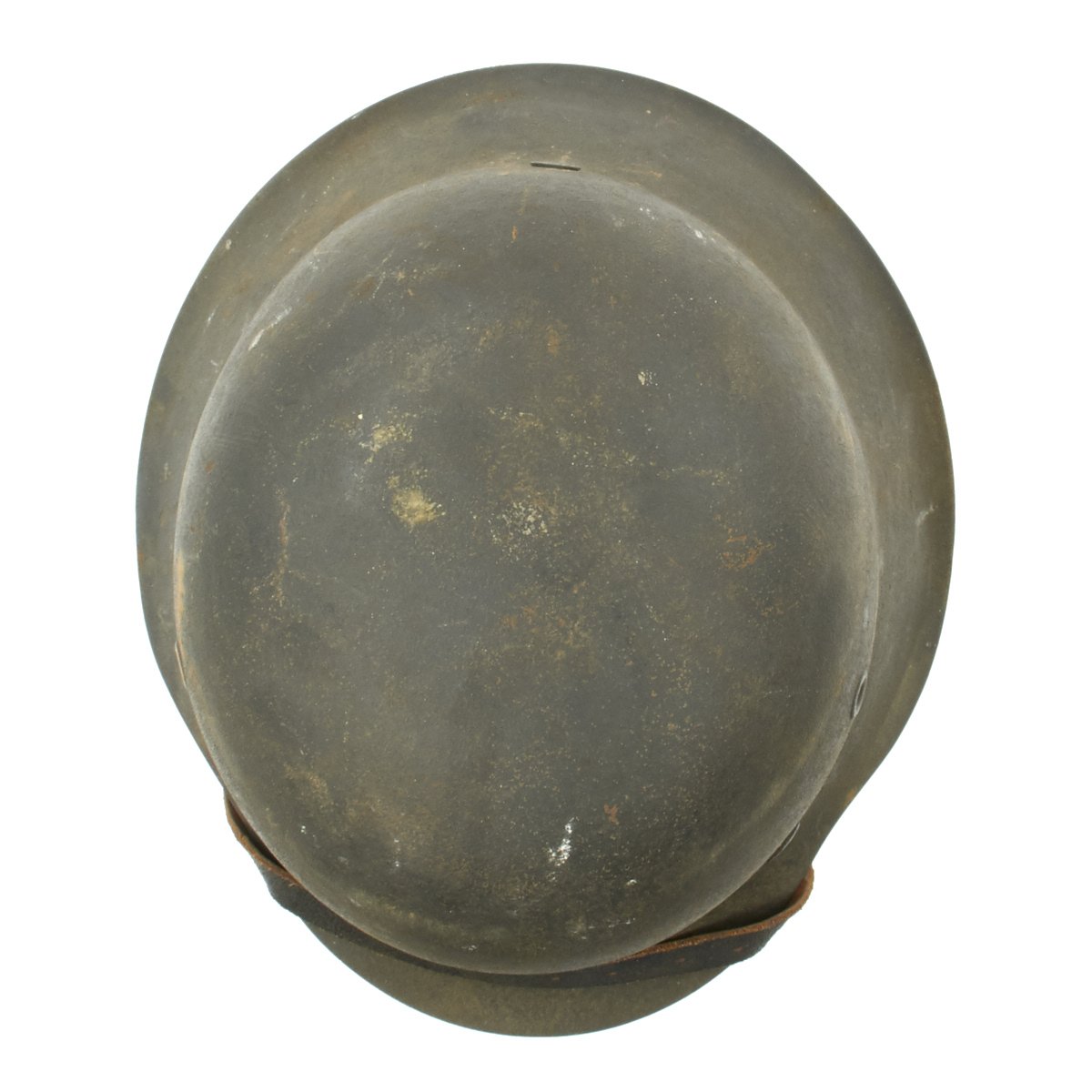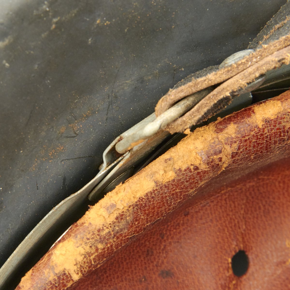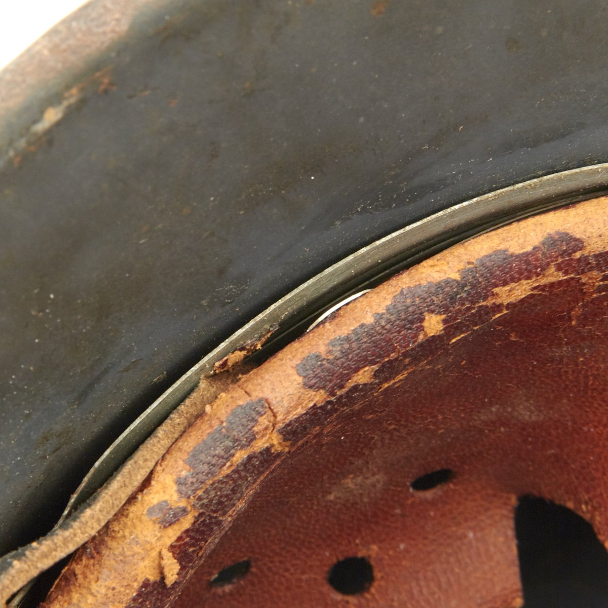 All three original liner retaining pins are intact and have complete original paint on the ends. The interior of the helmet still has an original M31 leather liner, however it has deteriorated over time. Several of the fingers are missing part, and the leather has split over the band, showing the felt padding underneath. There is no size marking indicated. The chin strap has fared better, and is complete, with the leather in good condition.