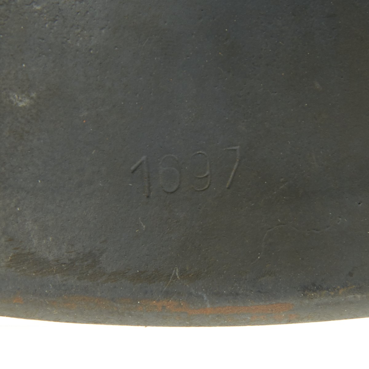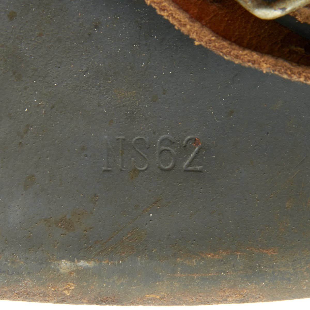 On the reverse of the shell's interior, the neck guard apron is lot number stamped,1697 and has a stamped manufacturer's code and size over the left ear, NS62. NS is the maker code for the Vereinigte Deutsche Nikelwerke factory in the Germany city of Schwerte. Size 62 is a nice smaller size that can accommodate liners from 54cm to 56cm or US 6 3/4 to 7.
