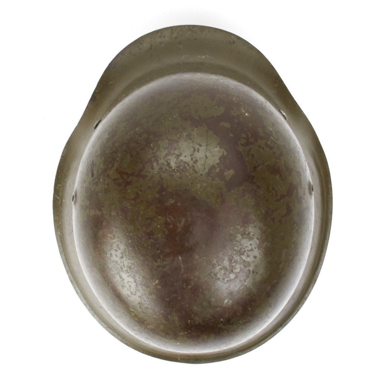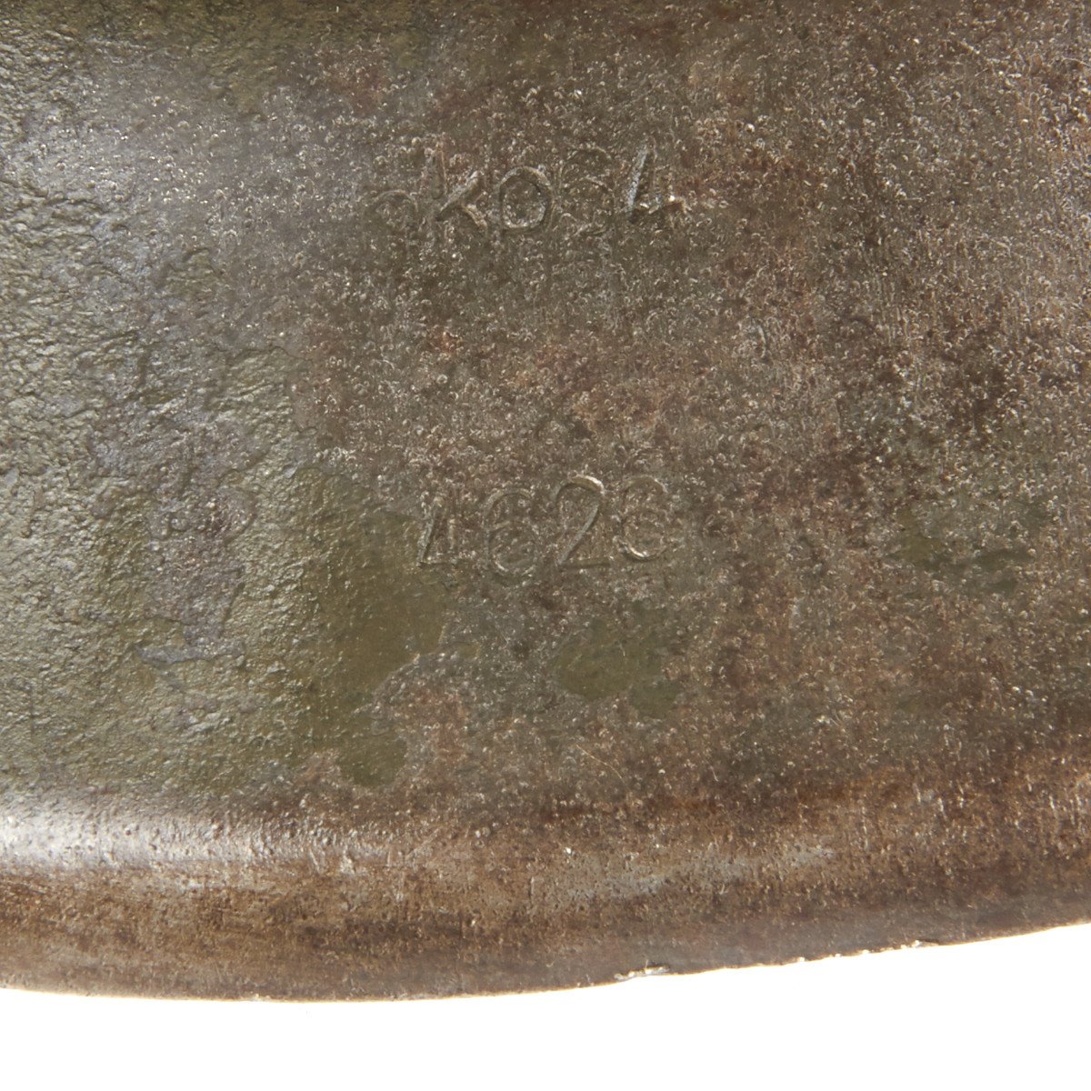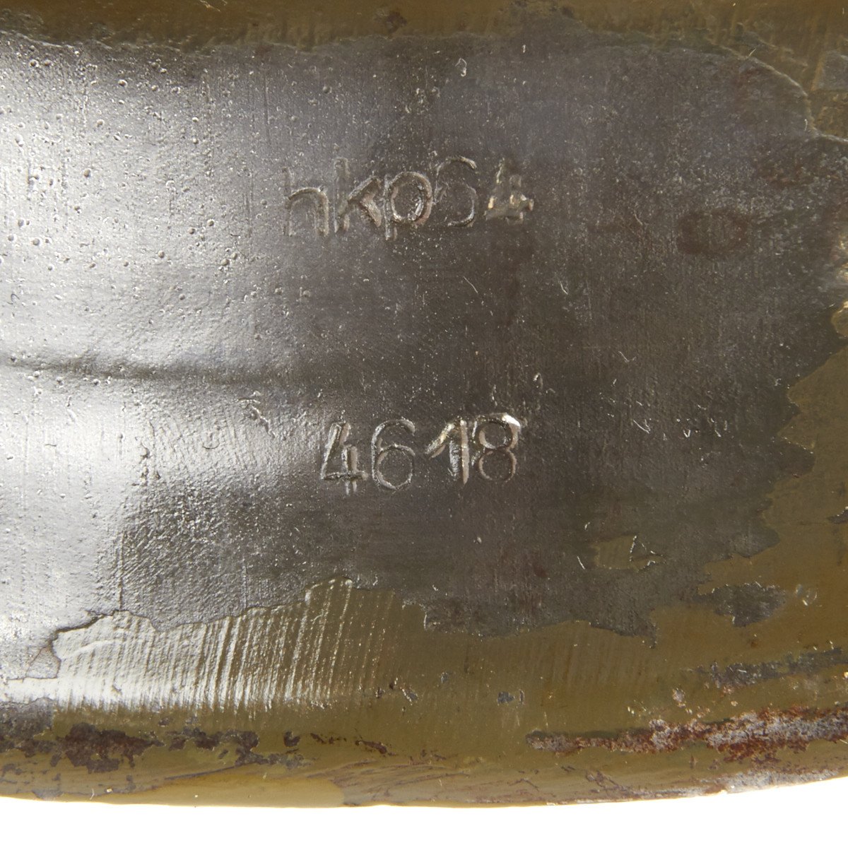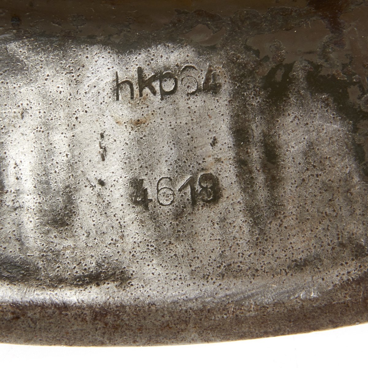 More than 25 Million German combat helmets were manufactured during the Second World War. Five independently owned metal fabrication plants accomplished this massive effort with experience in steel production. The largest producer of steel helmets (Stahlhelme) was the firm of Eisenhüttenwerke located in the city of Thale. The Thale firm and its engineers played a major role in the initial design and prototyping of the M1935 steel combat helmet. Production records indicate that nearly 20 Million helmets were manufactured between early 1939 and May 1944. Beginning as early as 1935, manufacturers began marking their helmet shells with the initials of the factory or company names. Over the course of time, several of these changed making it initially appear as though there were more than five manufacturers. The change in the factory designated name and marking had to do with the fact that the company names changed. These factory names were stamped directly into the helmet shell using two or three letters. Next to the letters was stamped the metric shell size of the helmet. In addition to these markings, helmets also received a stamped number in the rear center of the helmet's flange or skirt. This second set of numbers indicated the production number of the entire lot to which the helmet could be attributed. In some cases, the Quist firm also produced helmets bearing a "DN" stamp in the same location. The "DN" referred to the patent identification associated with the helmet's model or type. It should be noted that on occasion a helmet might be found bearing no markings whatsoever. If the helmet is a wartime shell, the explanation generally falls into to possibilities. The first is that the markings are there but shallow or buried beneath a thick coat of paint. The second relates to the fact that some helmets do not appear to have been marked at all. This may be related to a factory error, or something done intentionally. No clear rational has been found to explain this uncommon occurrence.