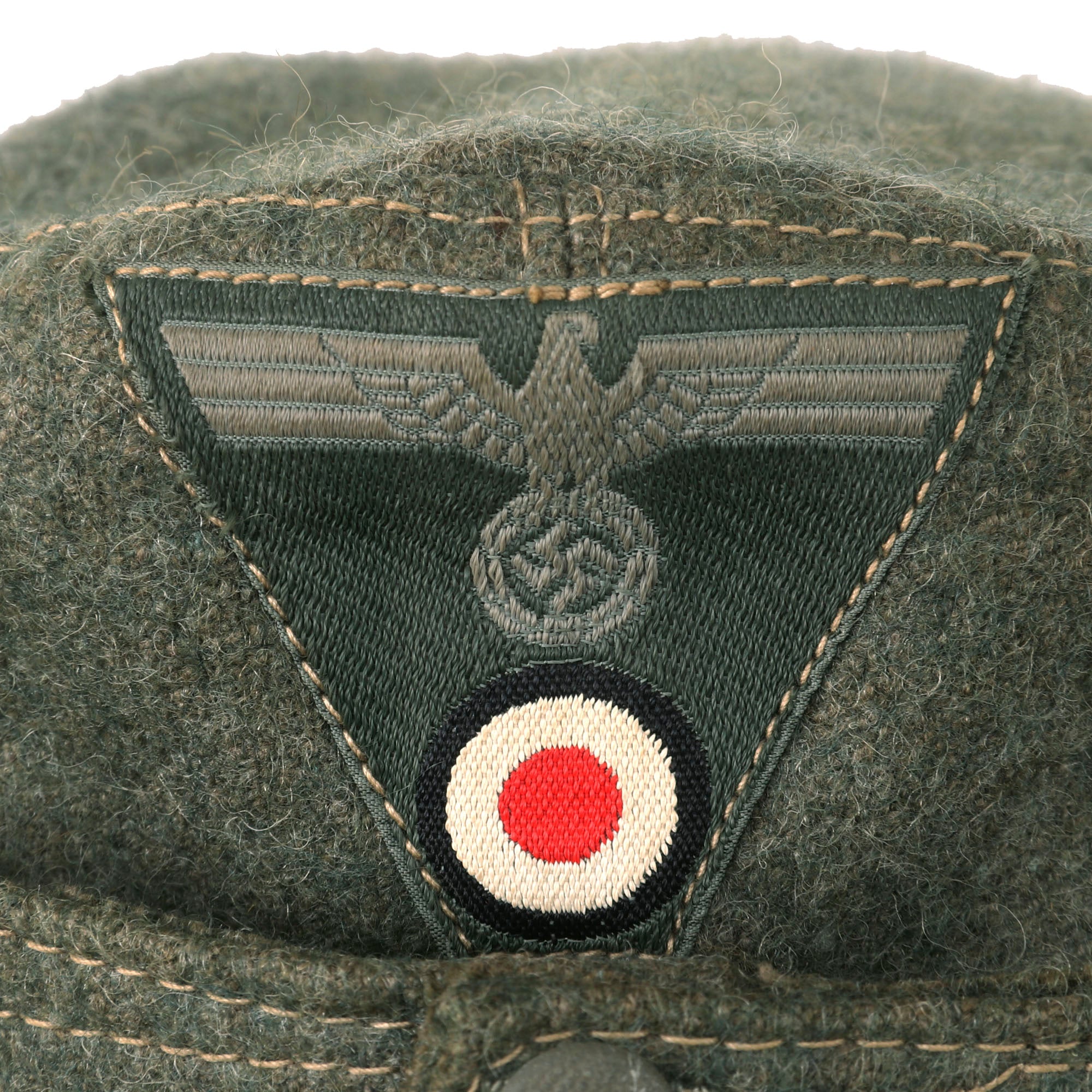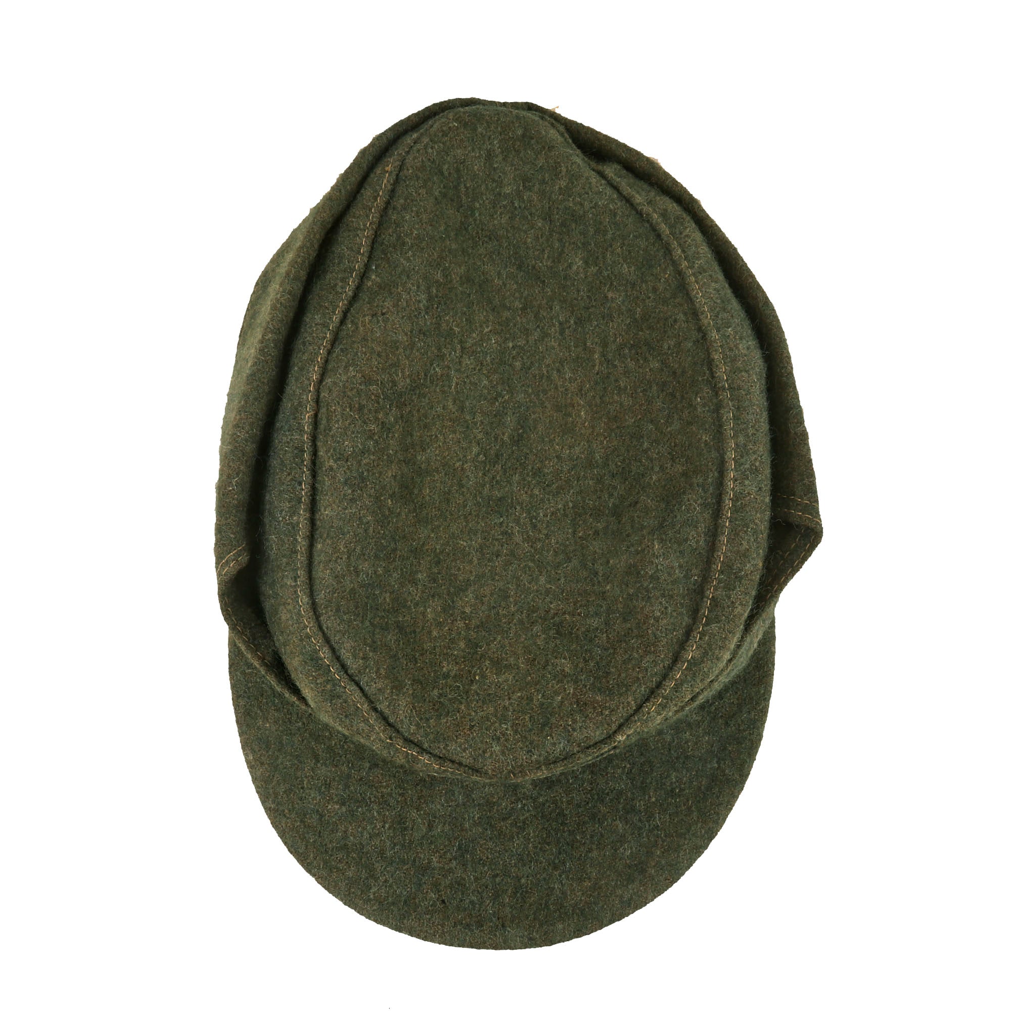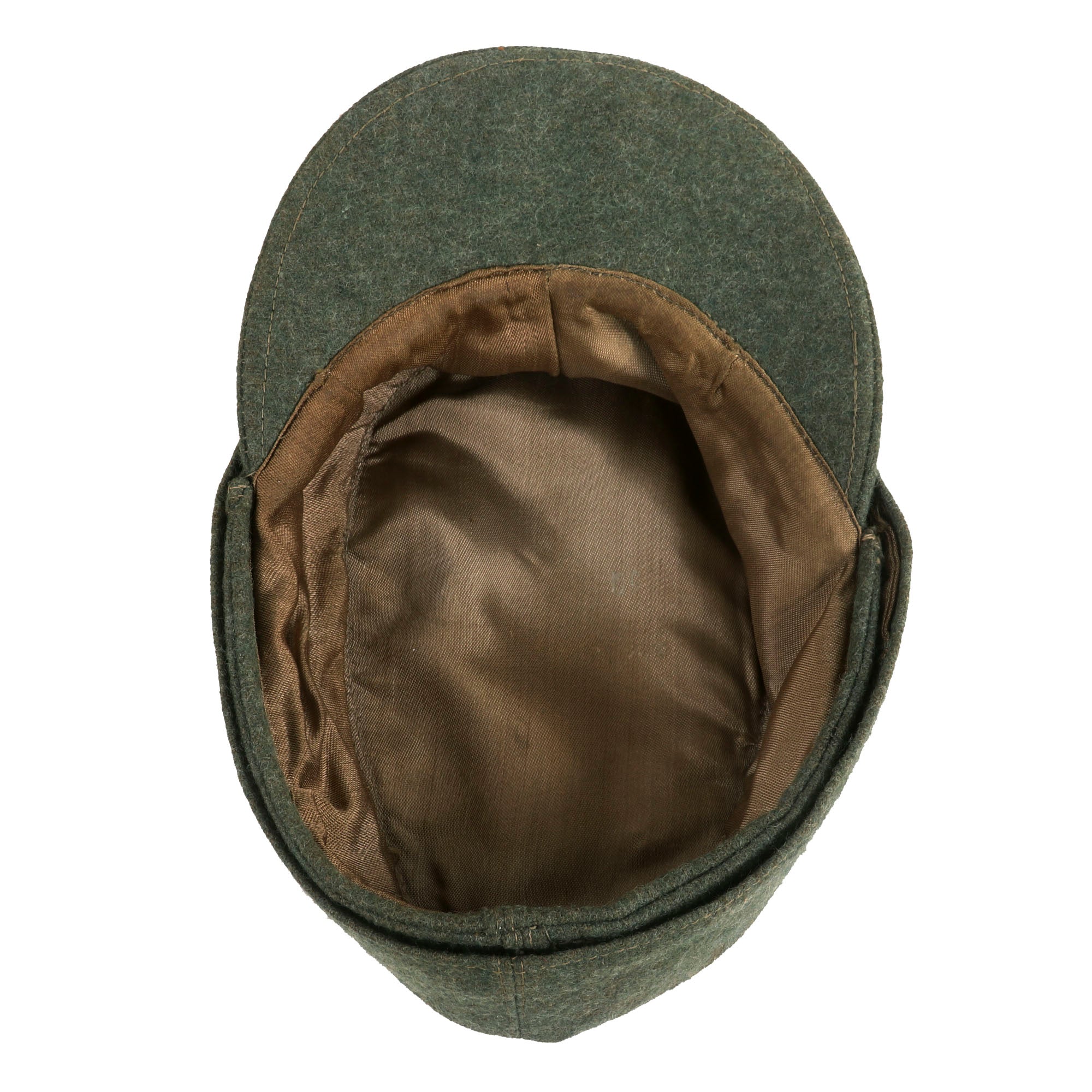 Original Item: Only One Available. This is lovely mid war M43 Heer Feldmütze (Army Field Cap), which is in very good lightly used condition. It is constructed of wool gabardine cloth, with fold-down panels with squared scallops to the front and forward sides, covering the entire neck on the sides and rear when in use. When not in use, the panels are raised with their ends resting upon the visor, being joined together by two non-magnetic painted pebbled buttons. It has rayon loops on the underside of the flaps, only seen on some examples.