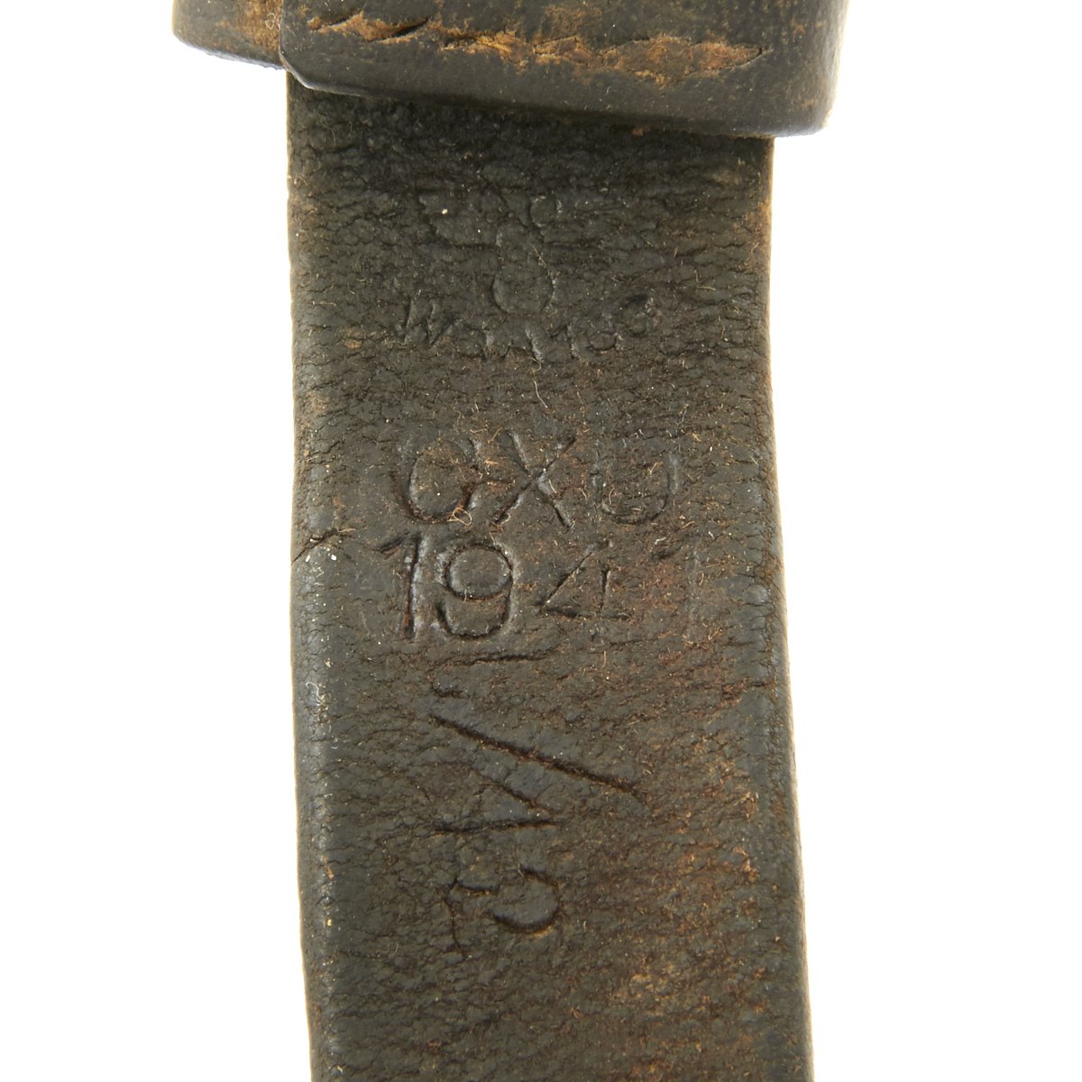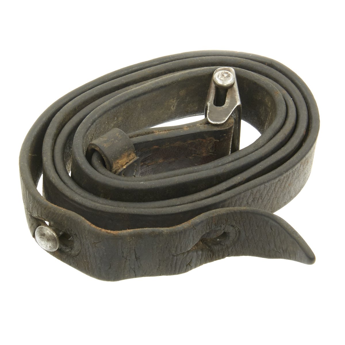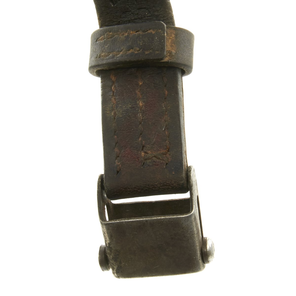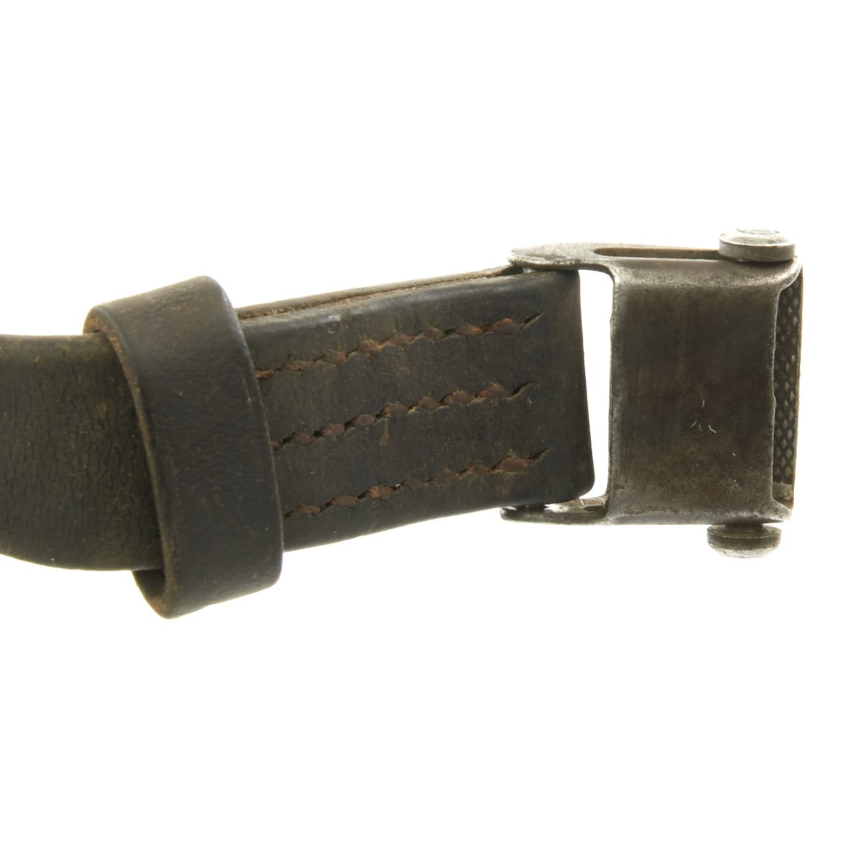 The sling is still a bit dusty from storage at IMA for over 30 years. The sling still bears an original Waffenamt marking and is coded cxb / 1941 for manufacture by Moll Lederwarenfabrik, in Goch, Rheinland, Germany. Comes complete with just TWO holes to the other end of the sling with its original steel "collar button" in place. Original cross hatching is still visible in areas on the sling, and original keeper loop is intact. The leather "scratch guard" on the back of the buckle is missing unfortunately.