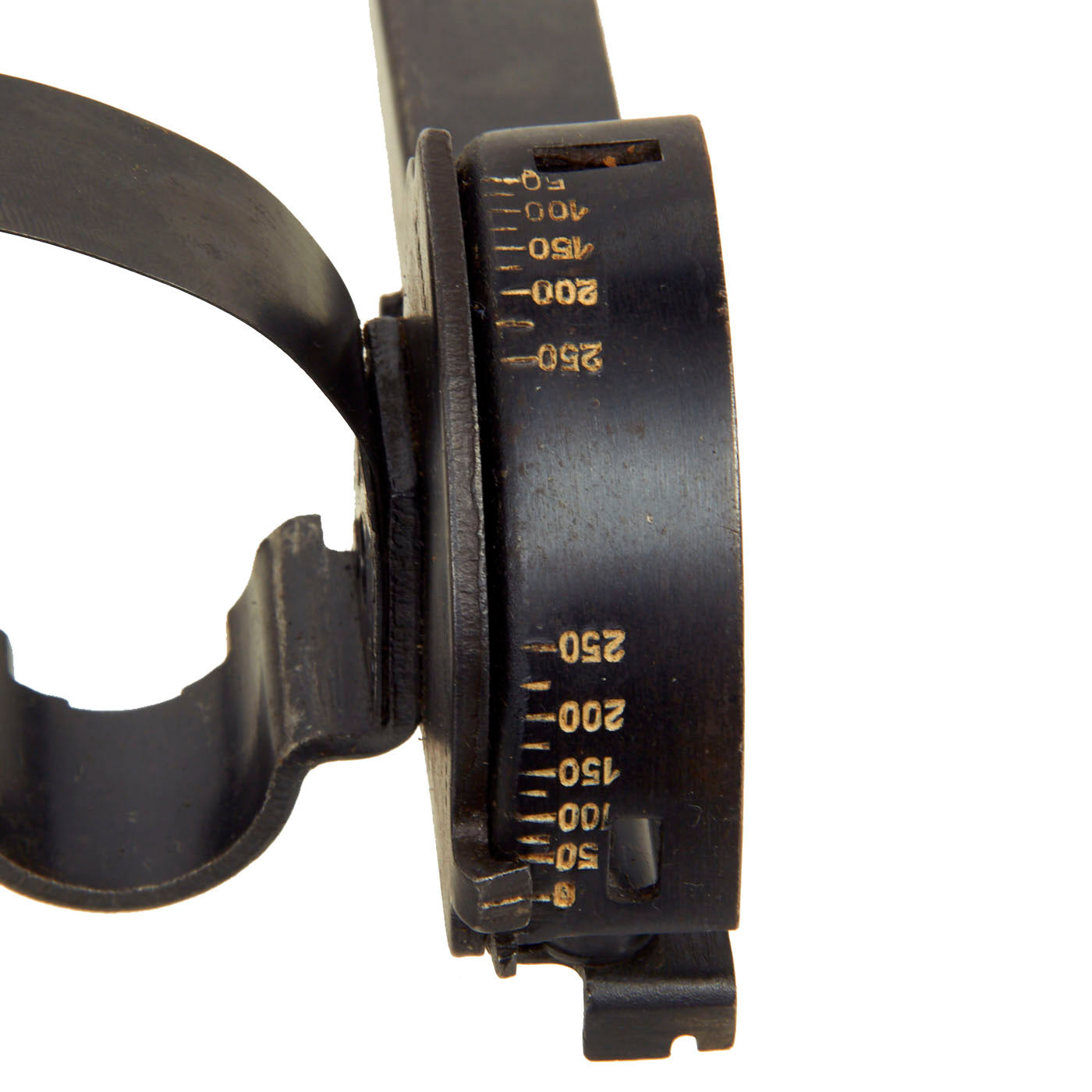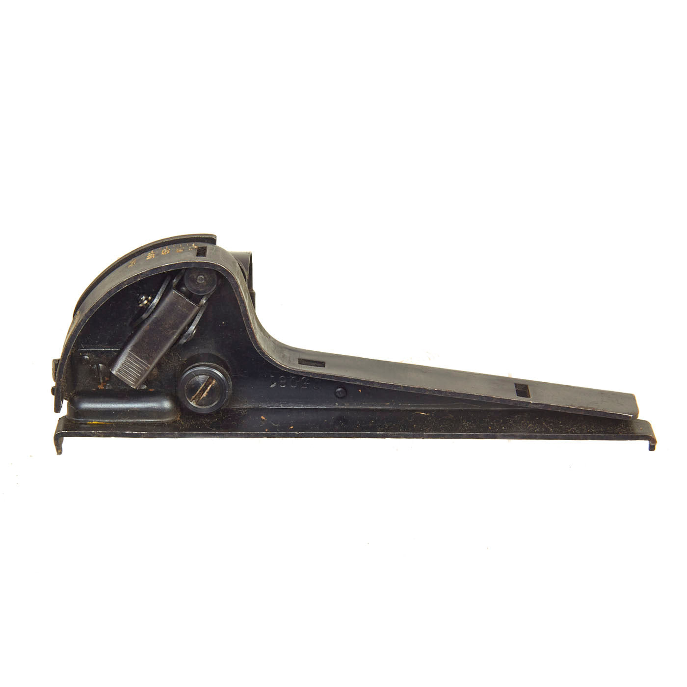 The hard to find rear site is complete and functional as far as we can tell. It adjusts correctly, with an intact leaf spring and clamp and even has an intact original spirit level. It is Waffenampt proofed on the interior, next to serial number E 5081 and maker code euh, for C. u. W. Meinel-Scholer, Klingenthal in Sachsen. This company is most known for making LP42 flare pistols.