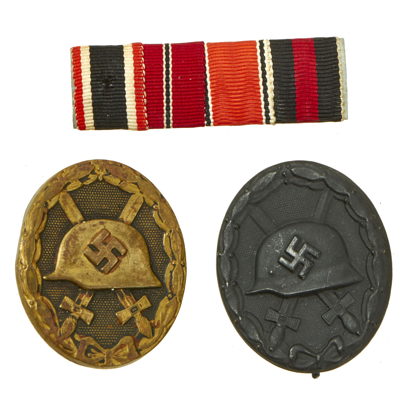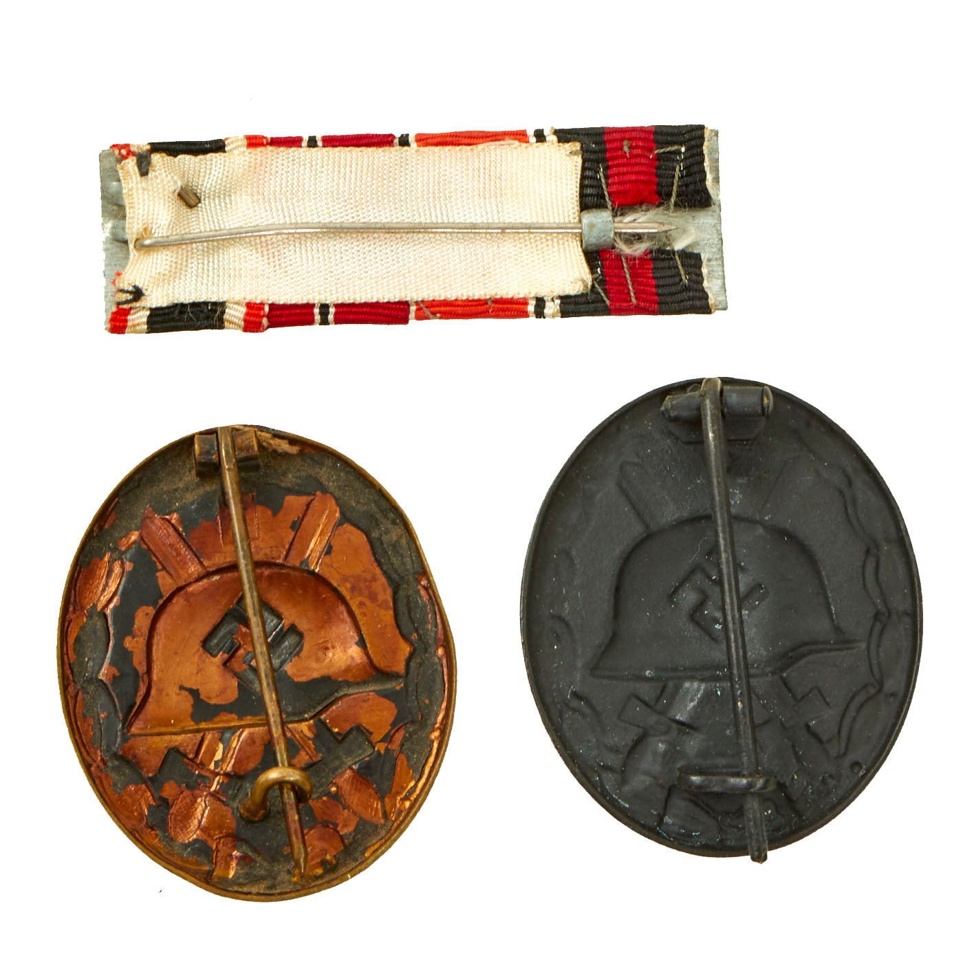 - x2 Black Wound Badges: The Wound Badge was a German military decoration first promulgated by Wilhelm II, German Emperor on 3 March 1918, which was first awarded to soldiers of the German Army who were wounded during World War I. Between the world wars, it was awarded to members of the German armed forces who fought on the Nationalist side of the Spanish Civil War, 1938–39, and received combat related wounds. It was awarded to members in the Reichswehr, the Wehrmacht, SS and the auxiliary service organizations during World War II. After March 1943, due to the increasing number of Allied bombings, it was also awarded to civilians wounded in air raids. It was awarded when the wound was the result of enemy hostile action. In 1957, the West German government authorized a denazified (Swas removed) version of the basic (black, silver, & gold) badges for wear on the Bundeswehr uniform, among other certain NSDAP-era wartime awards.