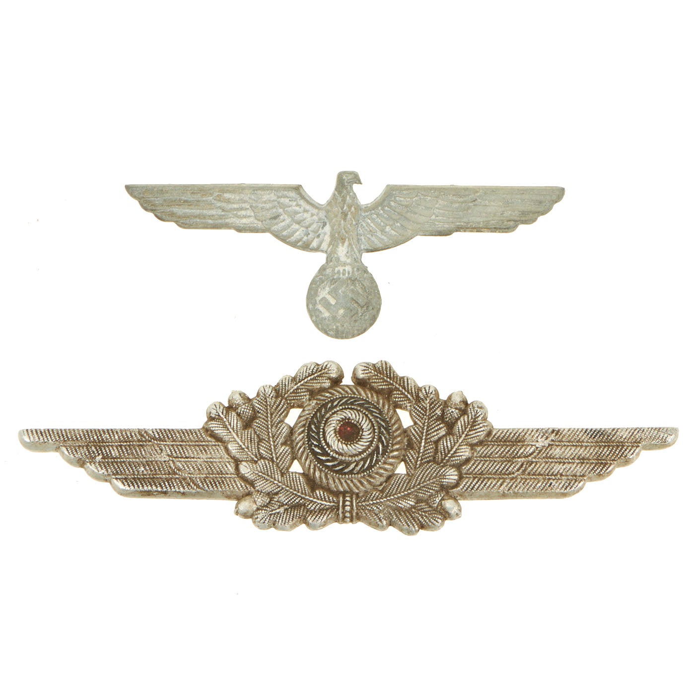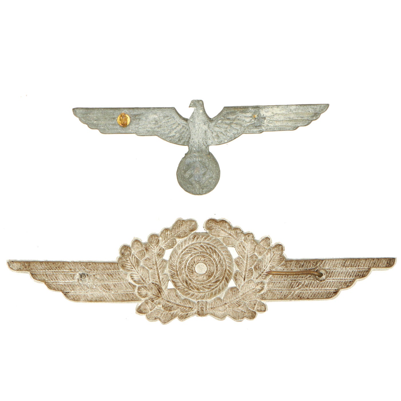 - Heer Uniform Breast Eagles, Cloth and Medal: Cloth insignia appears to be uniform removed and has some thread wear on the left wing. The metal insignia has minor oxidation causing the appearance to be dull. The pin is missing from the back.