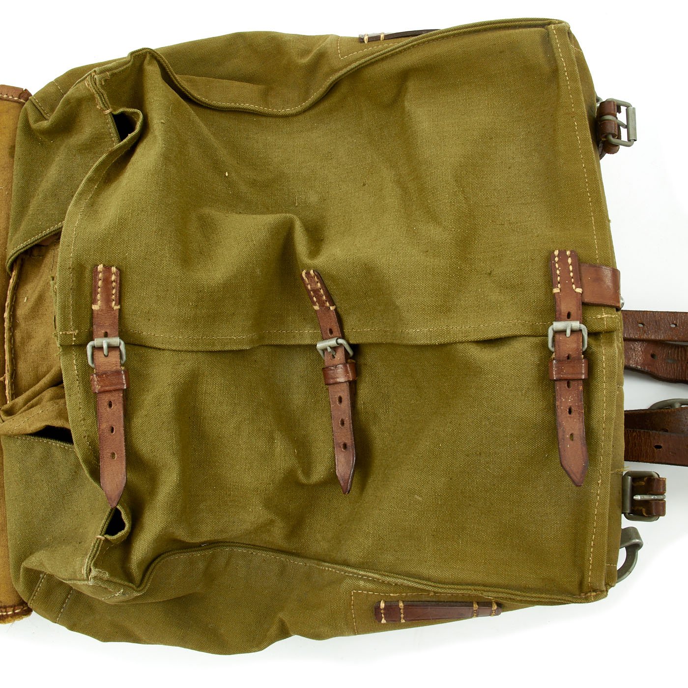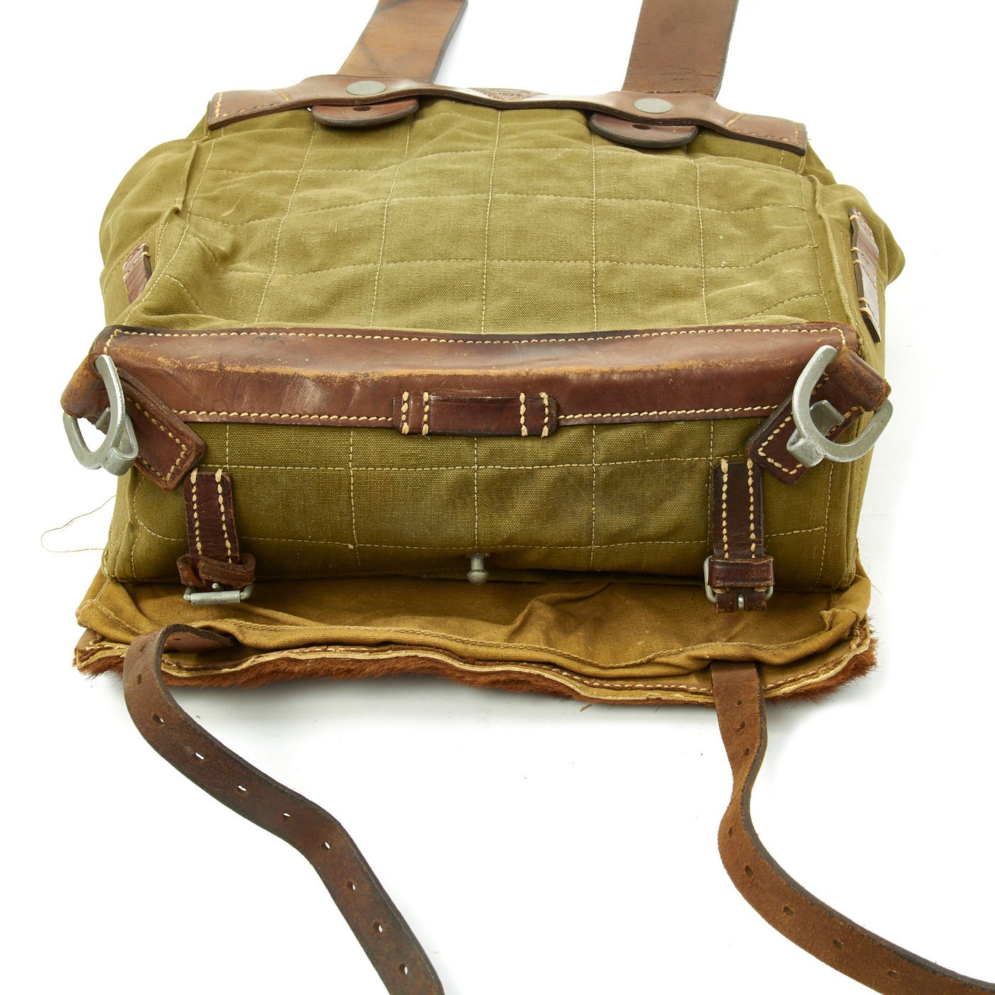Original Item. Only One Available. This cowhide-covered rucksack was known as the Tornister (Knapsack) Model 34 (developed in 1934), and were issued quite frequently to mountain troops and others. The design was later changed in 1938 to have shoulder straps that interfaced with the pistol belt as well as the bottom of the pack. As the war progressed the design was simplified for economical and practical reasons so the cowhide cover was eliminated making these packs especially scarce on today's collector market.