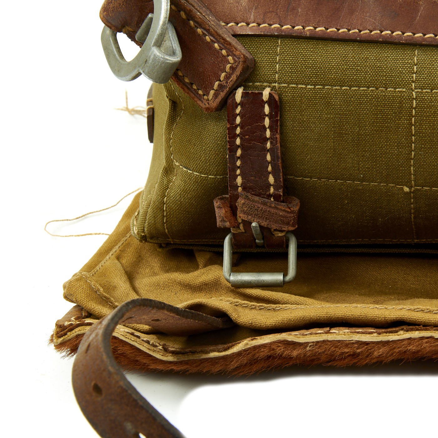 Condition is very good, especially considering the age. The fur on the cowhide is still almost completely intact, though the leather border around it has degraded over the decades. The shoulder straps are complete and intact, though the leather is quite dry and cracked in places. The side straps that connect to the bottom of the pack are also still present. The interior of the pack is in great shape, and complete, with a faded ink stamp on the inside of the "top". The various buckles and straps all look to be present.