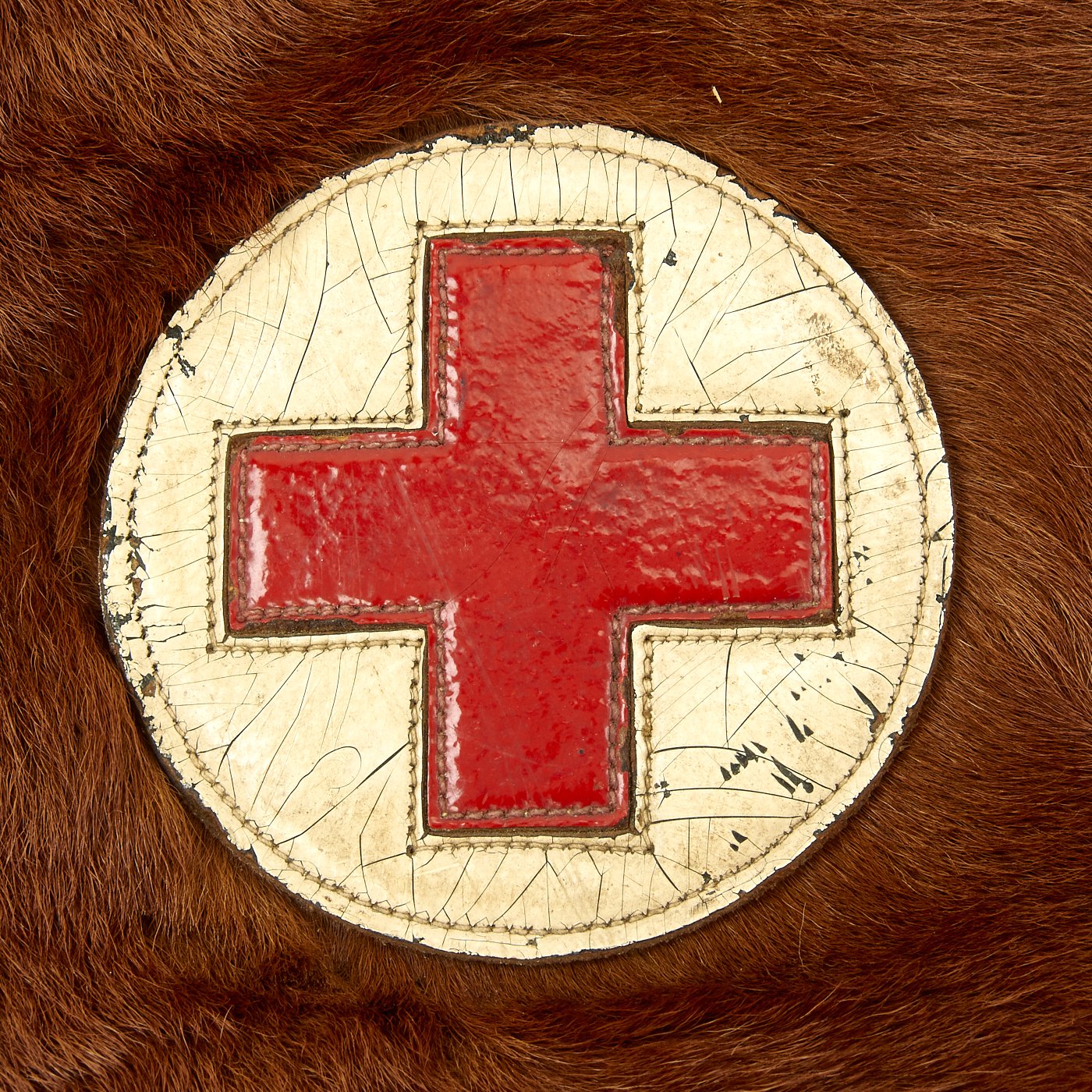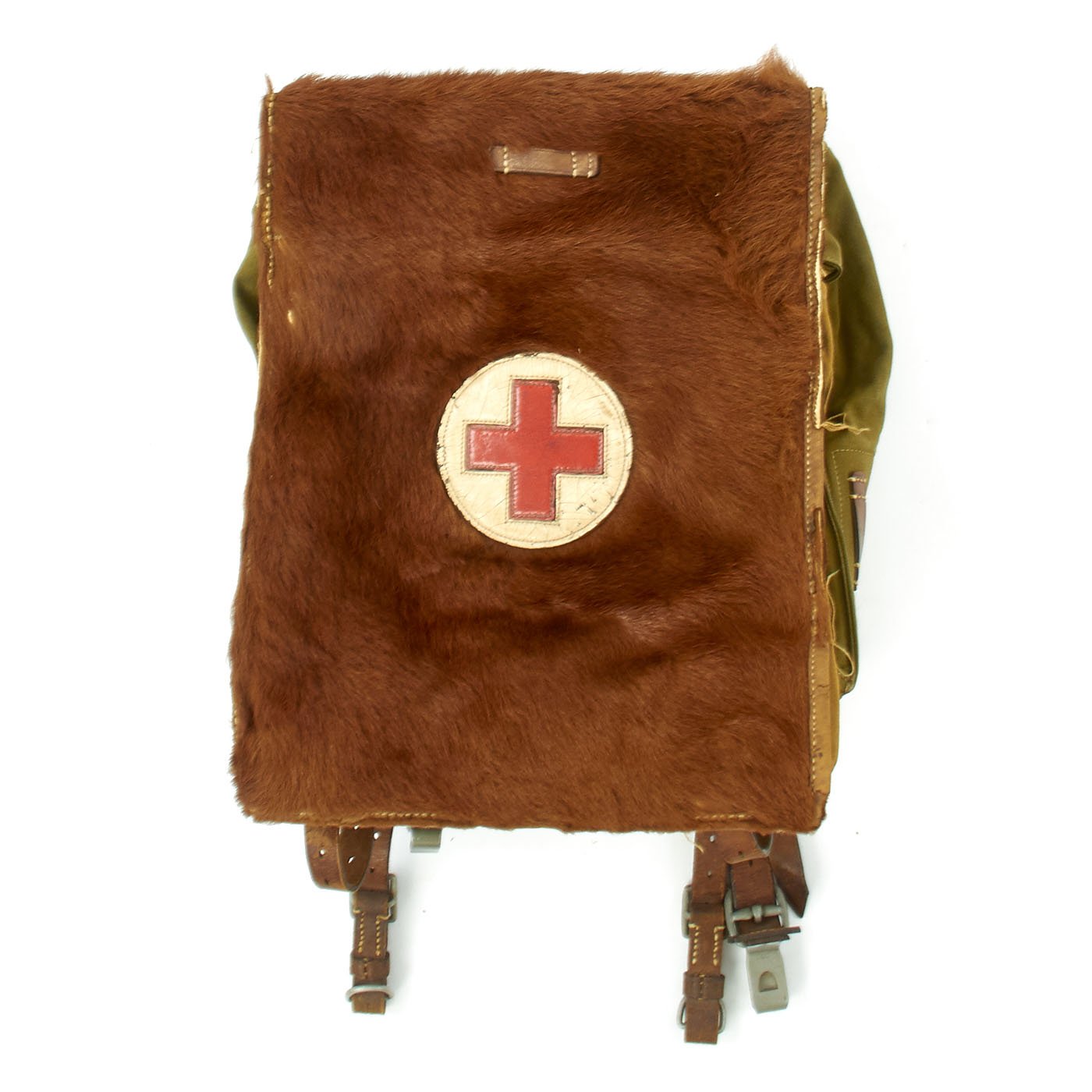 The pack measures approximately 11"W x 12"H x 4 1/2", and still retains almost all of its original parts. What makes this example really great is the 3 3/4 inch wide circular painted leather medic emblem on the back of the patch. We have examined the stitching and condition, and this is definitely an original WWII issue example.