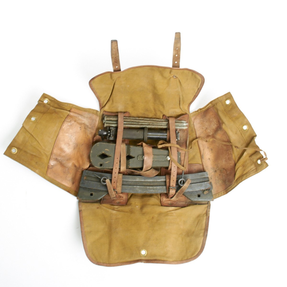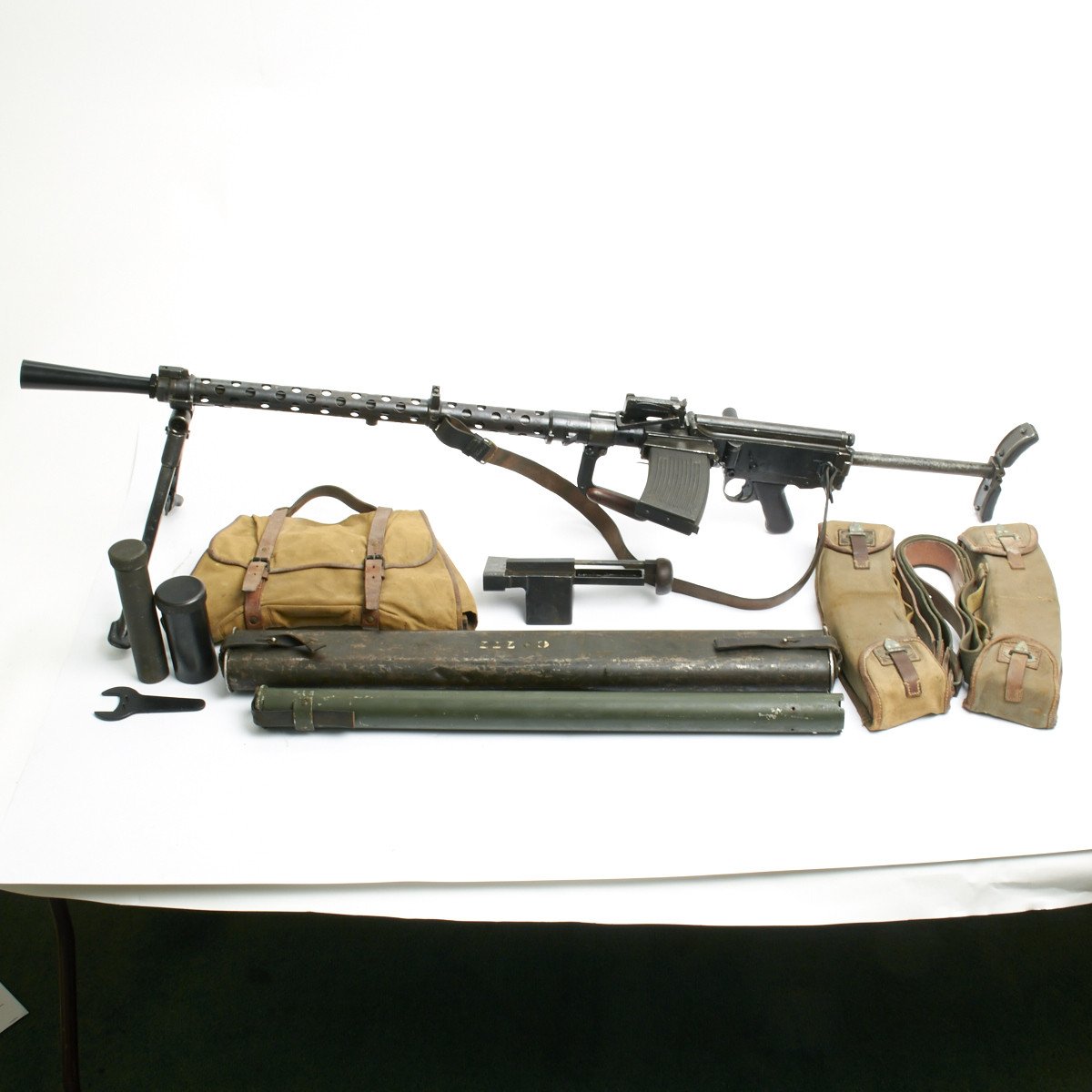 • Original Item: Only One Available. This is a stunning original German MG 13 non-firing dummy gun with a very large set of accessories. The MG 13 was the standard light machine gun of the Wehrmacht from 1930 through 1934. The design, which was adapted from the Dreyse machine gun of World War One, is simple and rugged. From the tactical point of view, the Germans considered that the LMG they wanted had to be belt fed with a quick barrel change feature, which led to the MG 34 being adopted. Nevertheless, the MG 13 saw widespread use as a second-line light automatic. Some countries, for example Great Britain, had fine success using a magazine-fed gun as their basic LMG (the BREN gun), and the United States had good success with the BAR in a similar role.