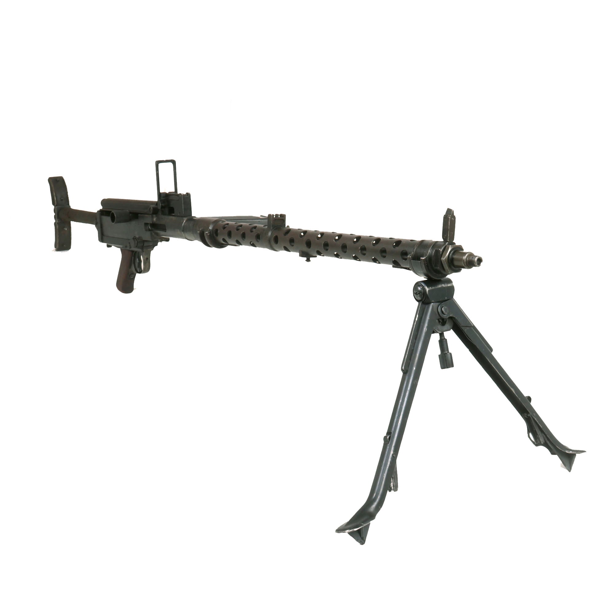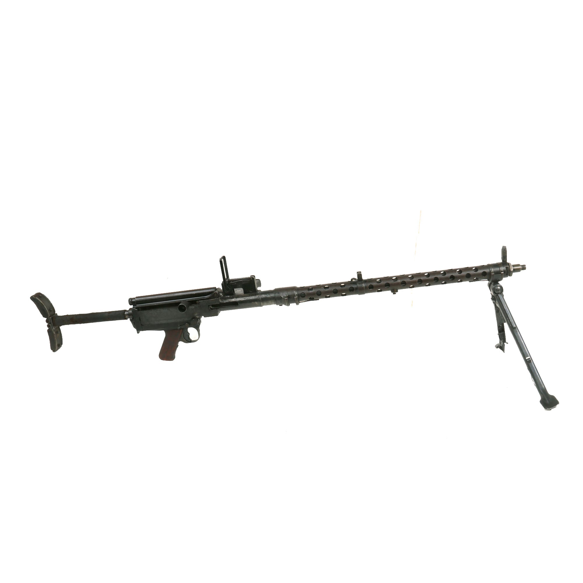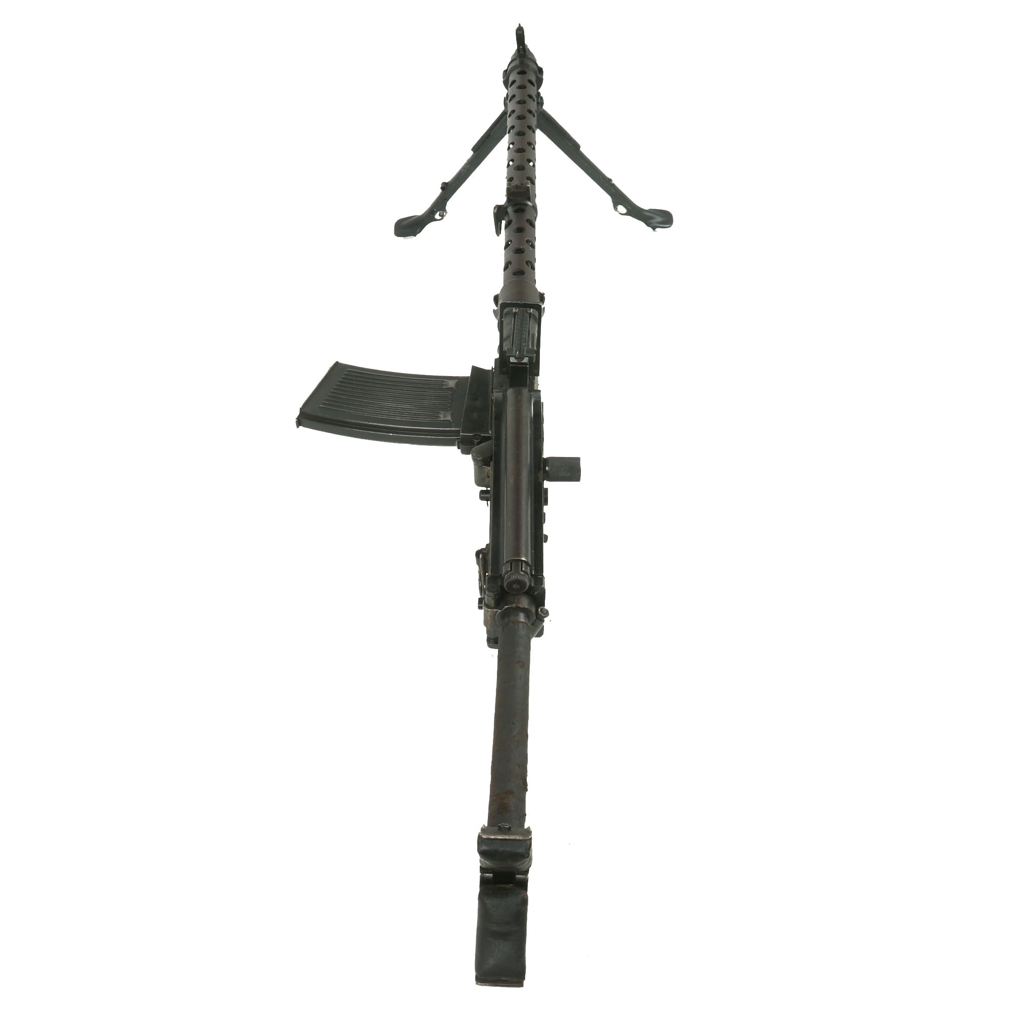 Original Item: Only One available. Constructed from a legally demilitarized (de-milled) parts set, this is a wonderful and rare German WWII Era MG 13 Display Light Machine Gun. It is built from all original parts on an original BATF compliant non-firing display receiver, making this a 100% legal display machine gun. This receiver was created by using portions of the original torch cut receiver, including the barrel bushing, combined with some new made solid steel portions. It has properly had a 25% section of the total length completely replaced entirely with solid steel bar stock. Meaning a 1/4 length section of the display receiver is solid steel, making this legal to own without a license of any kind.
