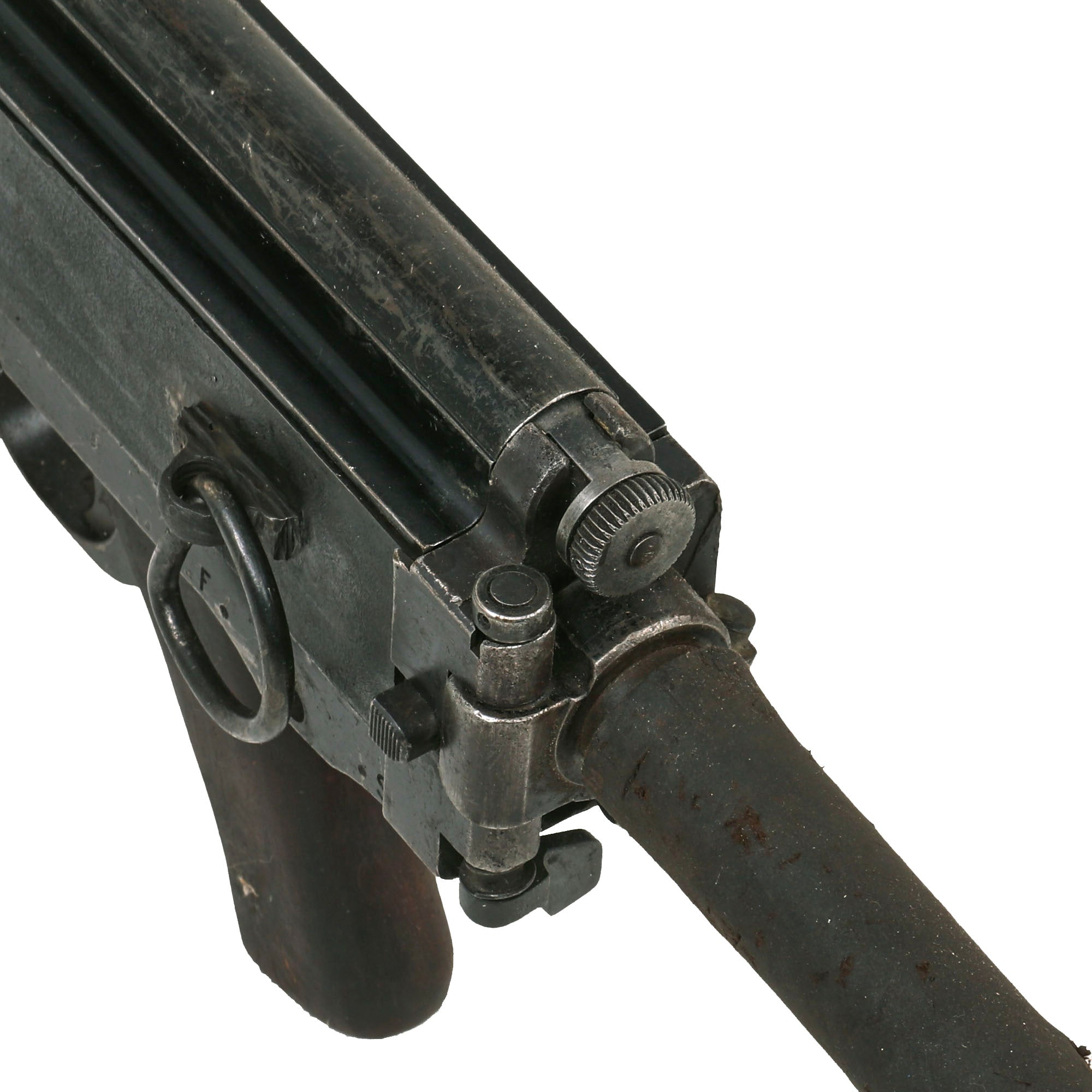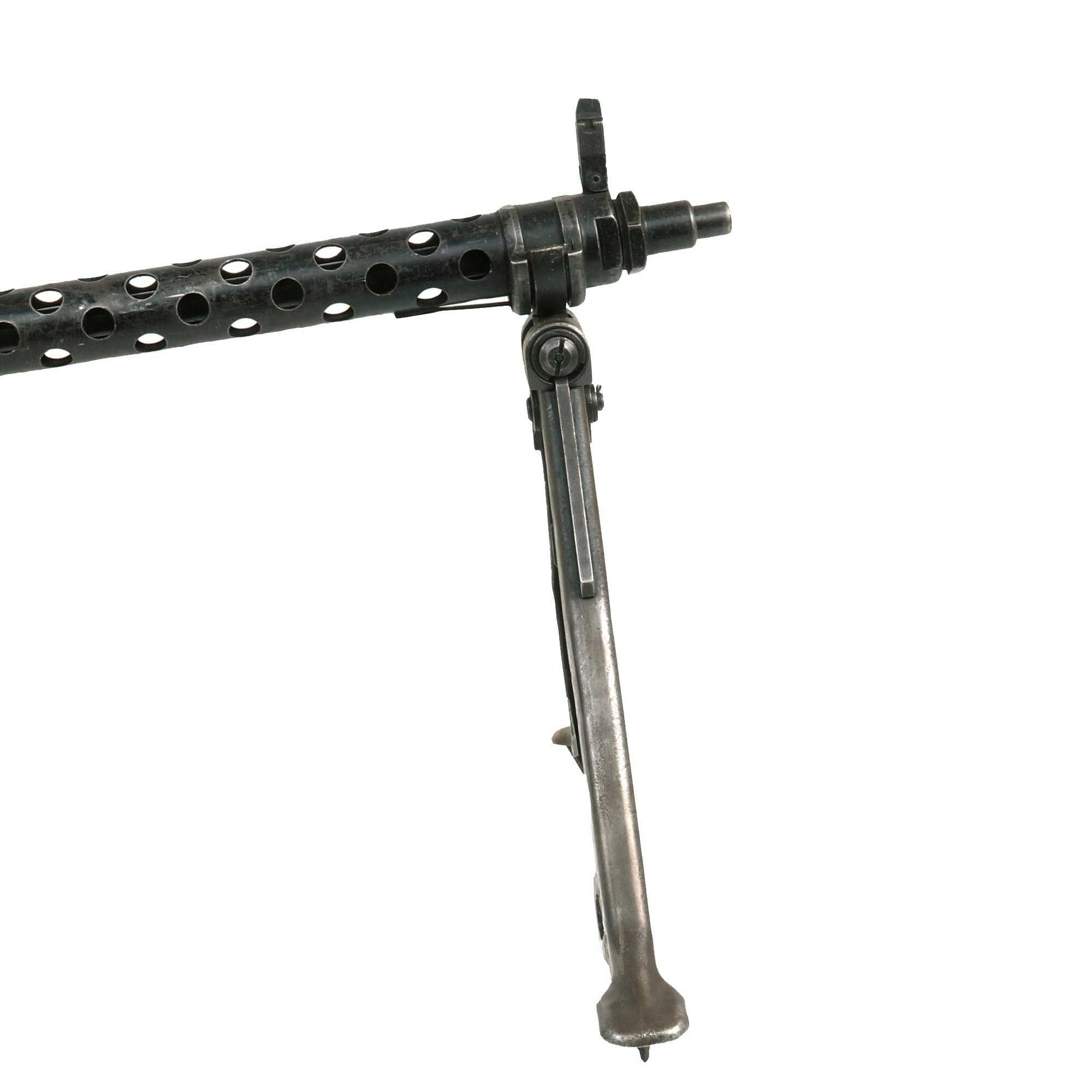 The bipod is in very good condition, though it looks like it may be an adapted early style MG 34 Bipod with height adjustment, which were very similar to the MG13 bipods, and pretty much interchangeable. MG13 bipods were originally issued with a latch between the legs to secure them once hooked around the stud on the bottom of the barrel jacket. The display gun still features much of the original blued finish, now worn in areas from service. It comes with an original magazine where permitted, otherwise the spring and follower will be removed.
