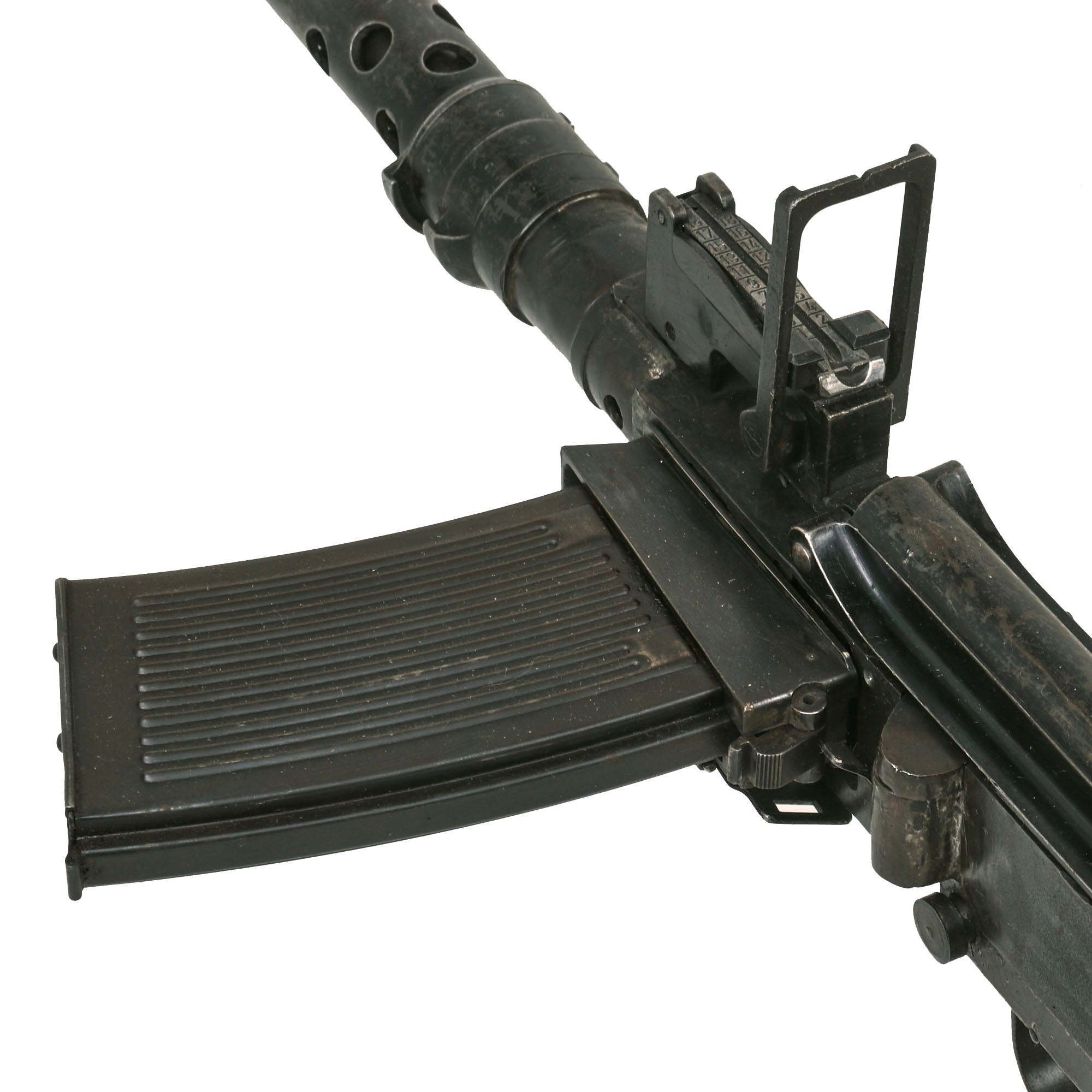 On later examples a 75-round saddle drum was also used. It was equipped with a folding butt stock and a carrying handle It was used in the turret of the Panzer I tank.
