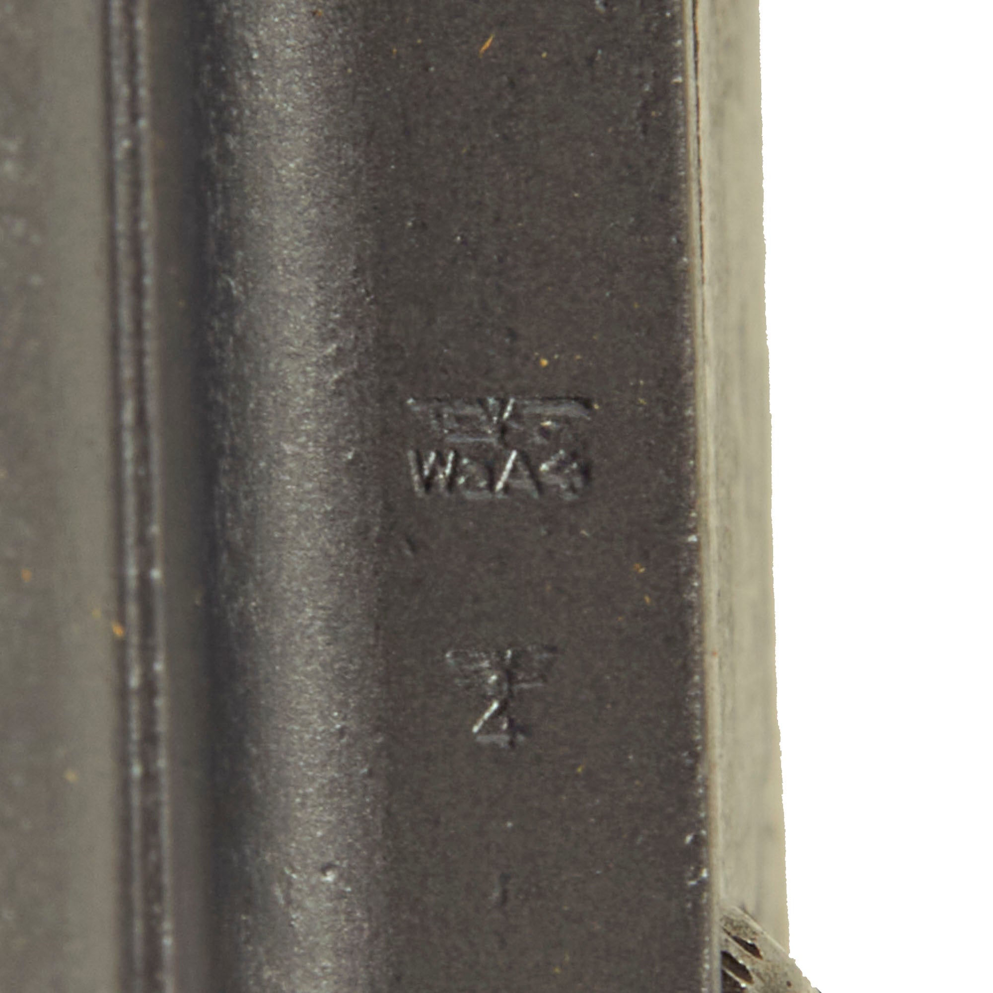 This example bears multiple Waffenamt proofs on various components. It features all original parts (with the exception of the solid steel portion of the dummy receiver) including a foldable butt stock and functional bipod. The butt stock still locks into the open position, and can be folded back up along the right side of the receiver, though the retaining mechanism on the side of the receiver is missing. It also features a rare early brass magazine well, which we have very rarely seen. The display gun is finished with lovely custom gunmetal gray paint.