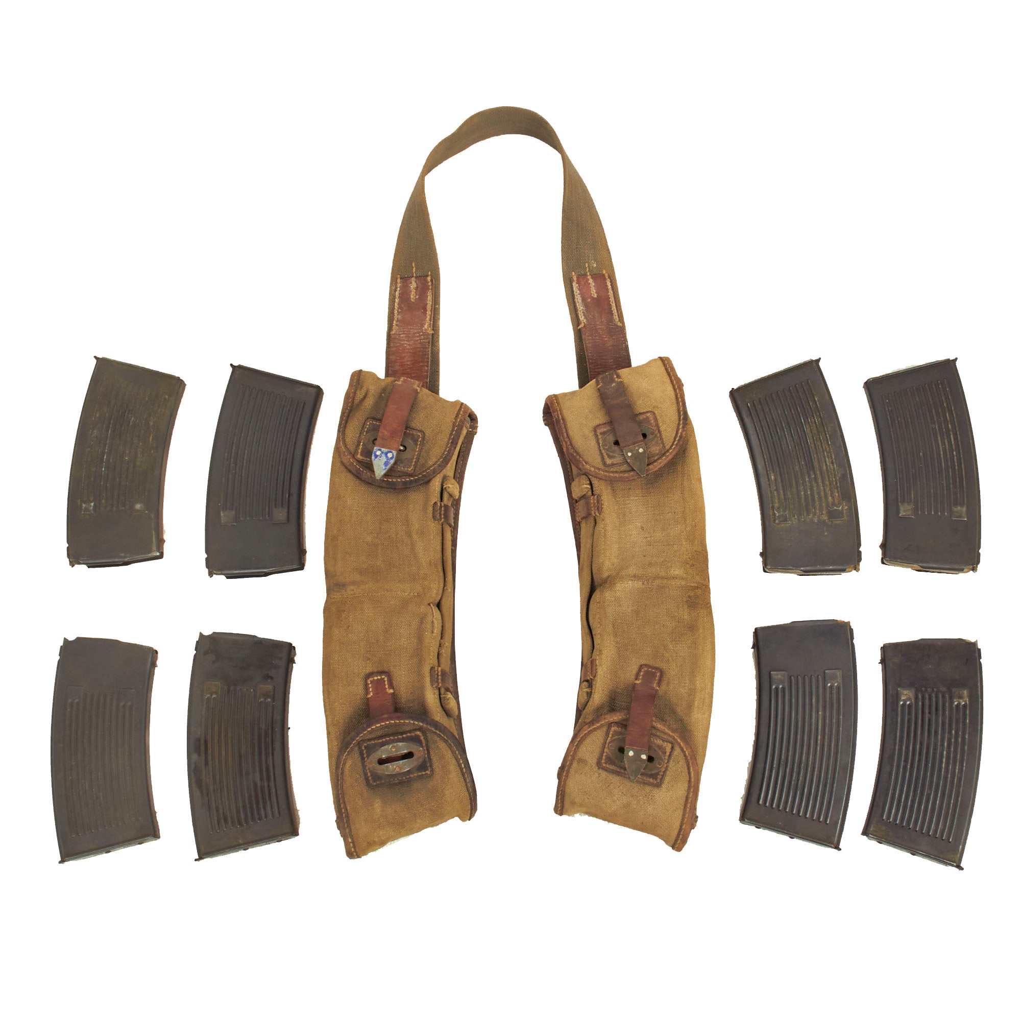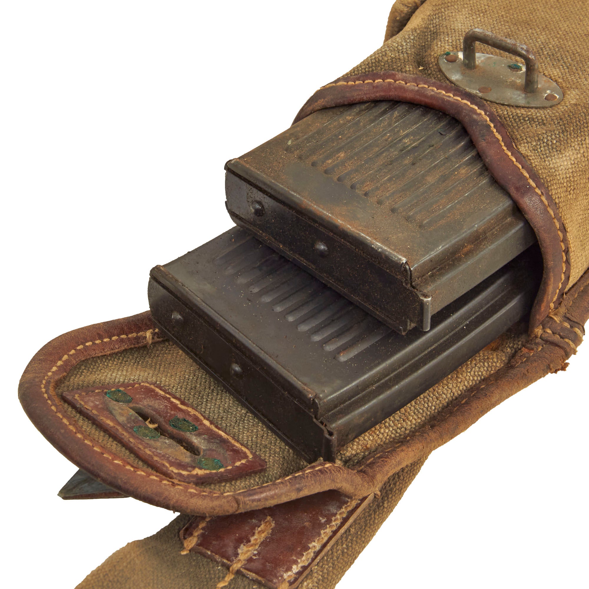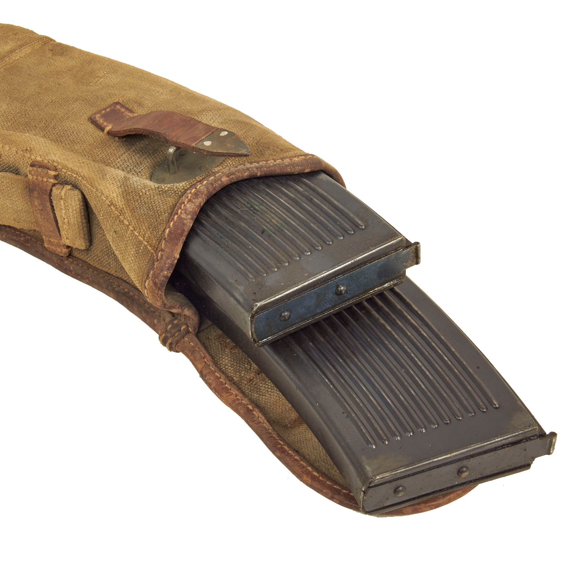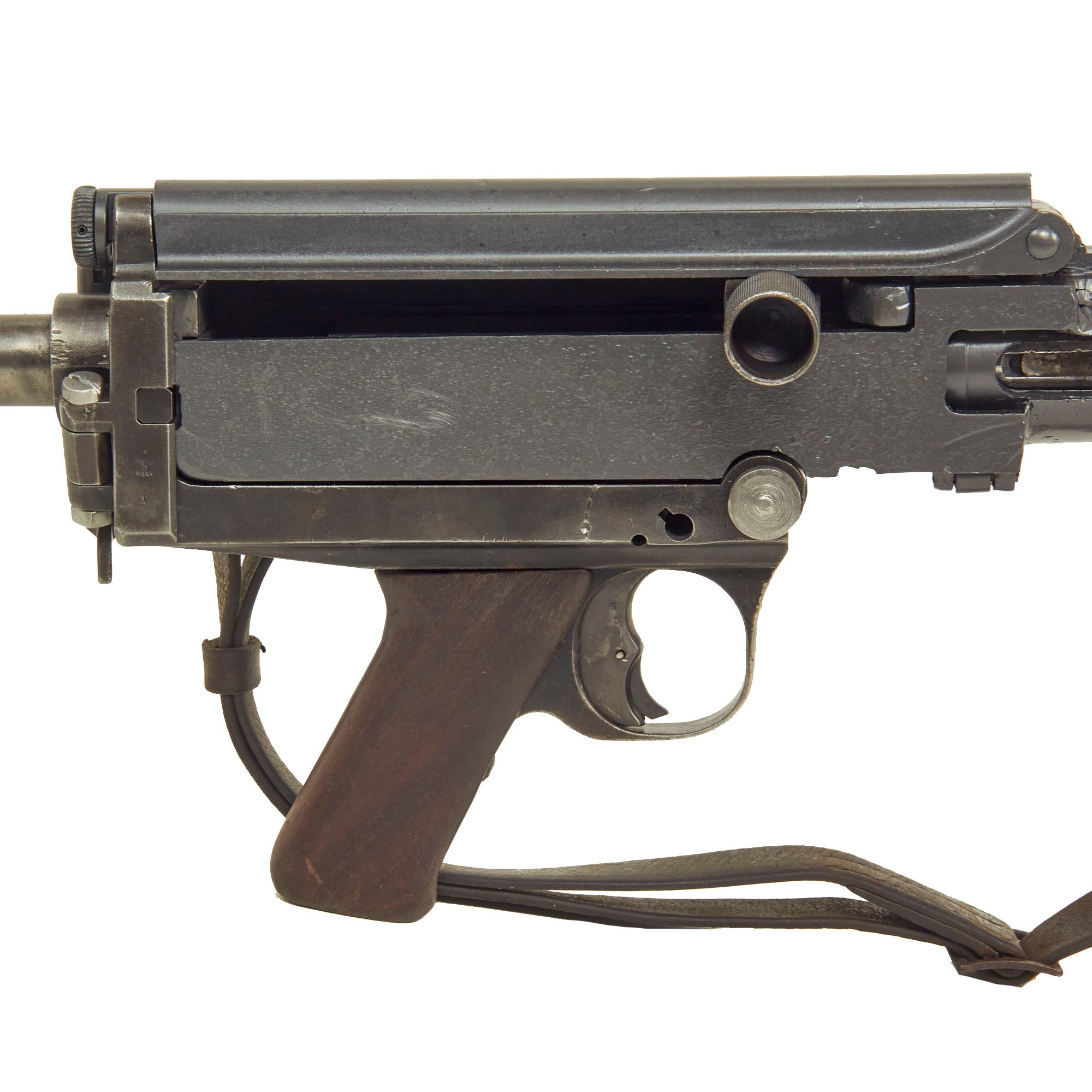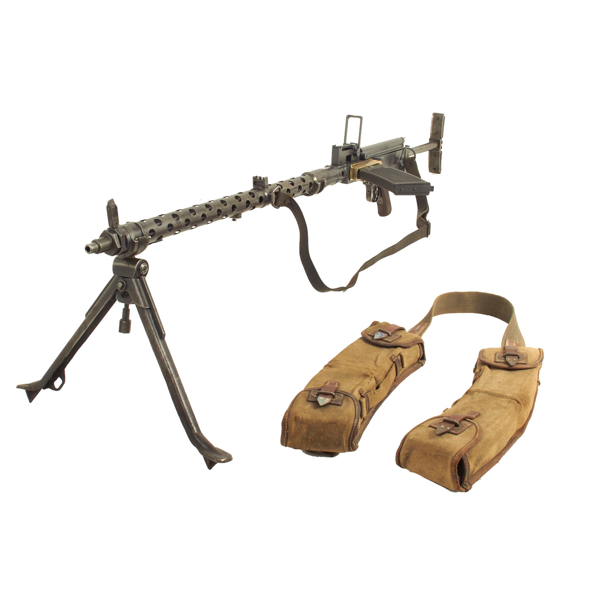 The display gun comes with a wonderful set of double magazine pouches with neck strap, filled with 8 MG 13 magazines. We used to have crates of these, but they dried up long ago. Also included with this lovely gun is an original magazine and sling. Deactivated magazines will be sent where prohibited.