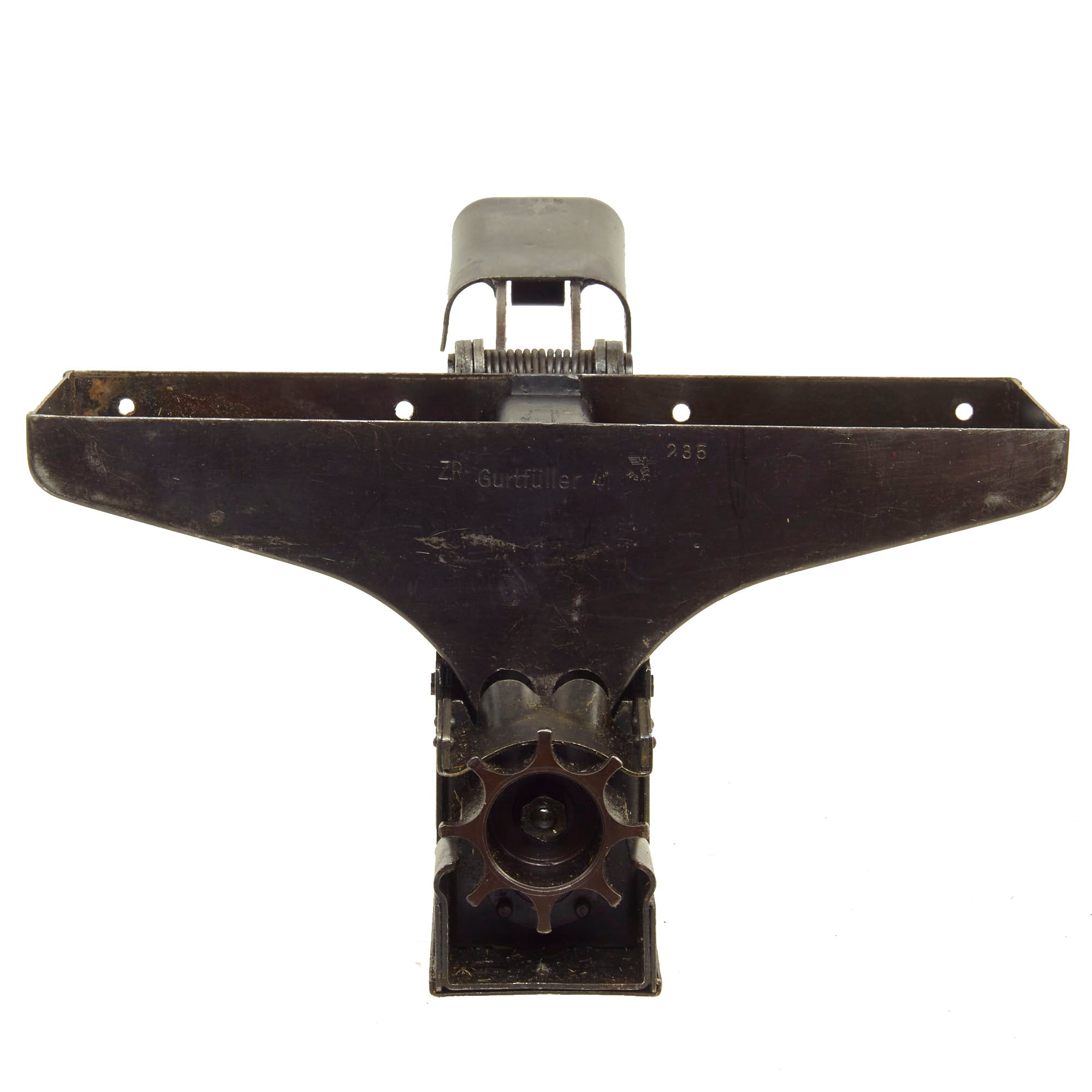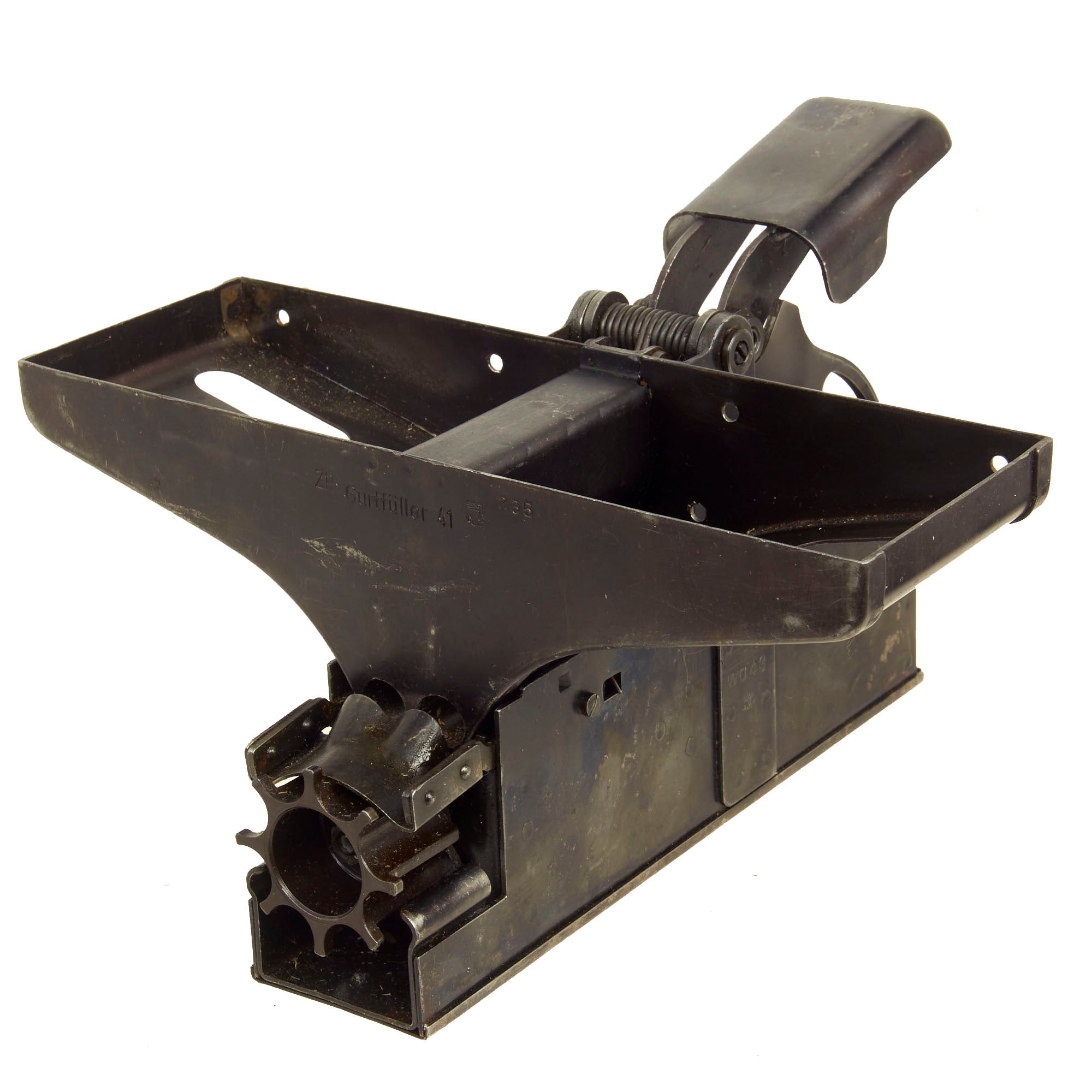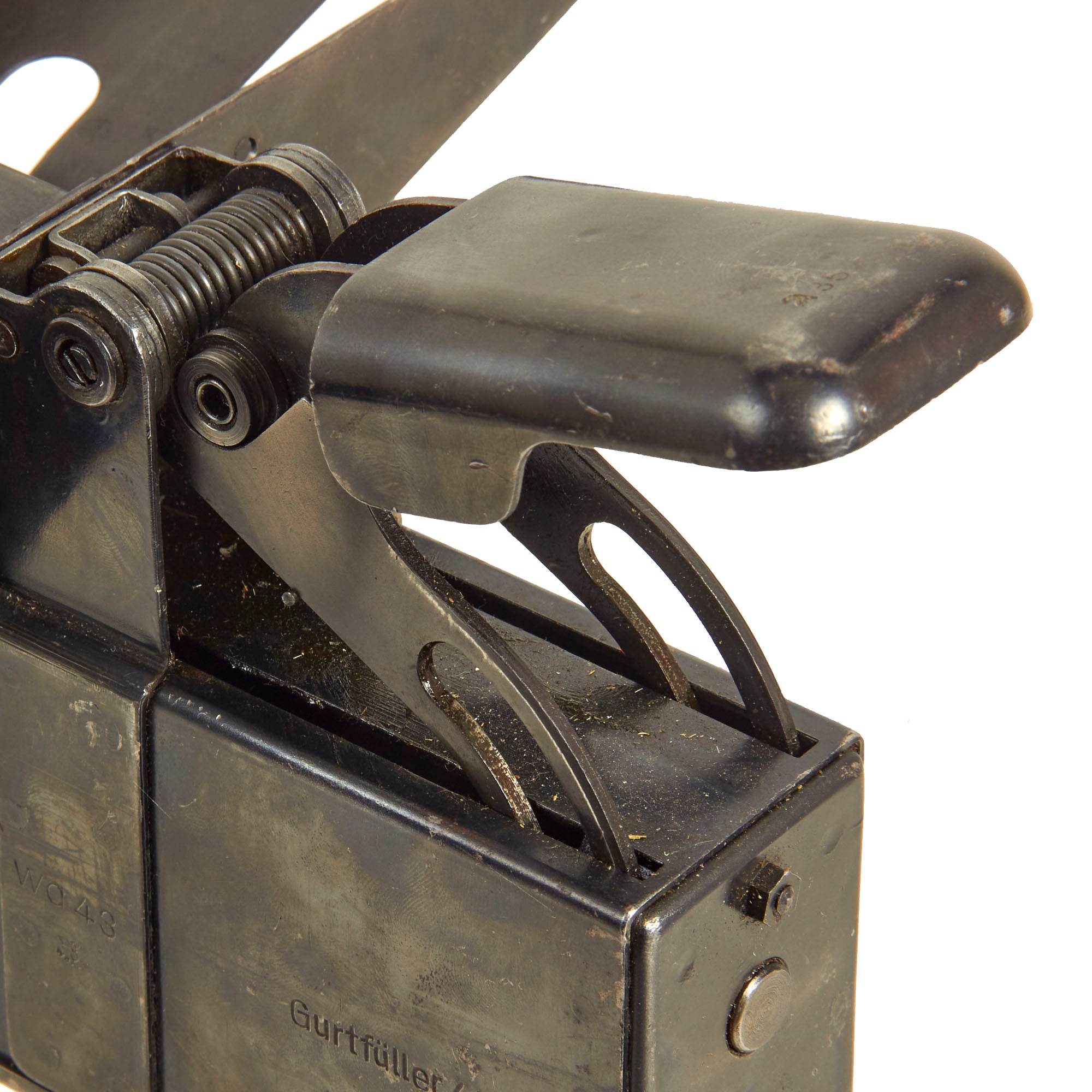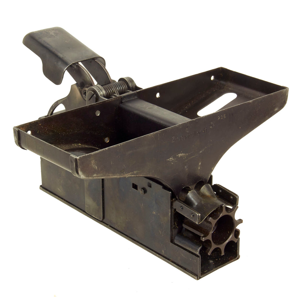 Original Item: Only One Available. Now this is a lovely piece of WWII German machine gun history. This item actually answers a lot of questions people have about how ammunition belts are loaded and reloaded with rounds. This stapler looking device has a hopper on top which feeds the 7.92×57mm Mauser ammunition down into the “chamber” to be pressed into the ammunition links that are fitted to the tray. The user then presses down the handle until the belt is full and then repeats the process until they reach the desired amount of ammo belts needed. Quite a simple and ingenious little device!
