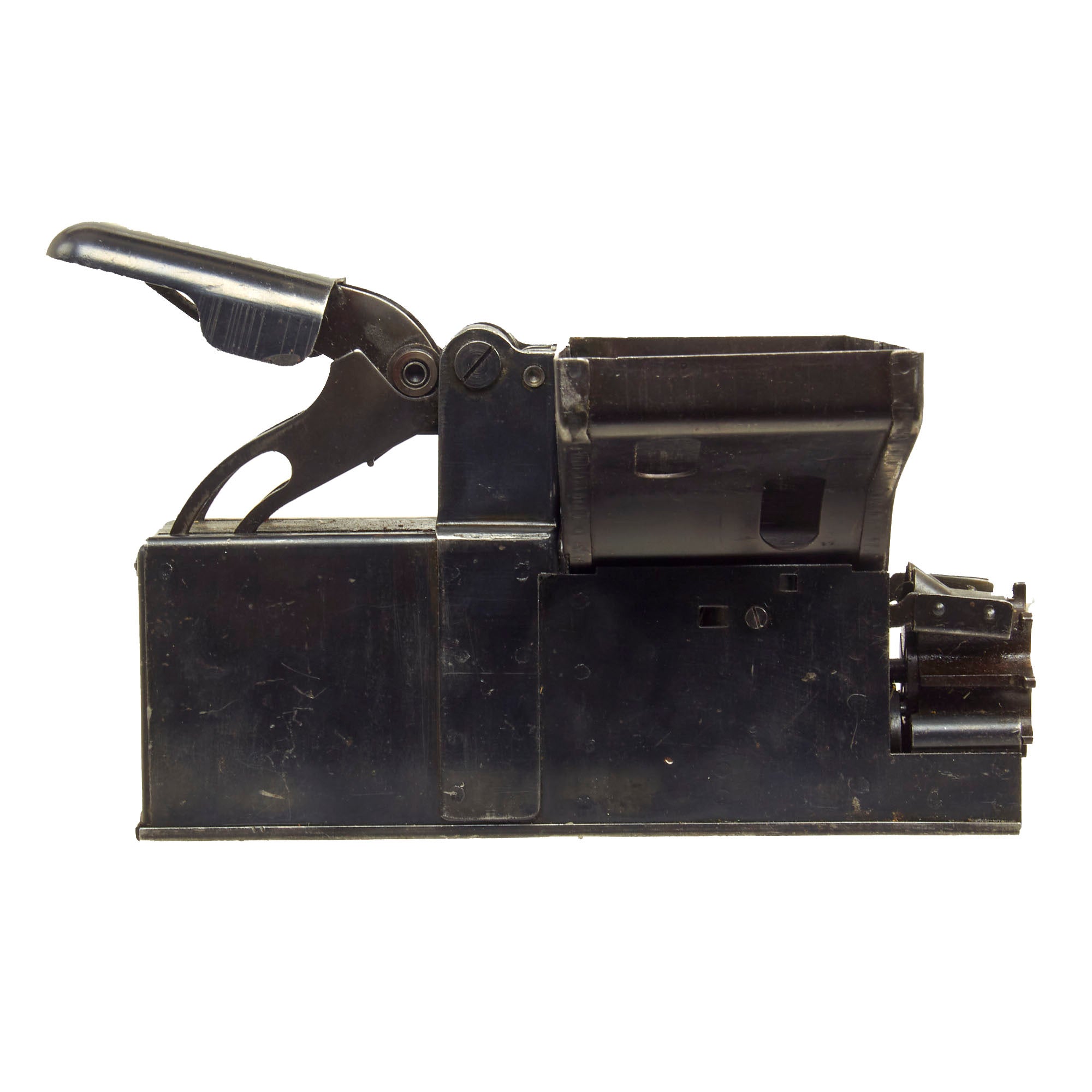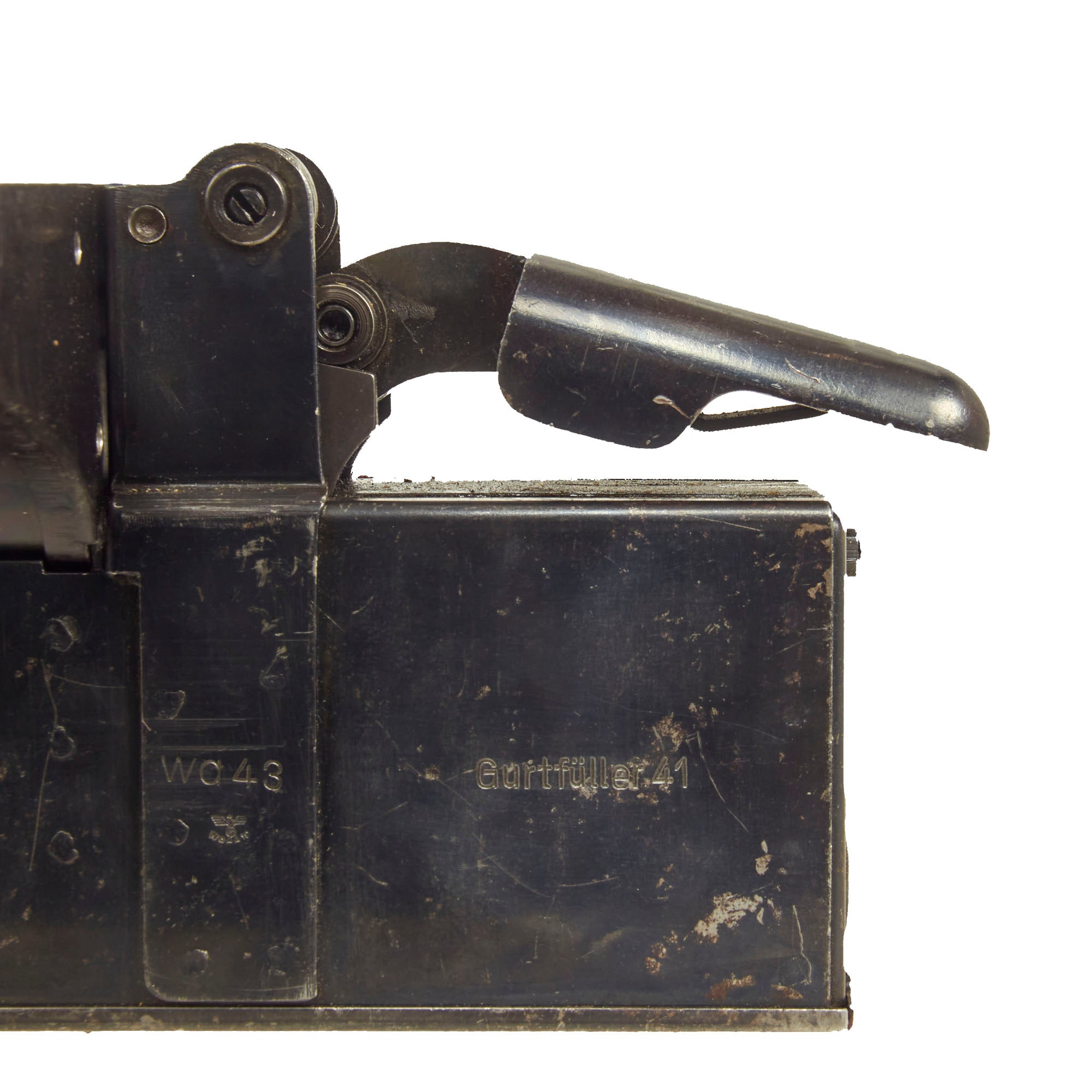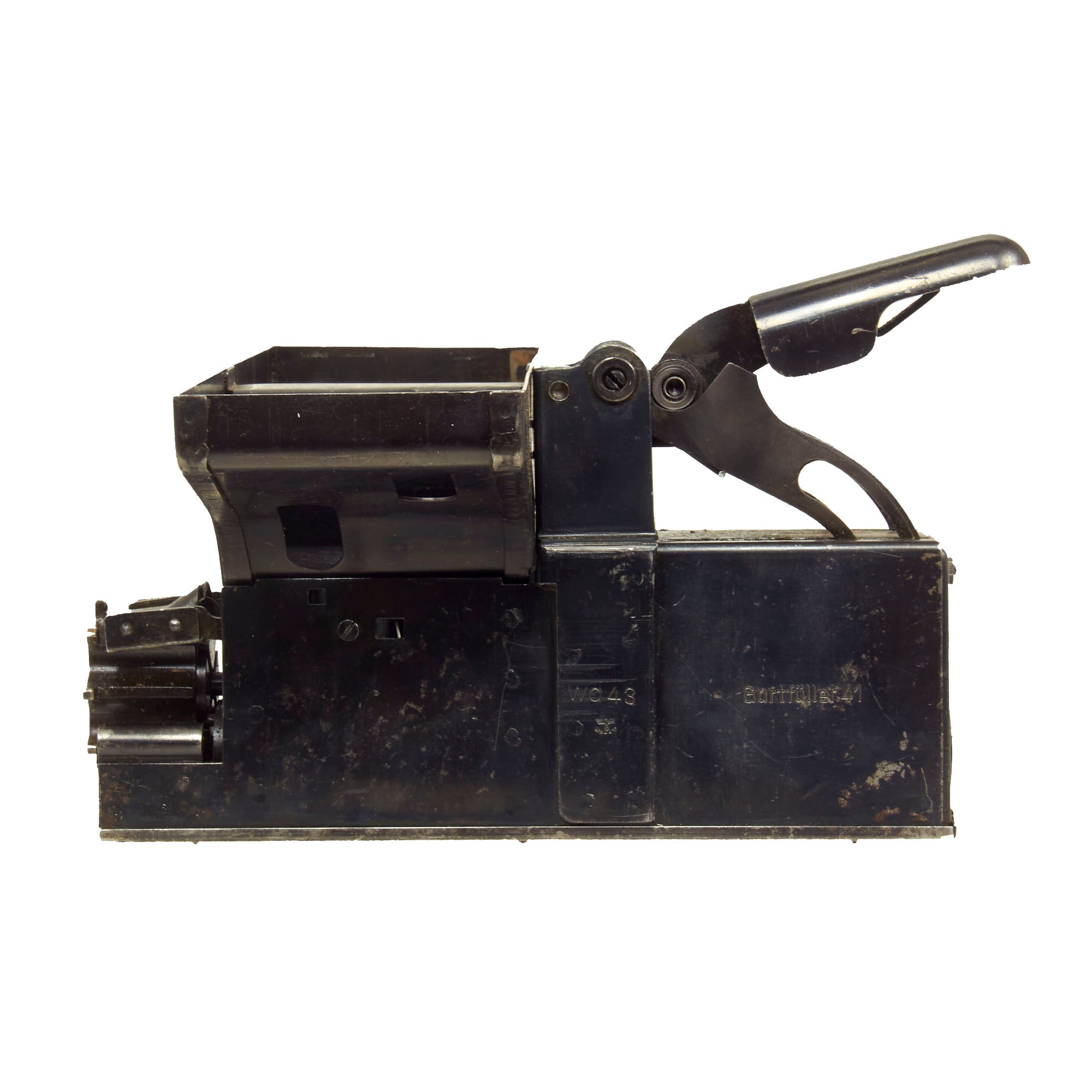 Original Item: Only One Available. Now this is a lovely piece of WWII German machine gun history. This item actually answers a lot of questions people have about how ammunition belts are loaded and reloaded with rounds. This stapler looking device has a hopper on top which feeds the 7.92×57mm Mauser ammunition down into the “chamber” to be pressed into the ammunition links that are fitted to the tray. The user then presses down the handle until the belt is full and then repeats the process until they reach the desired amount of ammo belts needed. Quite a simple and ingenious little device!