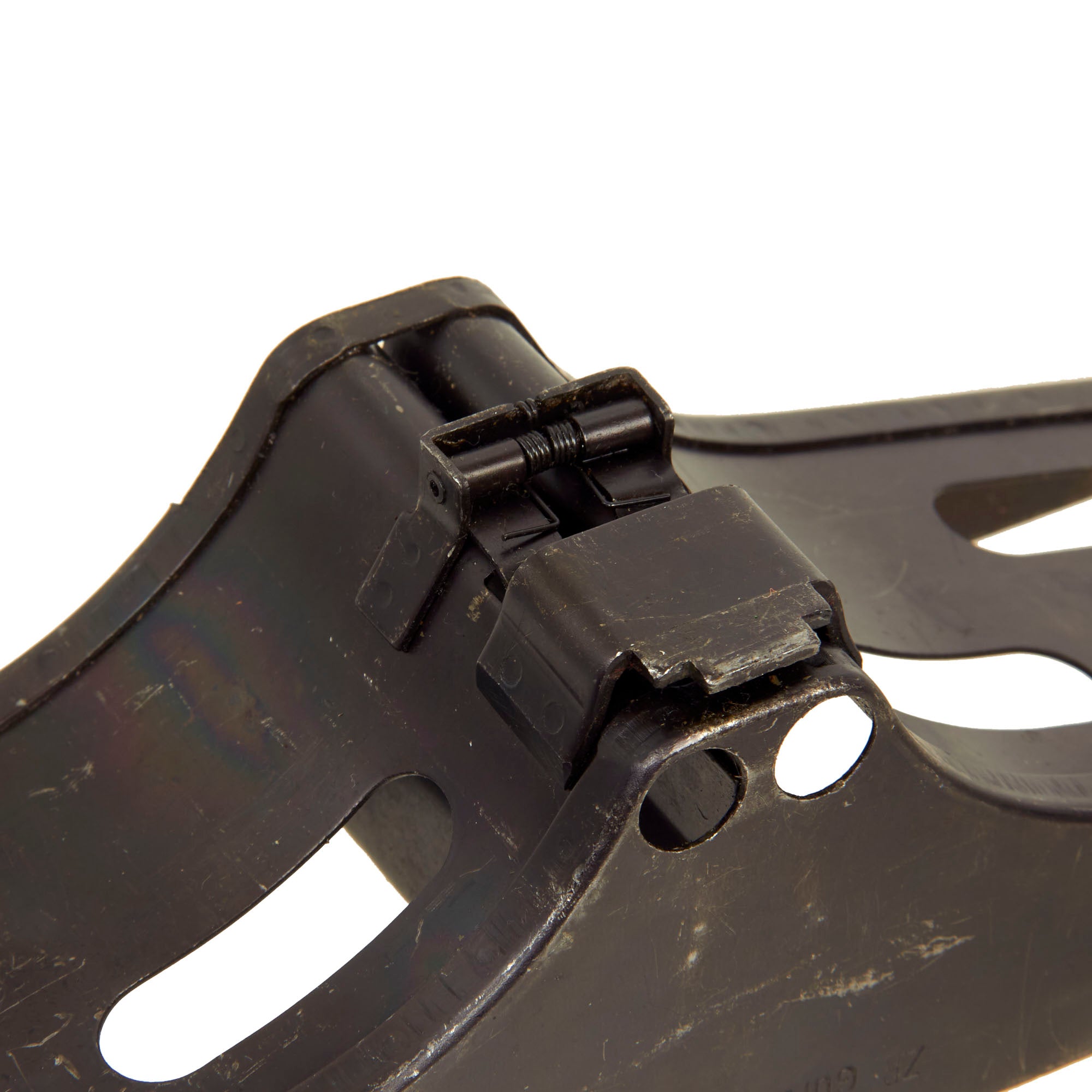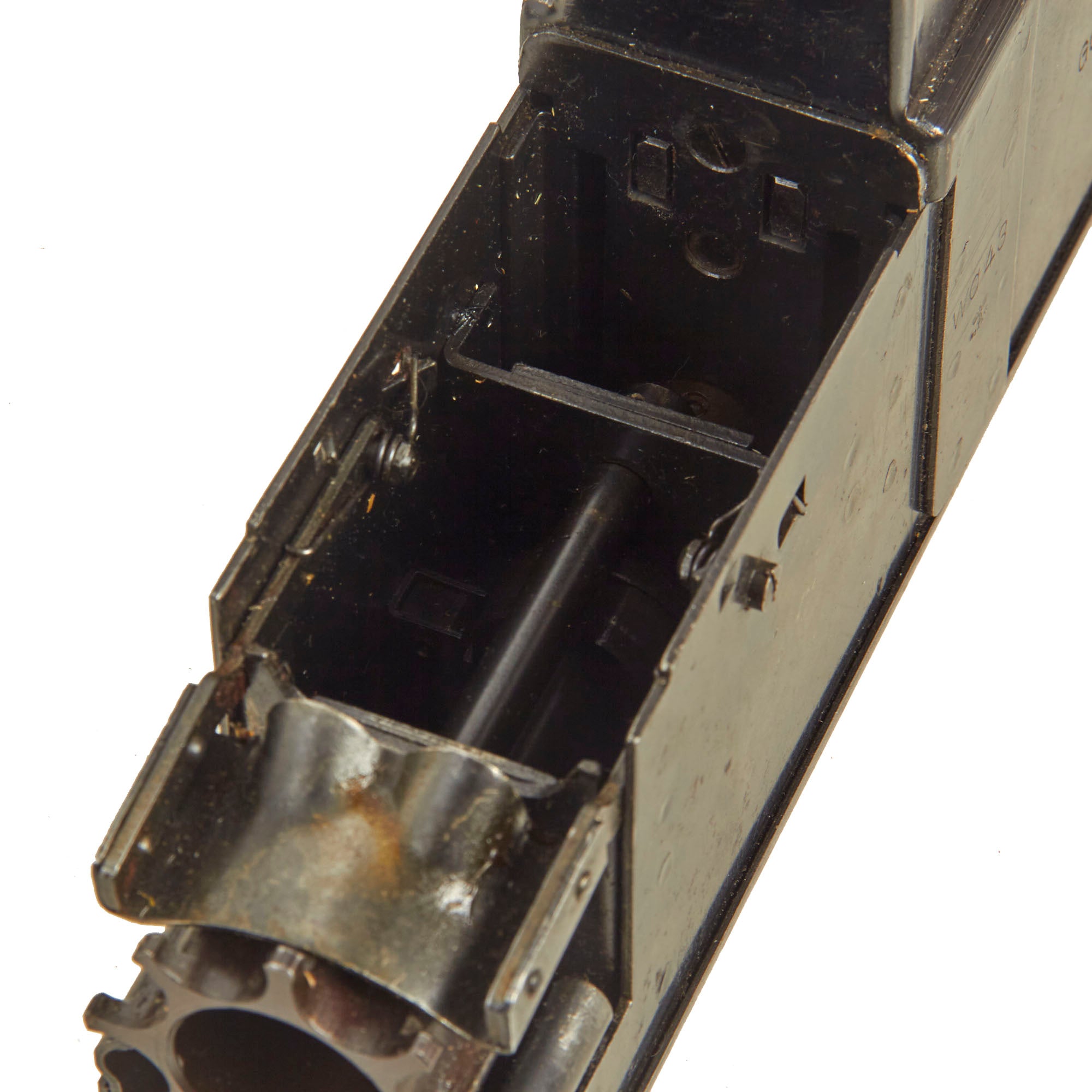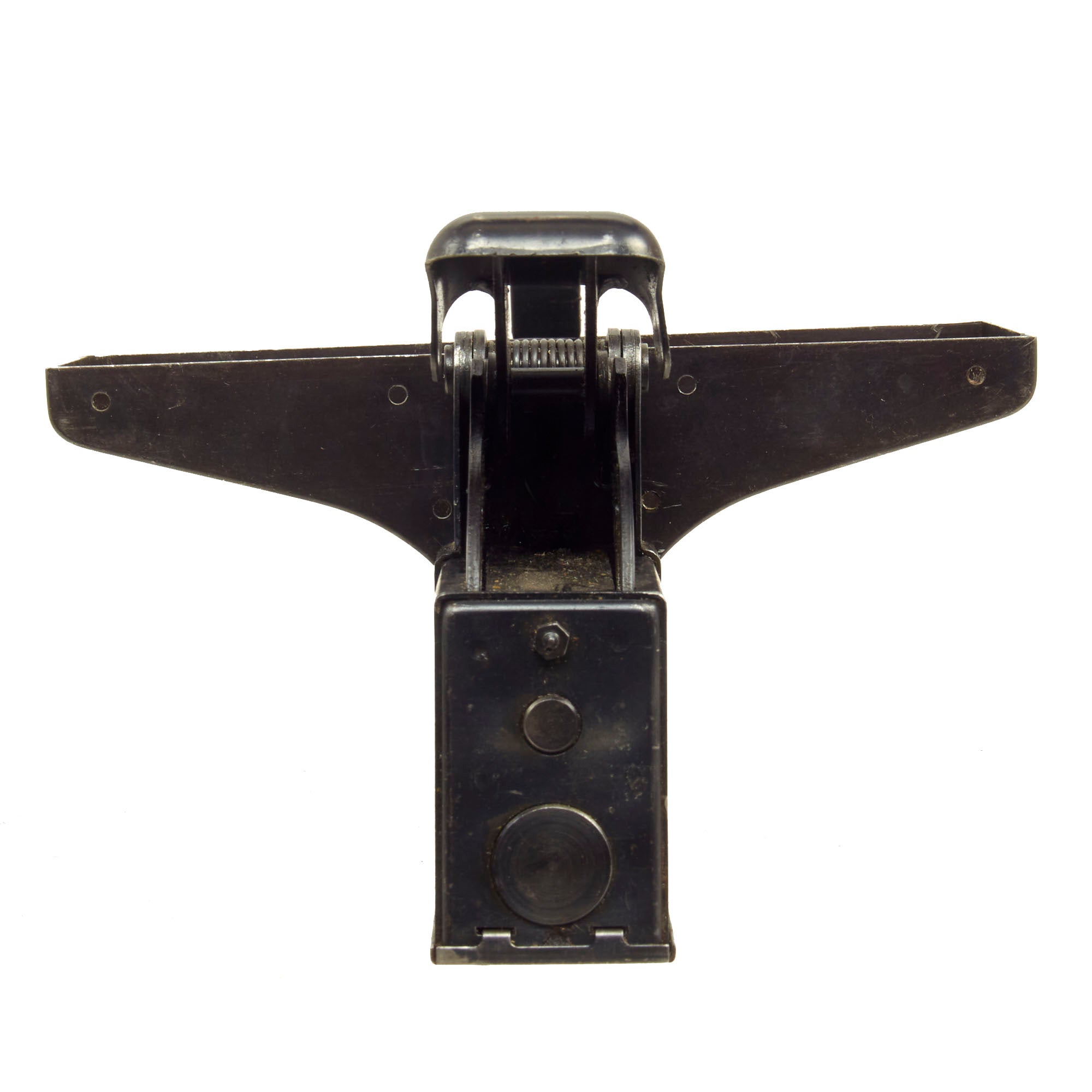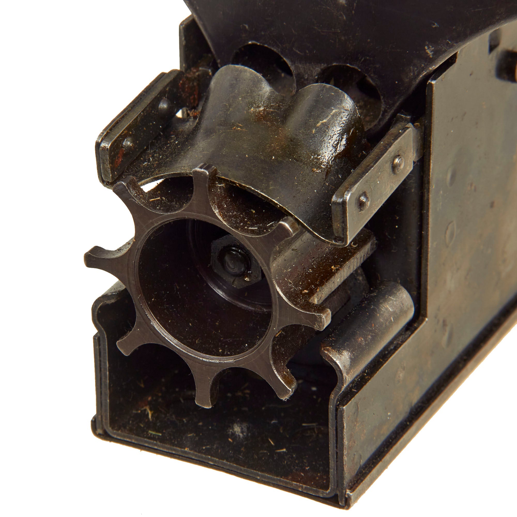 Original Item: Only One Available. Now this is a lovely piece of WWII German machine gun history. This item actually answers a lot of questions people have about how ammunition belts are loaded and reloaded with rounds. This stapler looking device has a hopper on top which feeds the 7.92×57mm Mauser ammunition down into the “chamber” to be pressed into the ammunition links that are fitted to the tray. The user then presses down the handle until the belt is full and then repeats the process until they reach the desired amount of ammo belts needed. Quite a simple and ingenious little device!