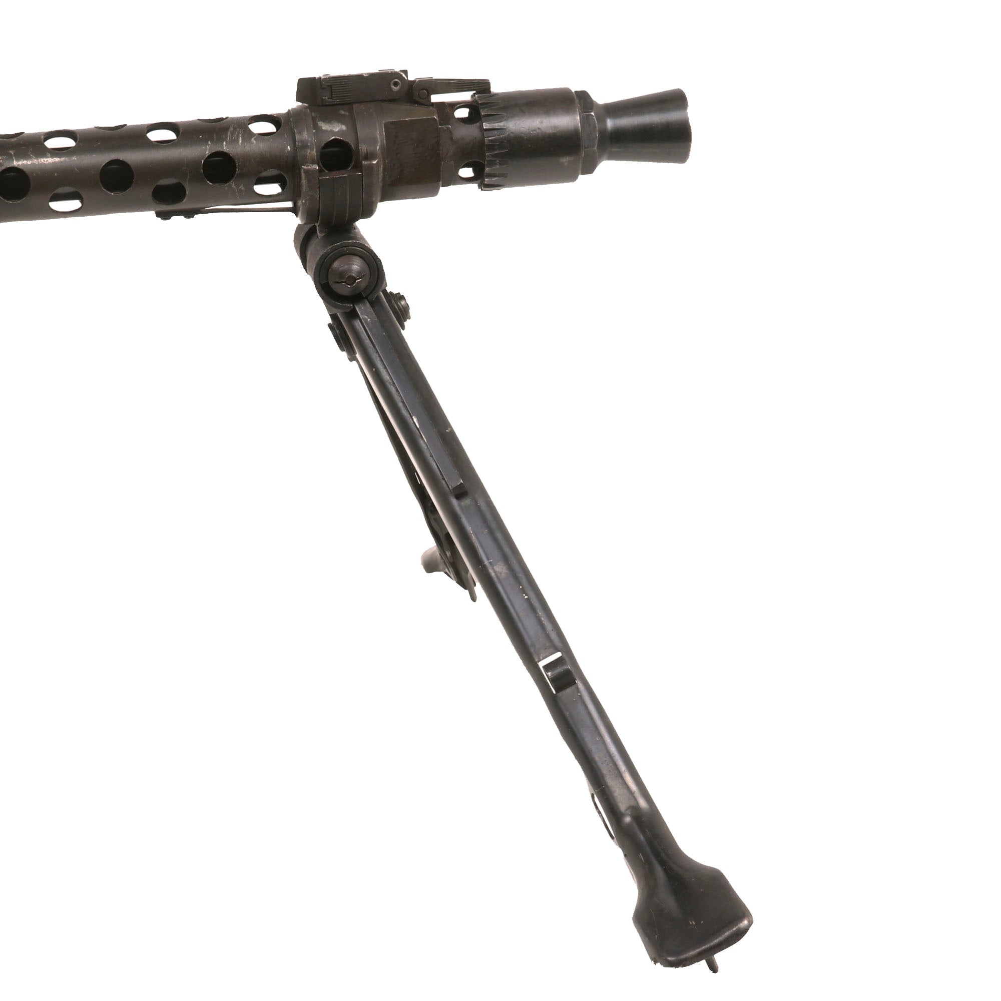 Original Item: Only One available. Constructed from a legally demilitarized (de-milled) parts set, this is a wonderful and rare German WWII MG 34 Display Machine Gun. It is built from all original parts on an original BATF compliant non-firing display receiver, making this a 100% legal display machine gun. This receiver was created by using portions of the original torch cut receiver, including the barrel bushing, combined with some new made steel portions. It has properly had a 25% section of the total length completely replaced entirely with solid steel bar stock. Meaning a 1/4 length section of the display receiver is solid steel, making this legal to own without a license of any kind. We have also included a basket belt drum painted black over post war apple green to complete the look.