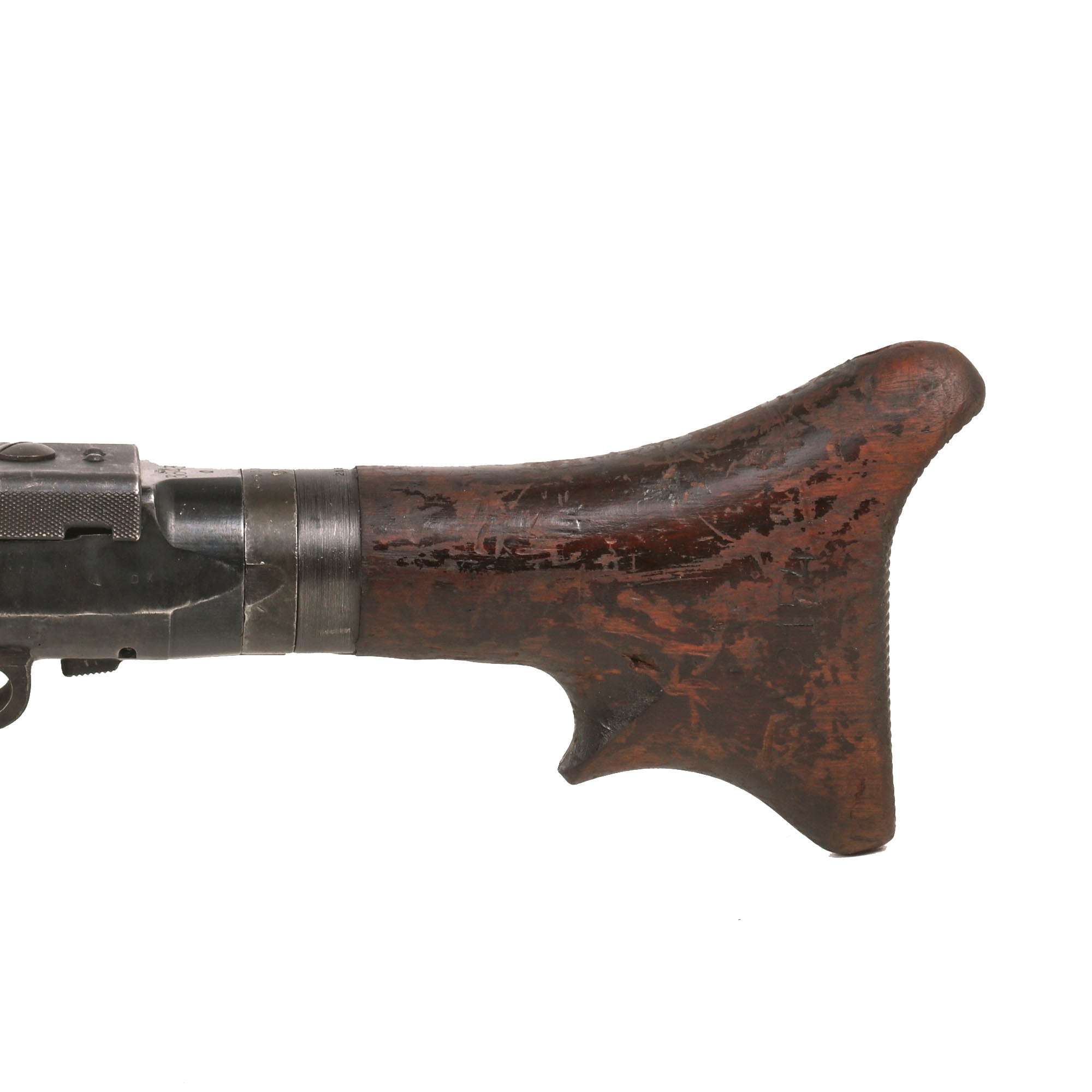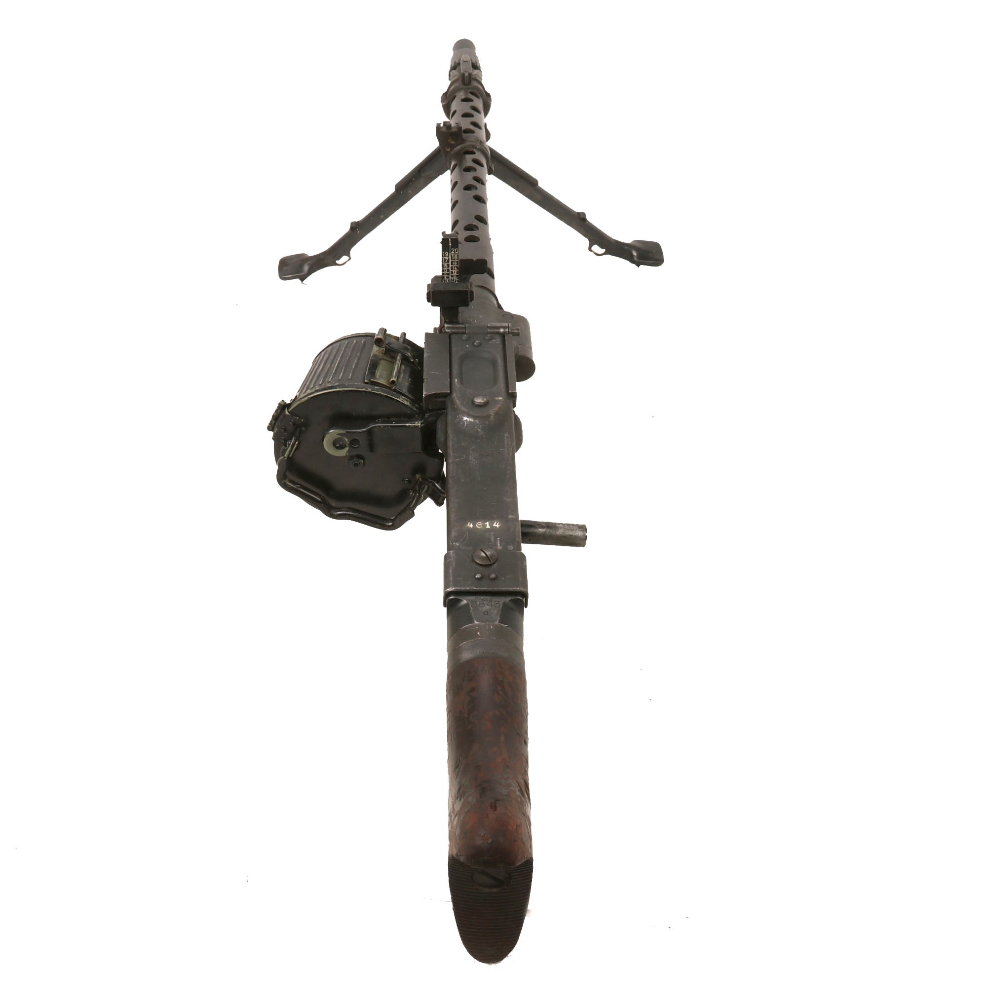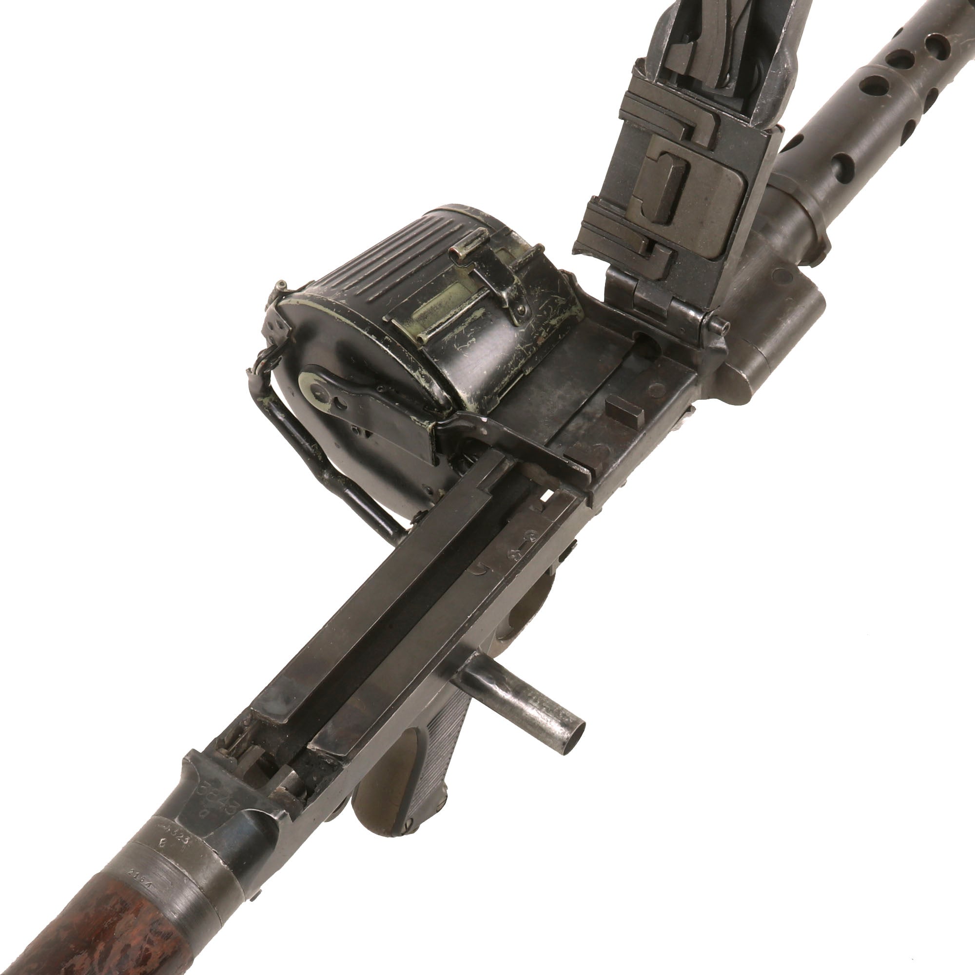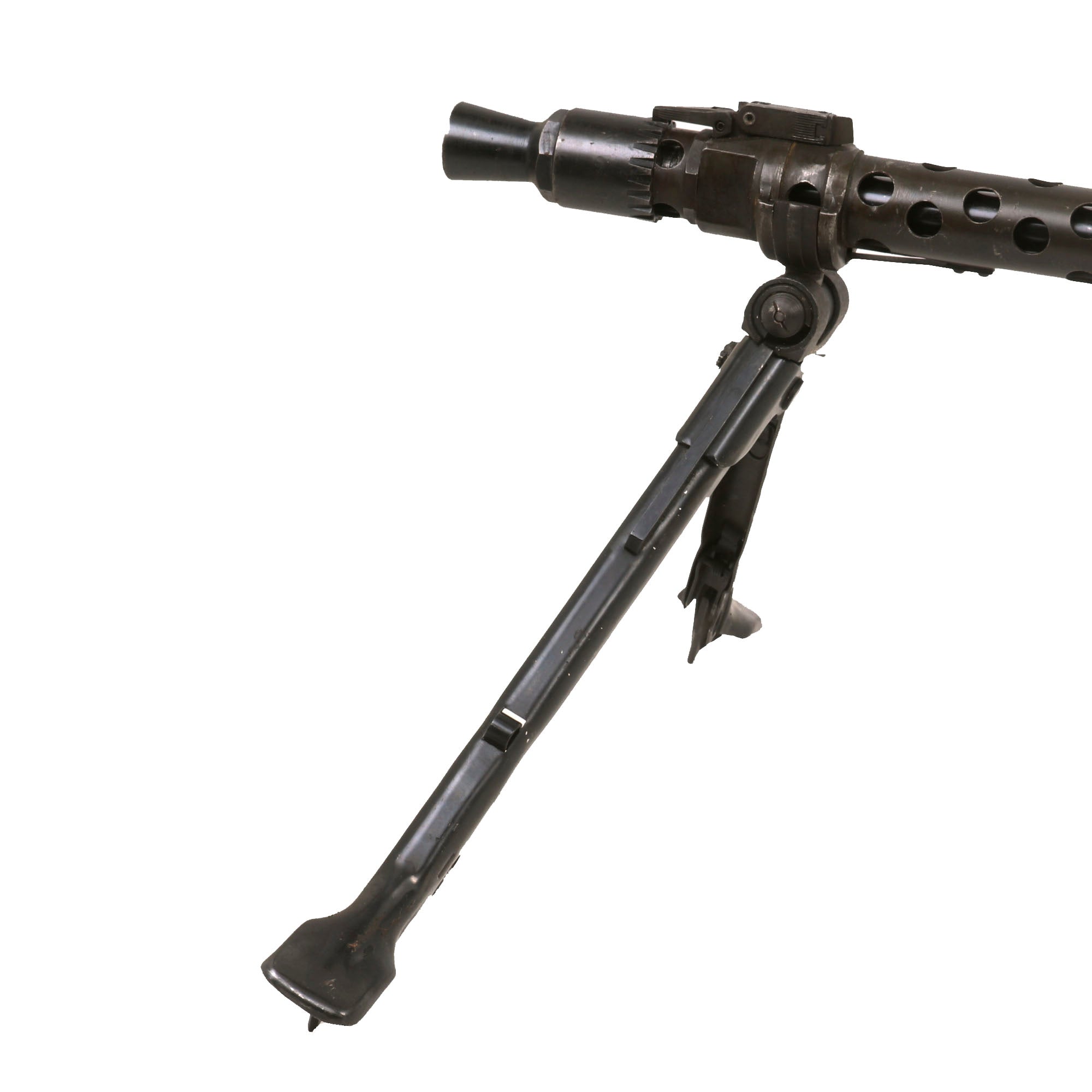 This is one of our original WWII issue MG34 display machine guns. It is coded along with multiple German wartime markings and has multiple Waffenamts. It bears original serial number 6943 / b, along with dot / 1945 for manufacture by Waffenwerke Brünn in Czechoslovakia. This factory was the famous Zbrojovka Brno in Brno, Czechoslovakia before being captured by Germany during WWII. There are serial numbers and German proof marks on many other parts of the display gun.