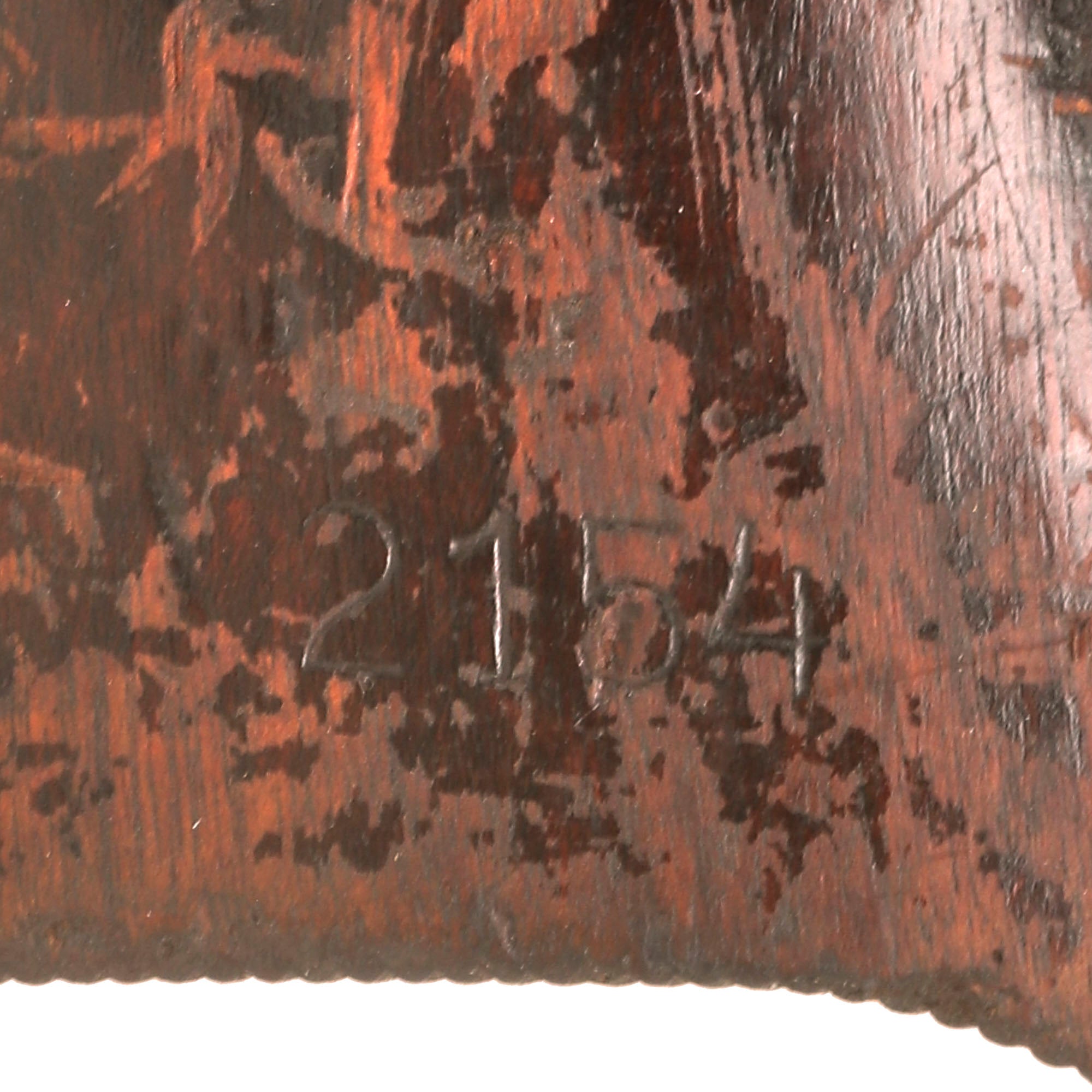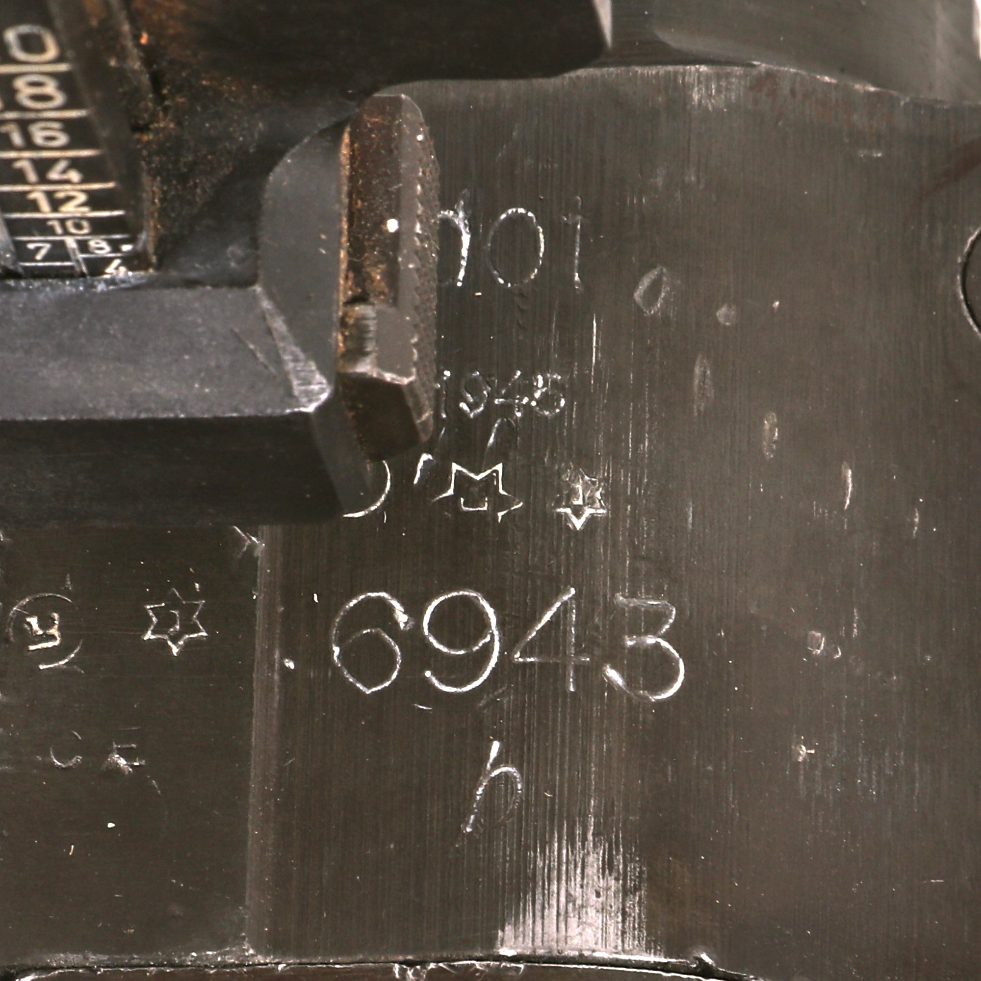 The top cover is some what worn and crudely made, so it may be from the very late production era. We are not able to see any maker markings, but it doe still have serial number 4614 easily visible. The feed tray is marked with cof for Carl Eickhorn of Solingen, a legendary manufacturer of edged weapons, and a known make of top covers, feed trays, and other MG 42 components. There really are some great markings on this very fine example of the most prolific German issued Light Machine gun of WWII, with lots of potential for research.