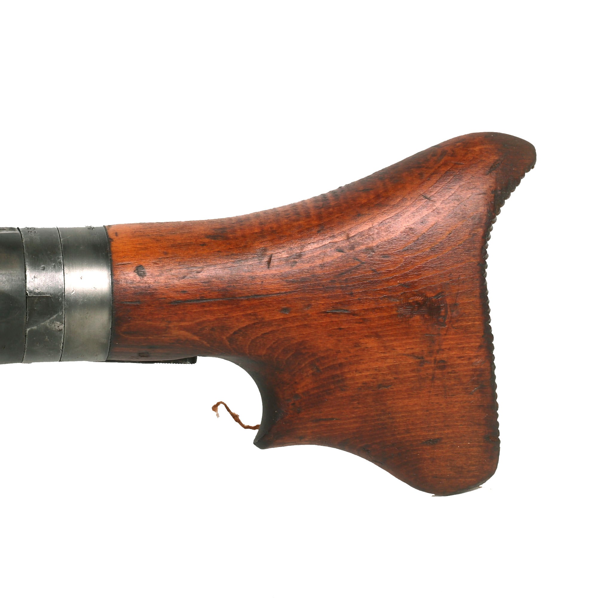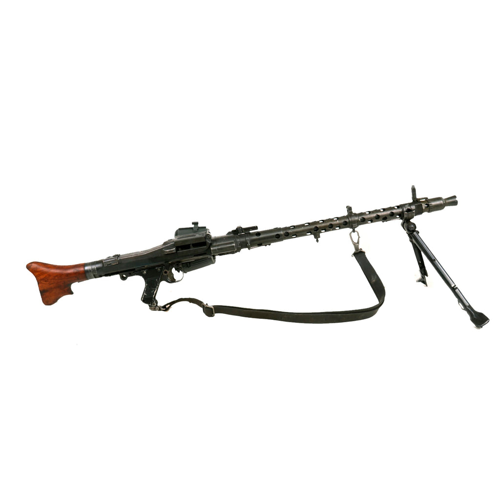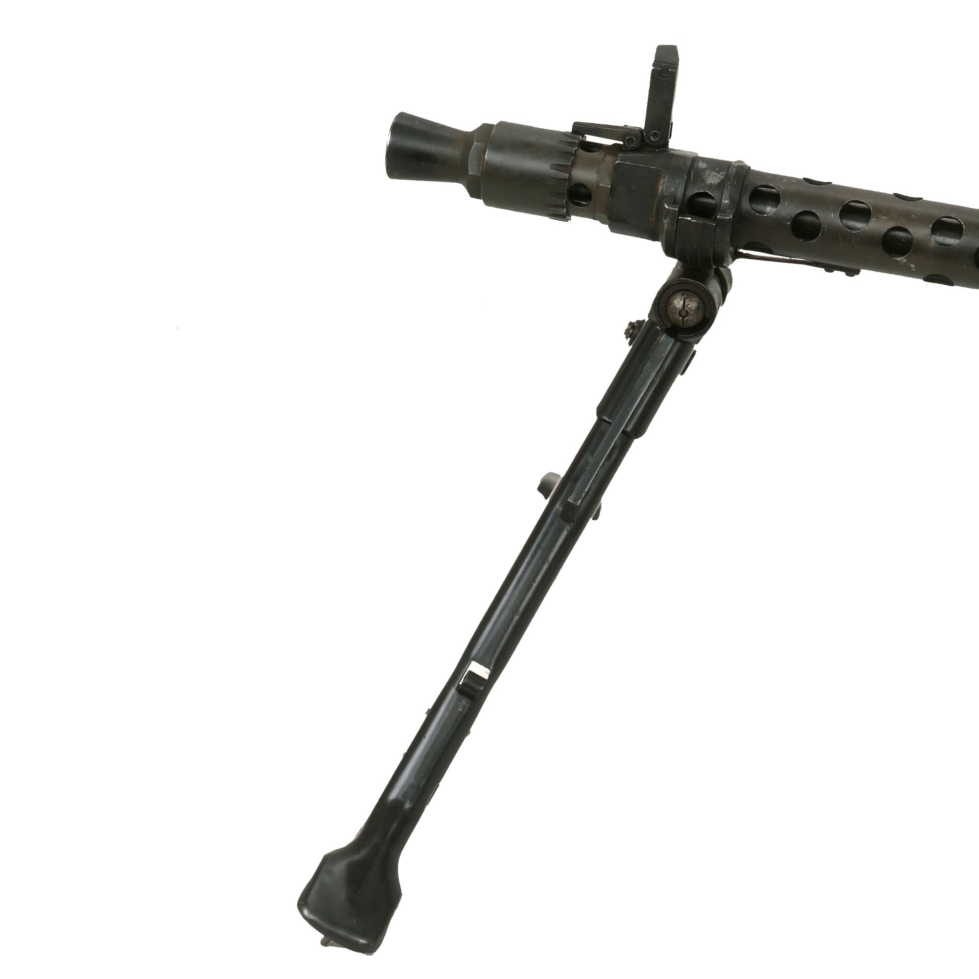 Original Item: Only One available. Constructed from a legally demilitarized (de-milled) parts set, this is a wonderful and rare German WWII MG 34 Display Machine Gun. It is built from all original parts on an original BATF compliant non-firing display receiver, making this a 100% legal display machine gun. This receiver was created by using portions of the original torch cut receiver, including the barrel bushing, combined with some new made steel portions. It has properly had a 25% section of the total length completely replaced entirely with solid steel bar stock. Meaning a 1/4 length section of the display receiver is solid steel, making this legal to own without a license of any kind. We have also included a basket belt drum carrier painted with our Panzergrau (Armor Gray) paint to complete the look.