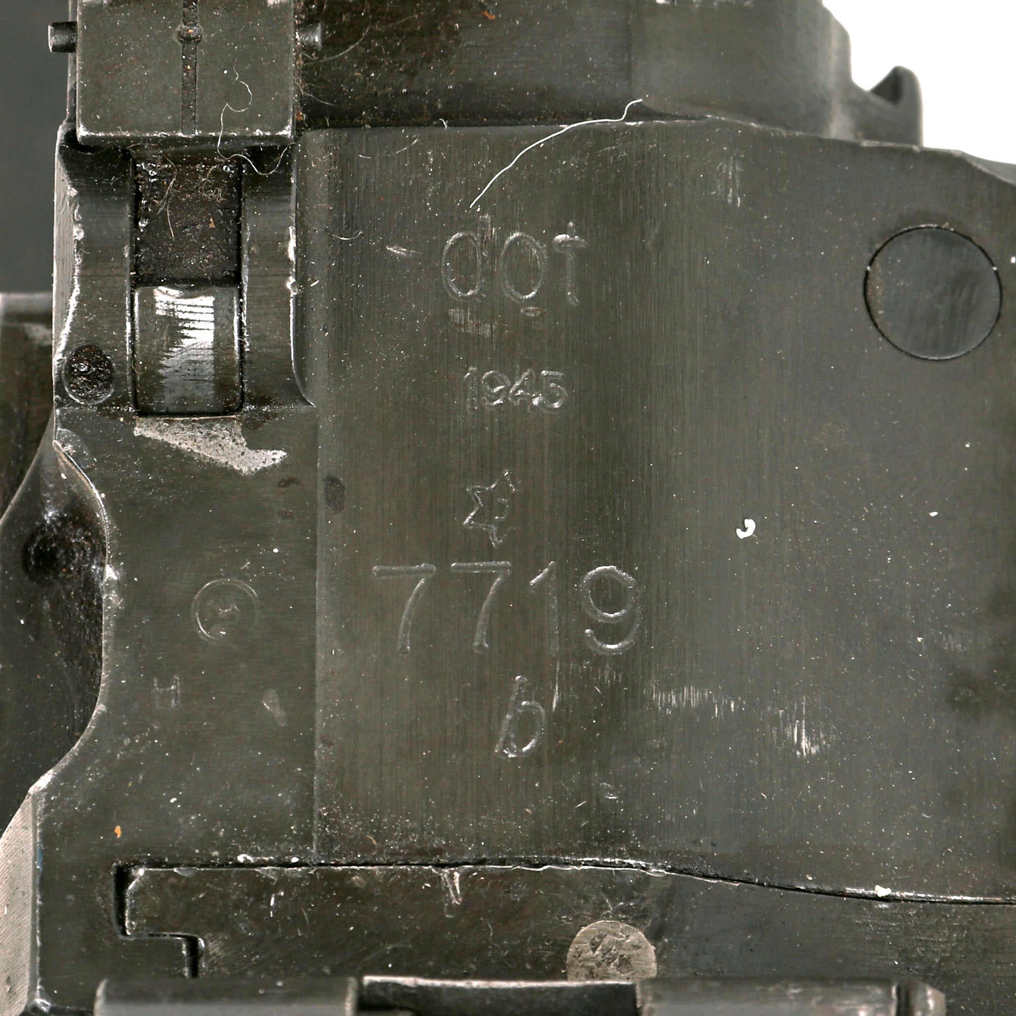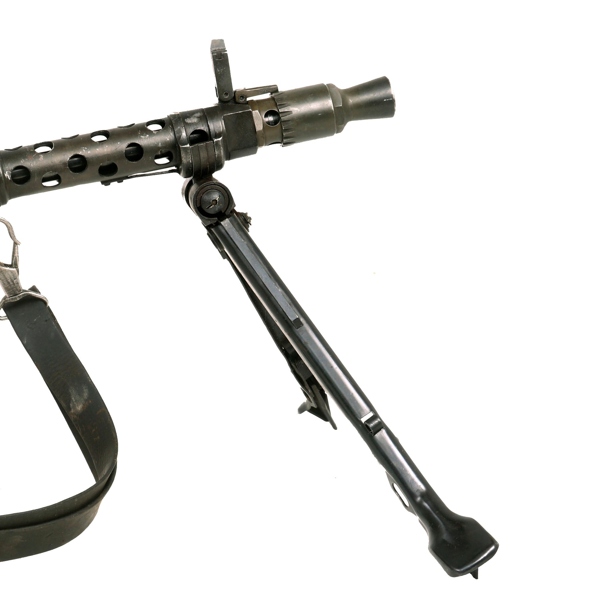 This is one of our original WWII issue MG34 display machine guns. It is coded along with multiple German wartime markings and has multiple Waffenamts. It bears original serial number 7719 / b on the barrel jacket, along with dot / 1945 for manufacture by Waffenwerke Brünn in Czechoslovakia. This factory was the famous Zbrojovka Brno in Brno, Czechoslovakia before being captured by Germany during WWII. The display gun comes complete with a post war issue leather sling for the MG 34 and MG 42, which is a more standard adjustable design.