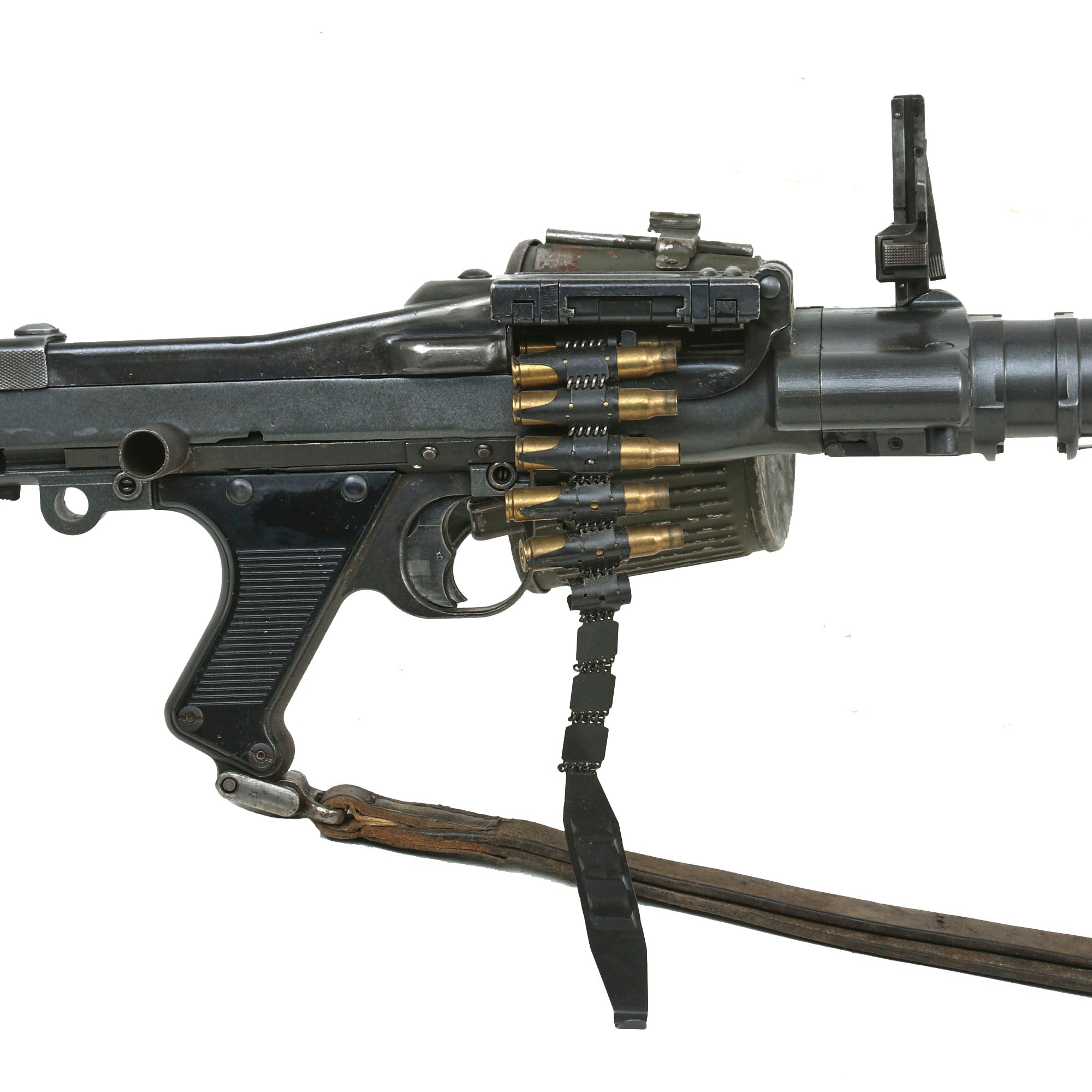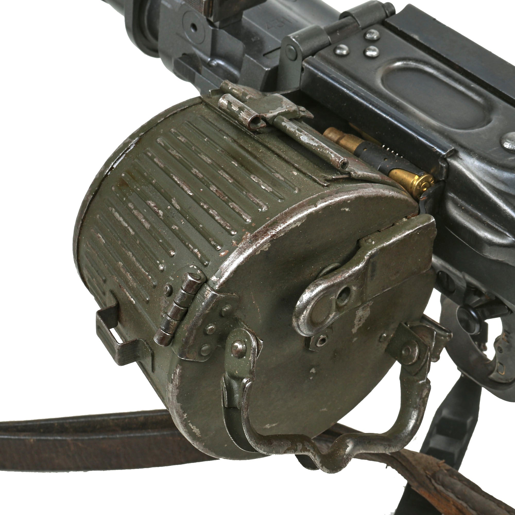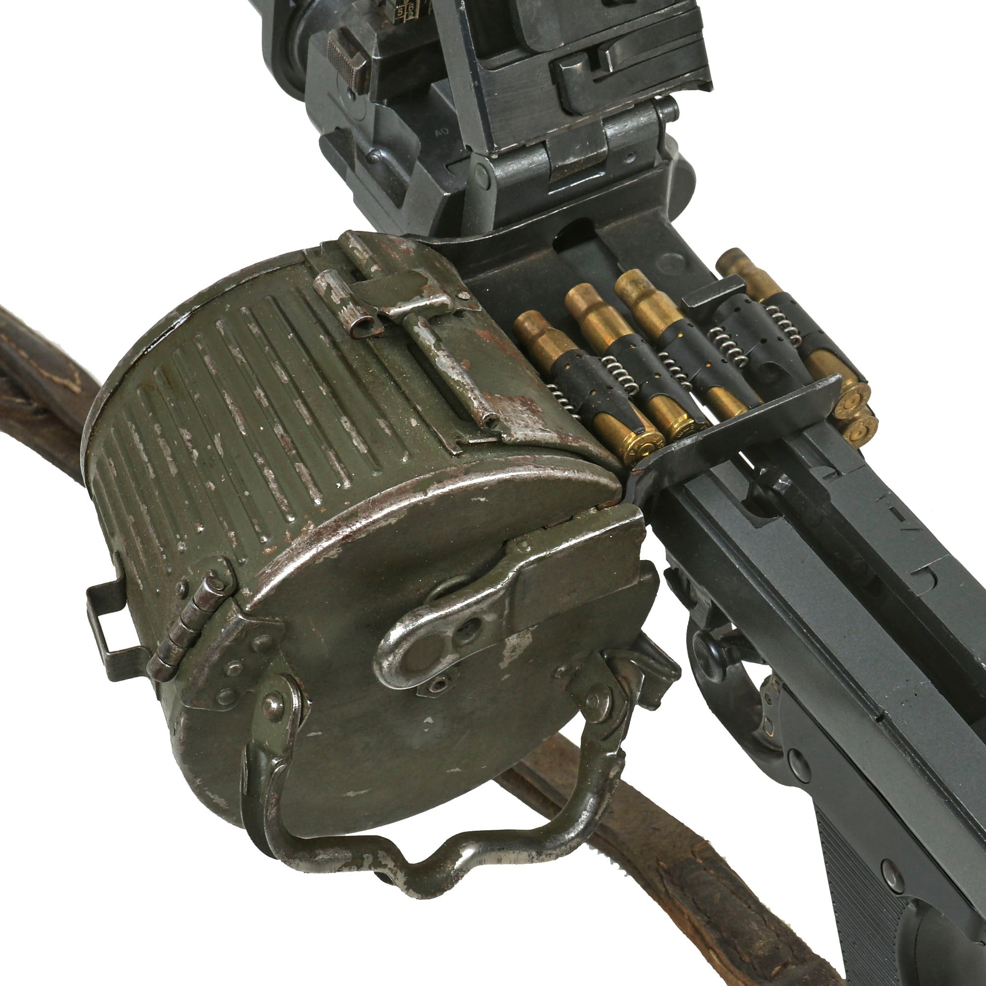 The display gun comes with an original basket belt drum carrier with original paint, which is filled with a 50 round ammo belt, starter tab, and inert empty shell casings, which are loaded in the belt. Even better, it comes with an original leather WWII issue sling, making for a fantastic display piece!