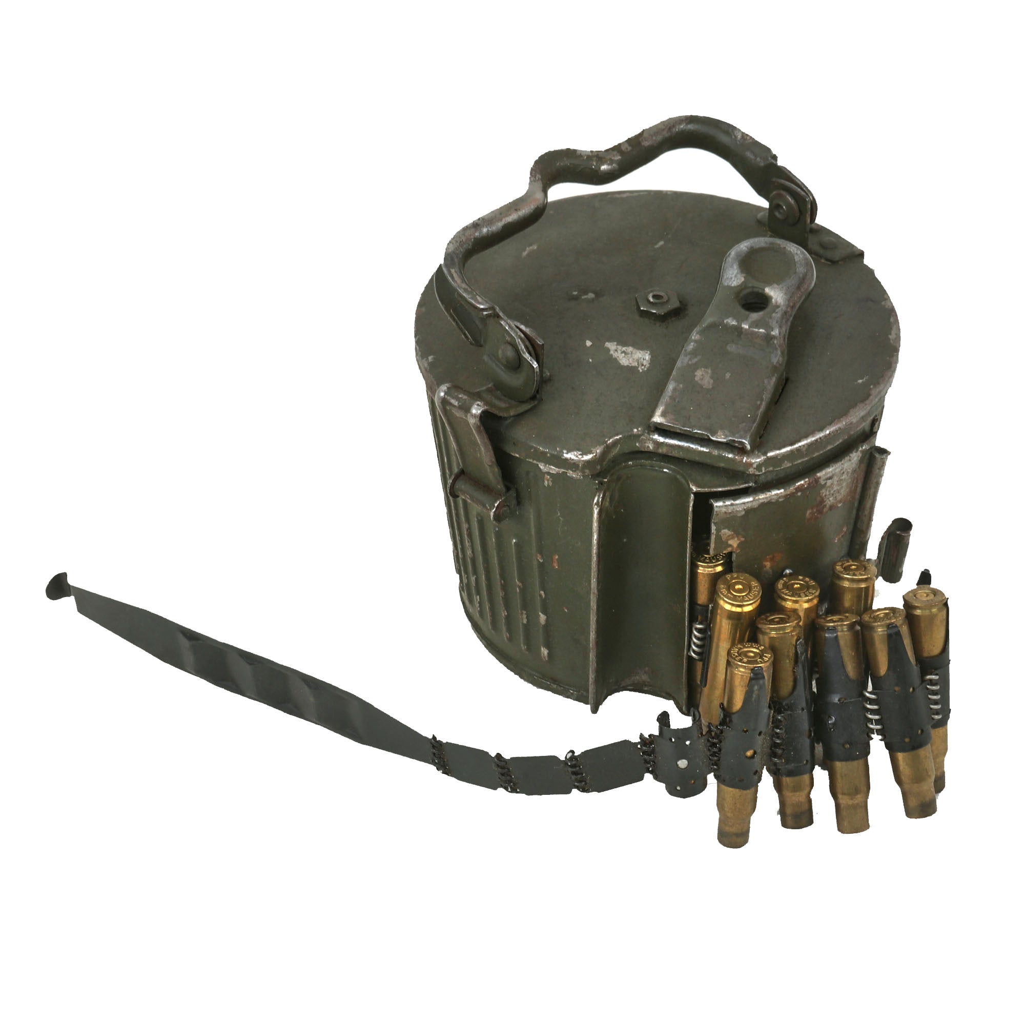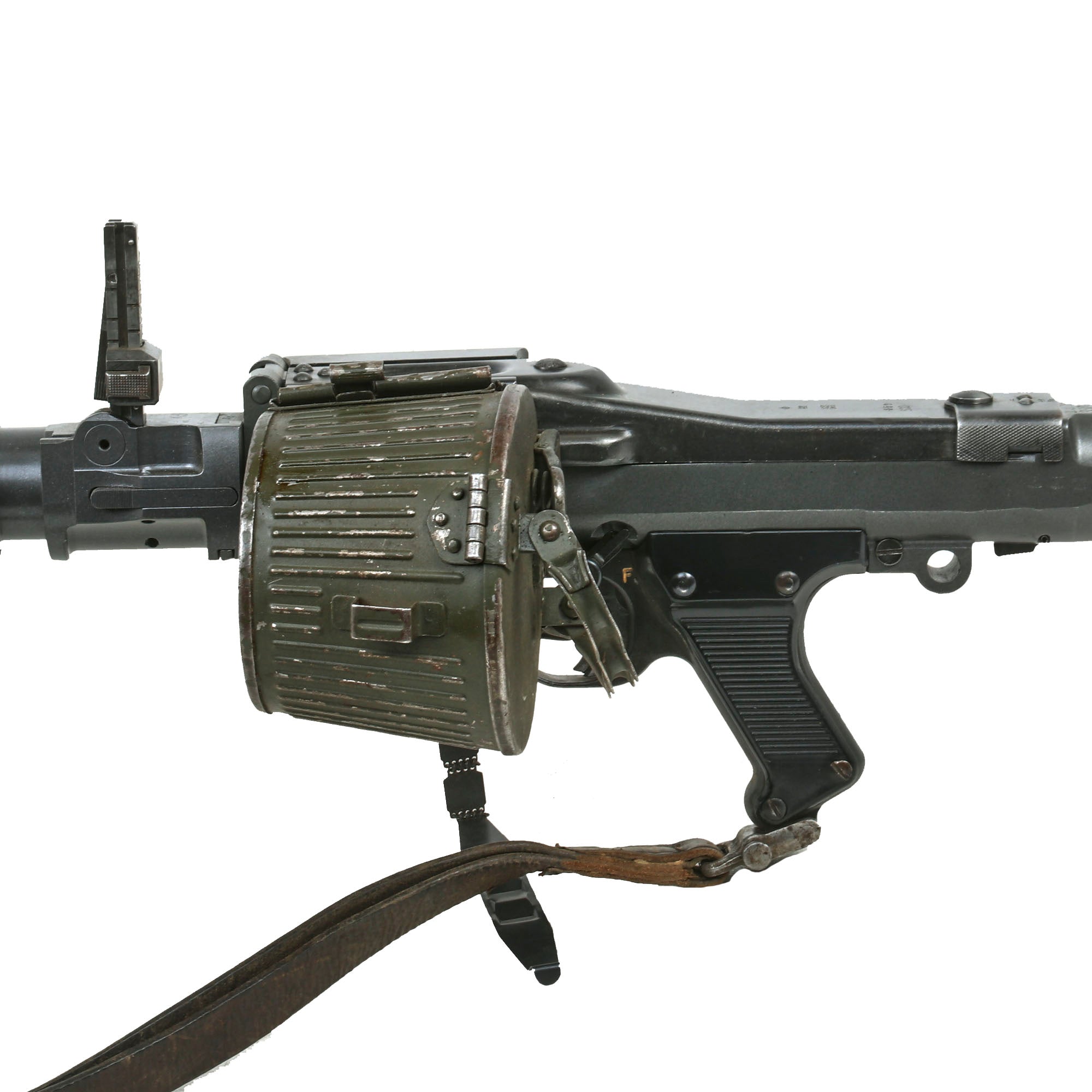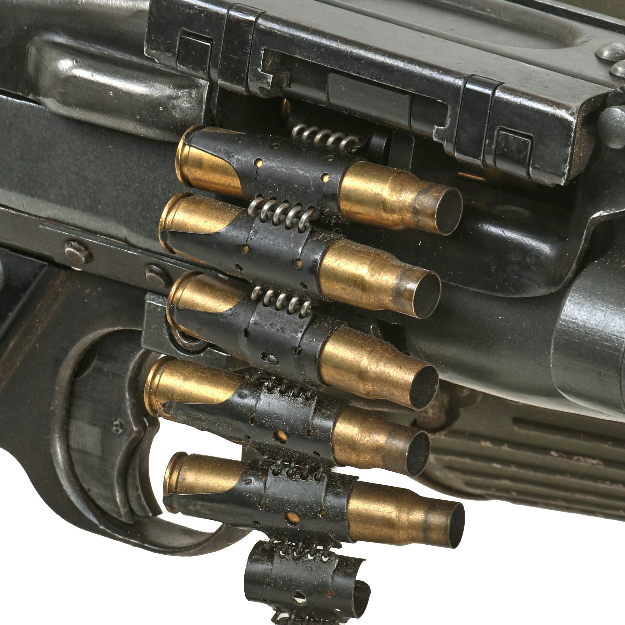 The display gun comes with an original basket belt drum carrier with original paint, which is filled with a 50 round ammo belt, starter tab, and inert empty shell casings, which are loaded in the belt. Even better, it comes with an original leather WWII issue sling, making for a fantastic display piece!
