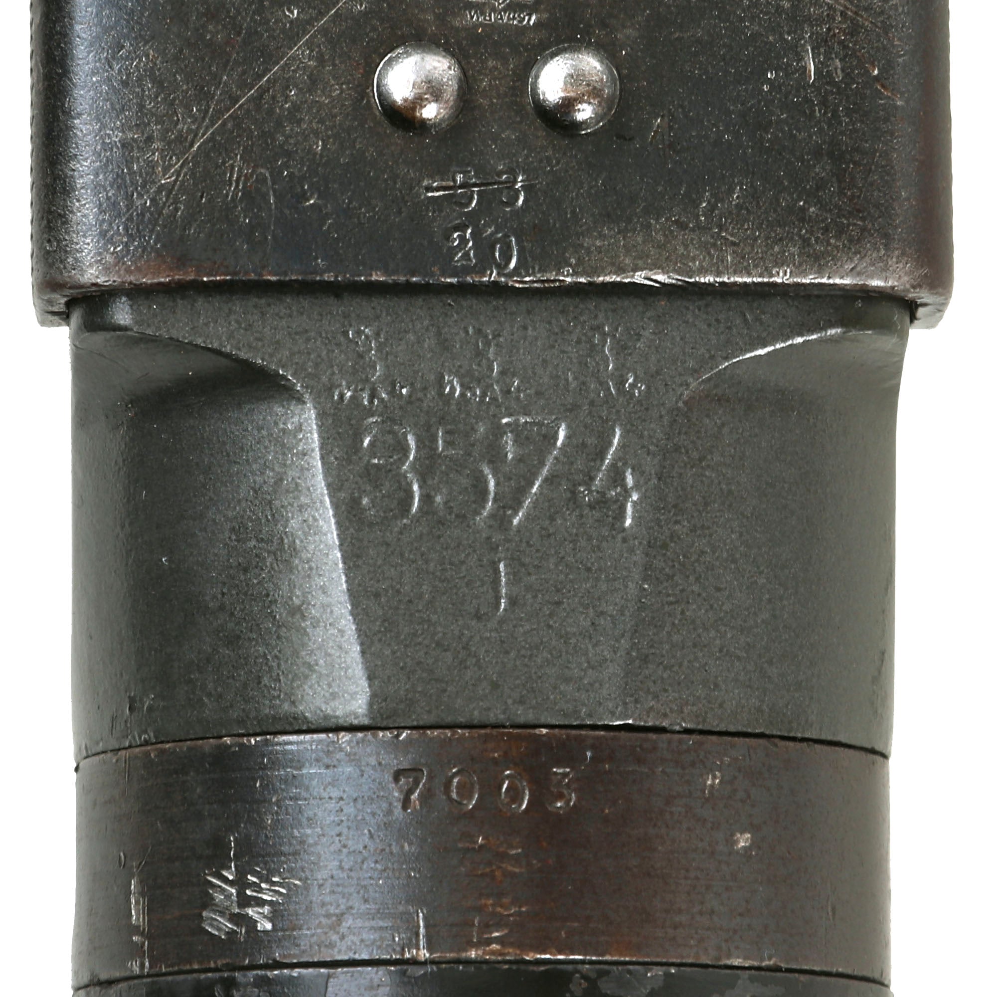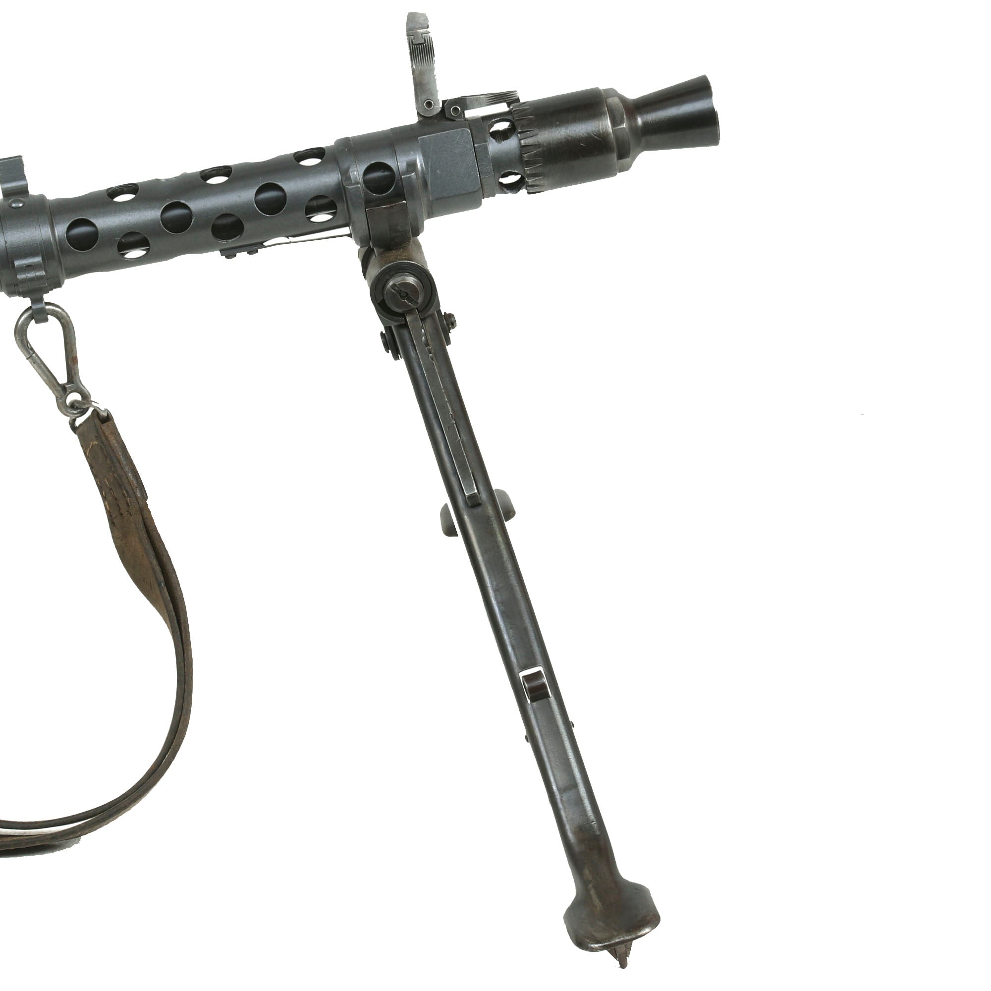 This is one of our original WWII issue MG34 display machine guns. It is coded along with multiple German wartime markings and has multiple Waffenamts. It bears original serial number 4331 / a, along with dot / 1943 for manufacture by Waffenwerke Brünn in Czechoslovakia. This factory was the famous Zbrojovka Brno in Brno, Czechoslovakia before being captured by Germany during WWII. The display gun comes complete with a very hard to find 2nd pattern Geteilte Trageriemen (Divided carrying sling), with a wider buckle to accommodate both the MG 34 and MG 42 grip. There are serial numbers and German proof marks on many other parts of the display gun.