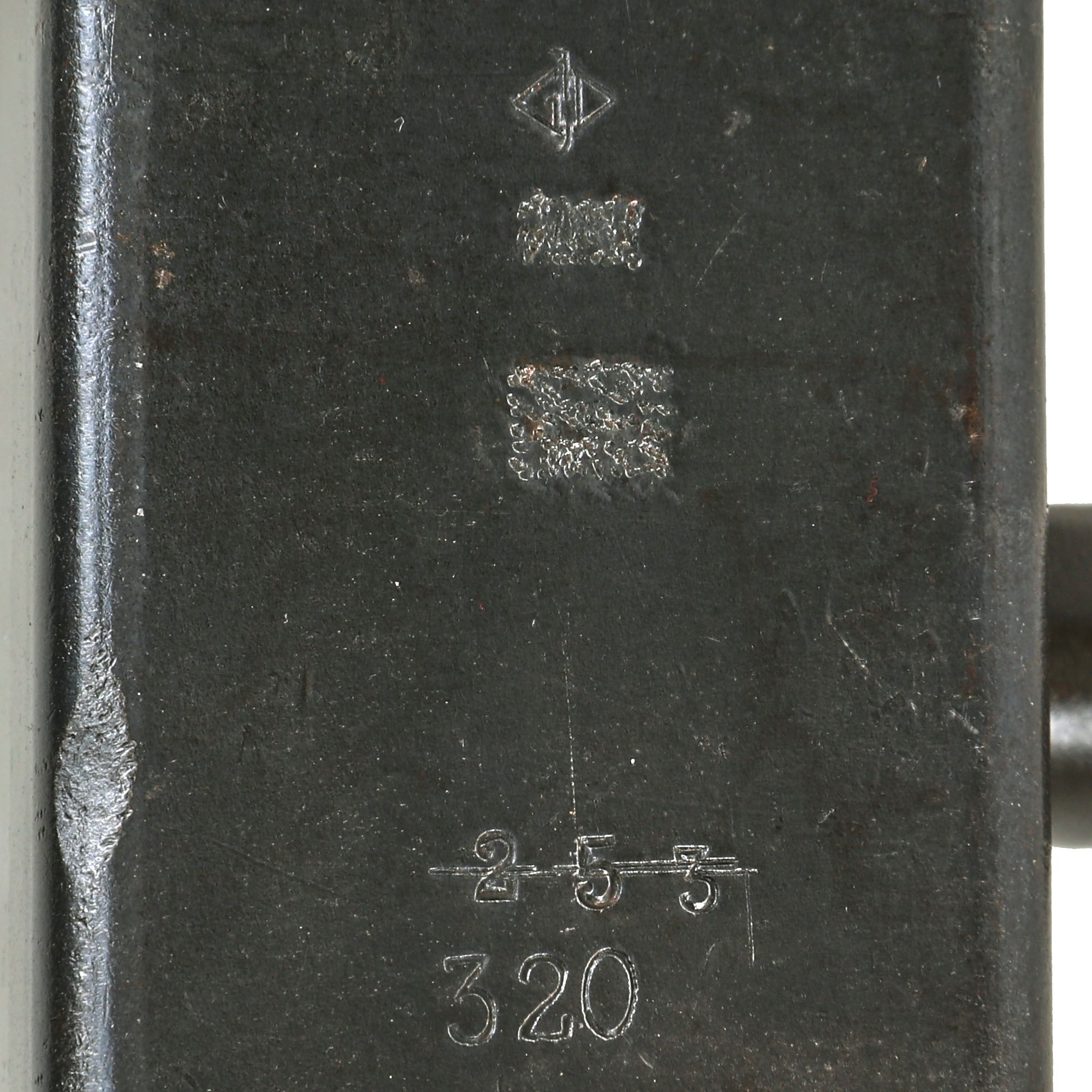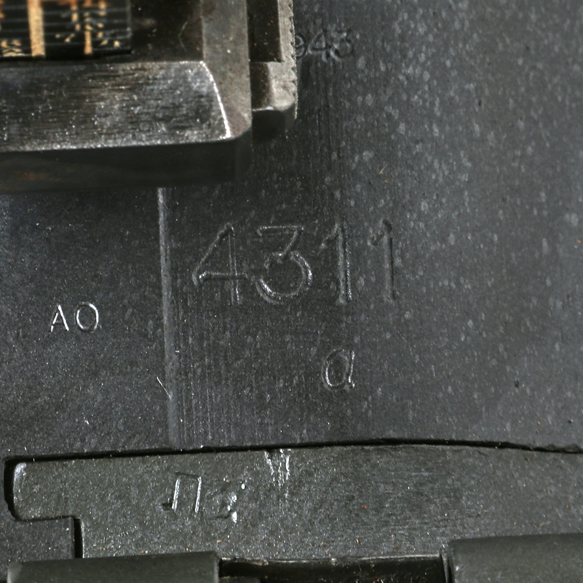 The top cover has had the markings stamped / peened over, so we cannot see any maker marks or proofs. It has been stamped with replacement serial number 320. The lower feed tray is marked with pre-WWII Zahlencode (Number Code) 963 for manufacture by Johannes Grossfuss of Döbeln/Sachsen prior to 1940. This maker later used three letter code "bpr", and made numerous small arms components during the war. They are a known maker of feed trays and top covers for both the MG 34 and 42. There really are some great markings on this very fine example of the most prolific German issued Light Machine gun of WWII, with lots of potential for research.