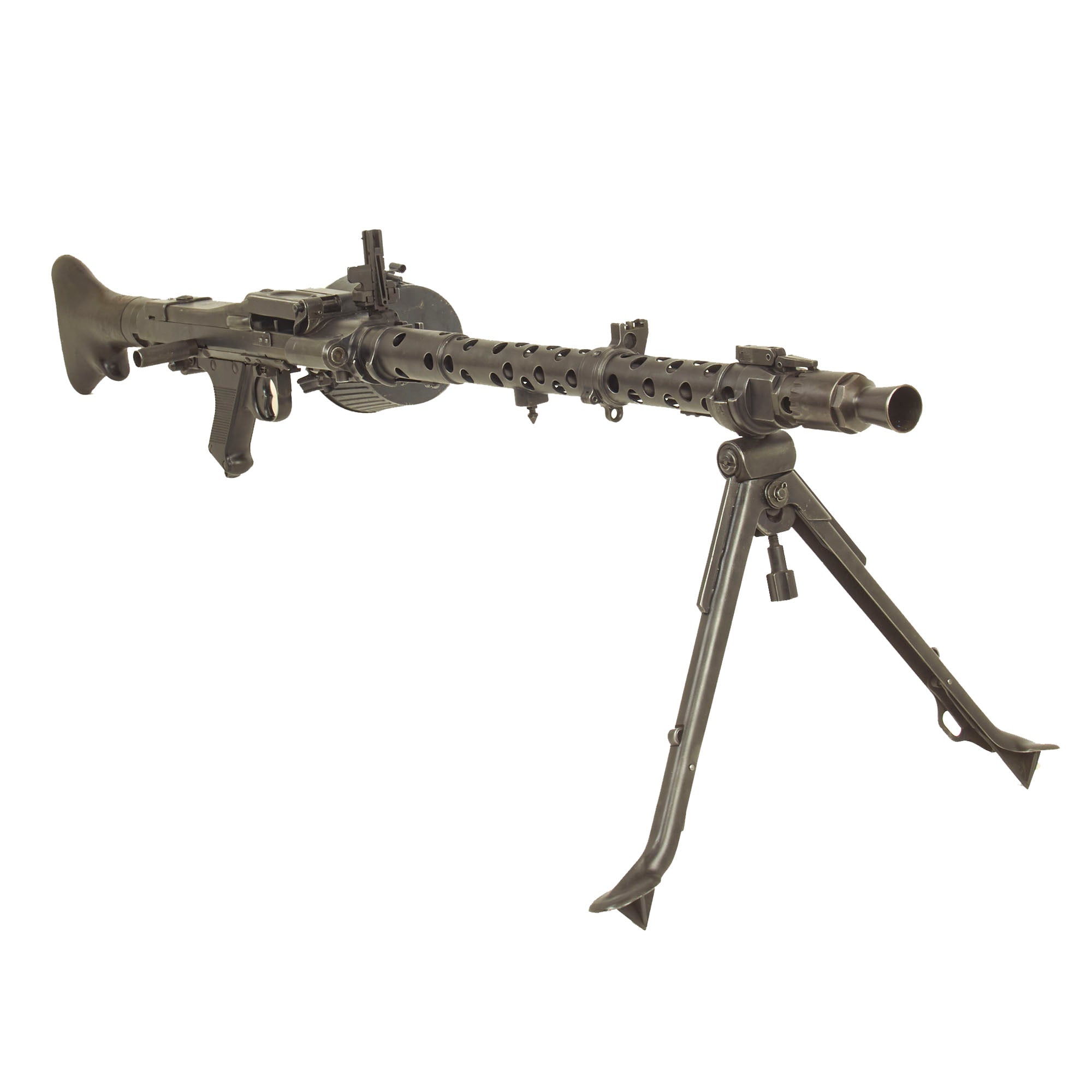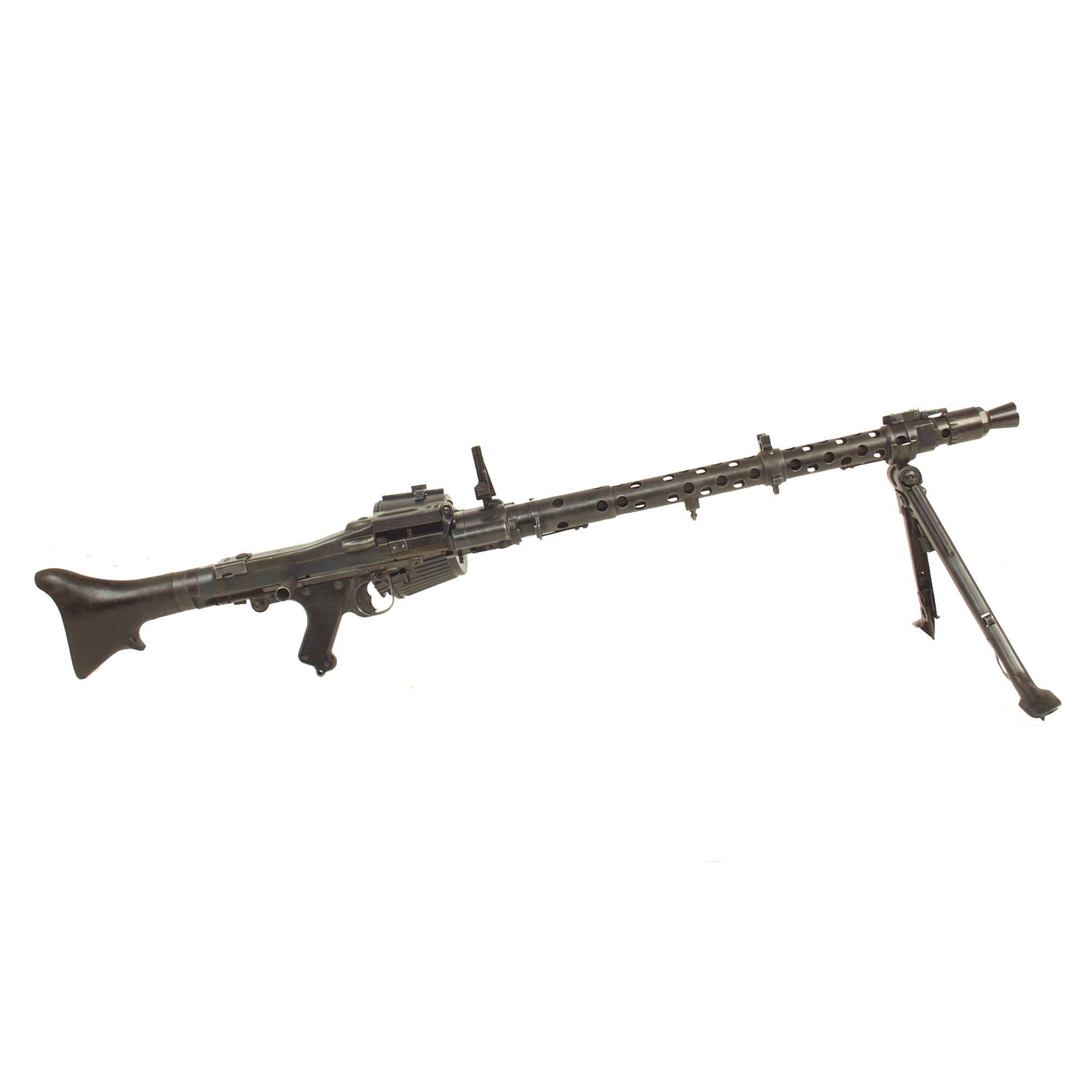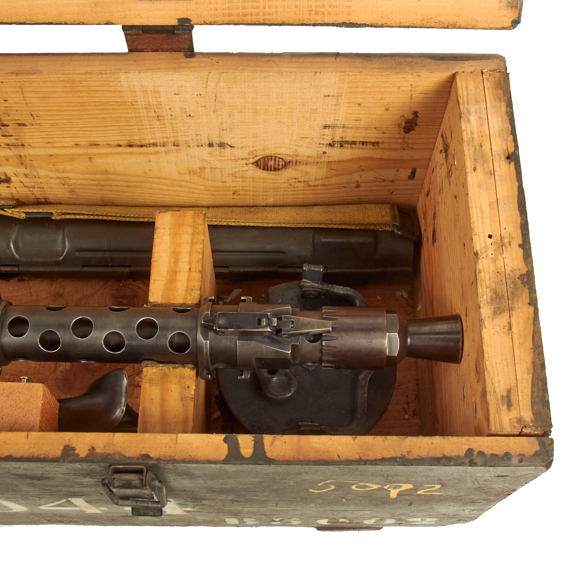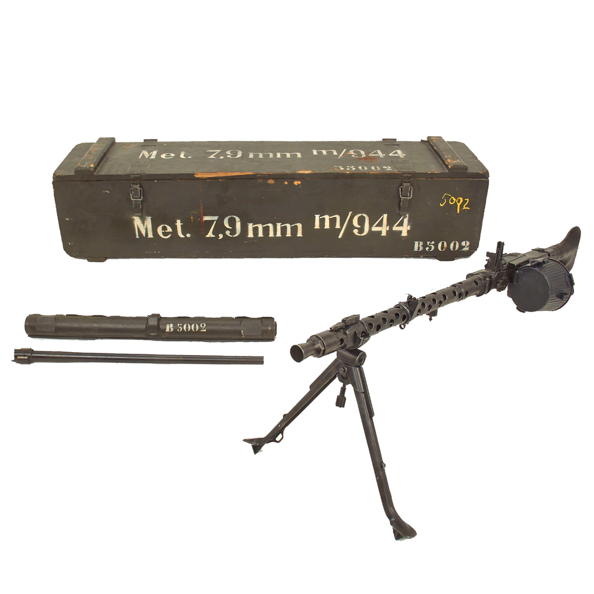 Original Items: One of a Kind Set. We have not had one of these for years! Released in the 1970s from military stores (in Portugal), this is one of just 500 MG 34 LMGs produced by NSDAP Germany and delivered to Portugal in early 1944. Portugal had adopted the MG 34 in 1940, designating it the M/940, but re-designated it the Metralhadora 7.9mm M/944 when this shipment arrived. These were all marked "dot" on the barrel jacket for manufacture and final assembly at Waffenwerke Brünn in Czechoslovakia, formally Zbrojovka Brno before its capture by Germany. They also were all marked Konstruktion Rheinmetal-Borsig on the top cover, for the original designer of the MG 34. These were all delivered in matching numbered transit chests, with matching spare barrels and other accessories.