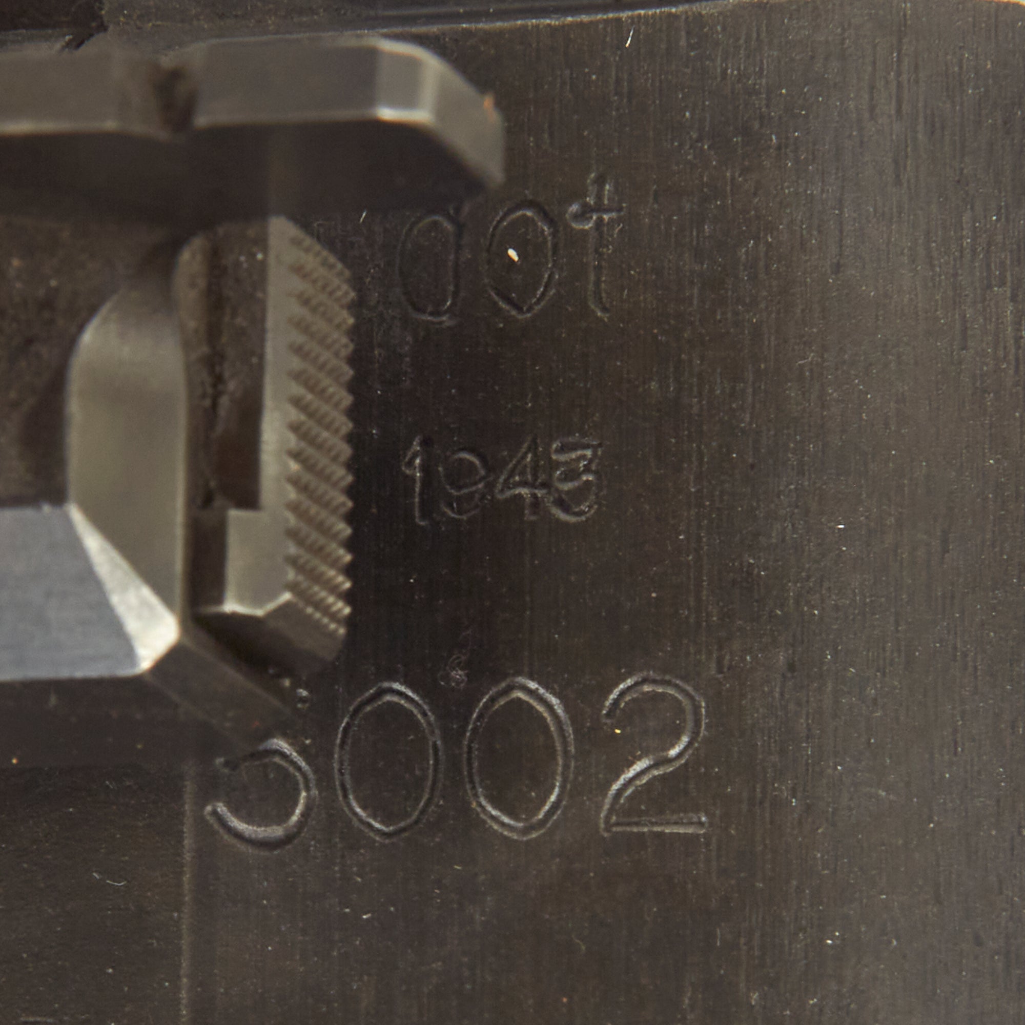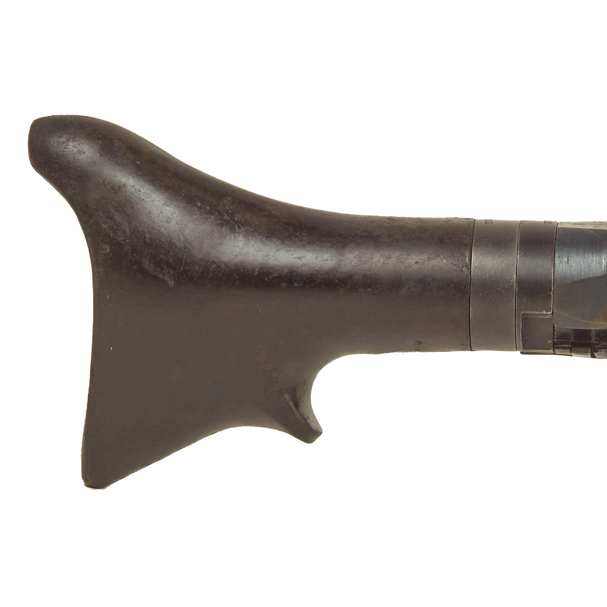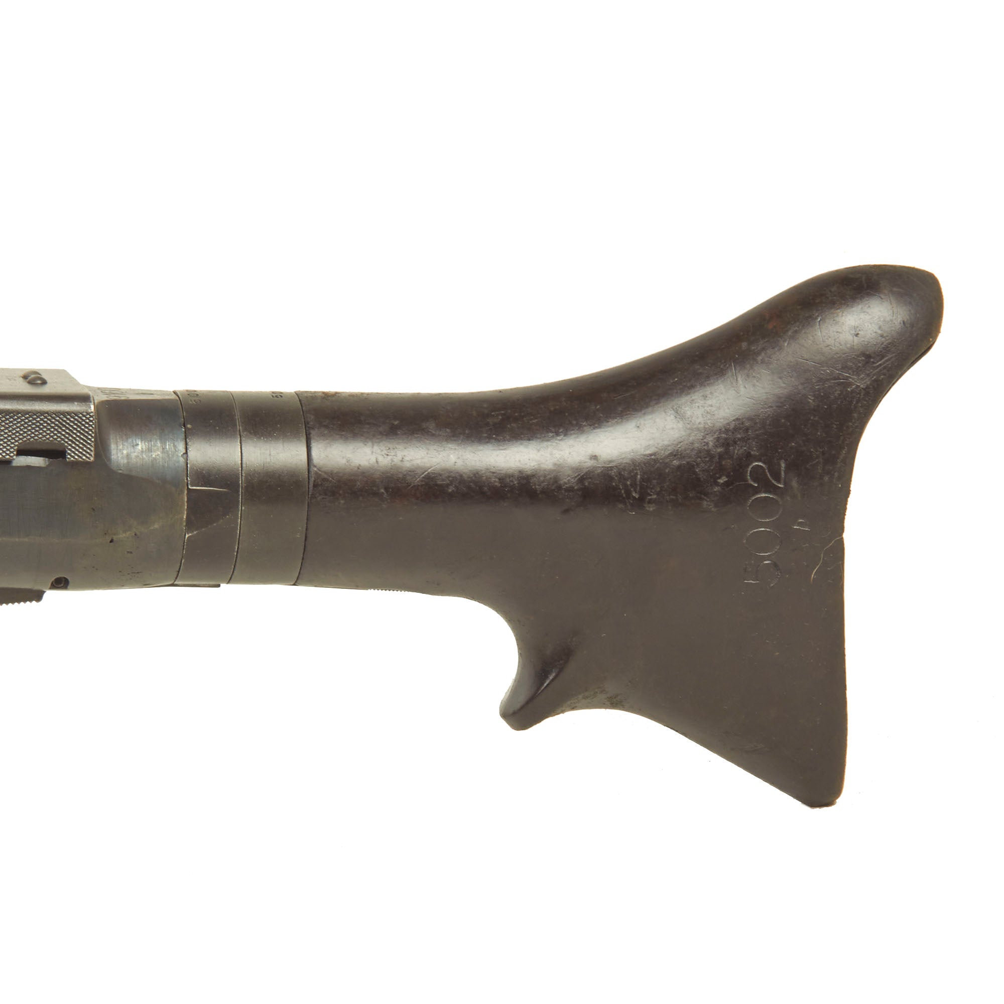 The display gun itself is in excellent condition, and is coded along with multiple German wartime markings. It does not bear many of the usual Waffenamts, as it was not made for domestic use. It bears original serial number 5002 / b on the barrel jacket, along with dot / 1943 for manufacture by Waffenwerke Brünn in Czechoslovakia. The top cover is marked with the correct contract information and asset number: