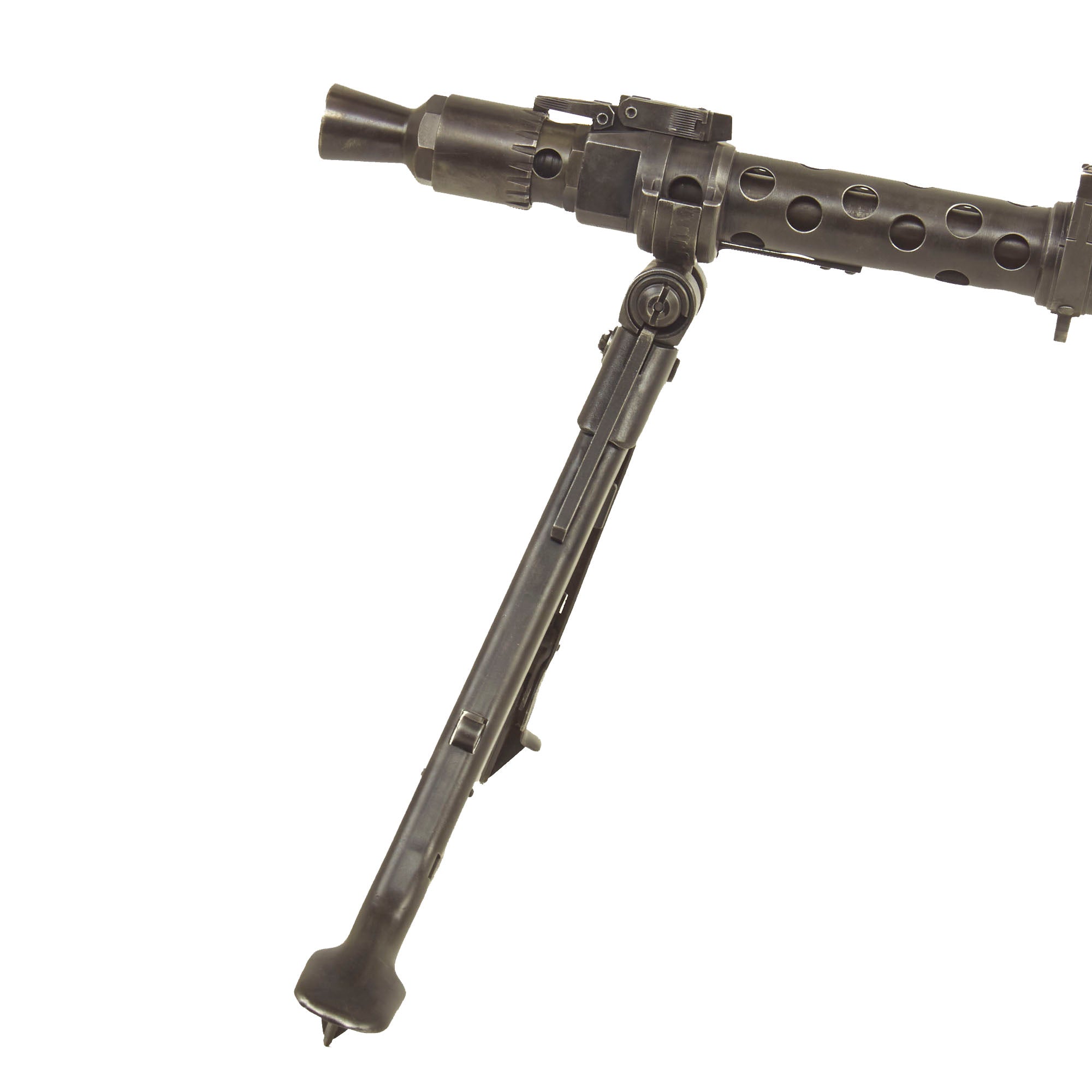 The top cover is also marked with clc, the maker code for Richard Ab. Herder of Solingen, a maker of cutlery and tools in the legendary "City of Blades". The feed tray is marked with bpr, for Johannes Grossfuss, Dölbeln in Sachsen, a known maker of feed trays and top covers. The bipod included is of the early war design, without the central height adjustment knob, and is in excellent condition. It is maker marked kur 43 on the central hub, for Steyr-Daimler-Puch AG, Werk Graz, Fuhrhofsgasse 44, production in 1943. Next to this is a partial Waffenamt WaA815 marking, correct for this factory. There really are some great markings on this very fine example of the most prolific German issued Light Machine gun of WWII, with lots of potential for research.