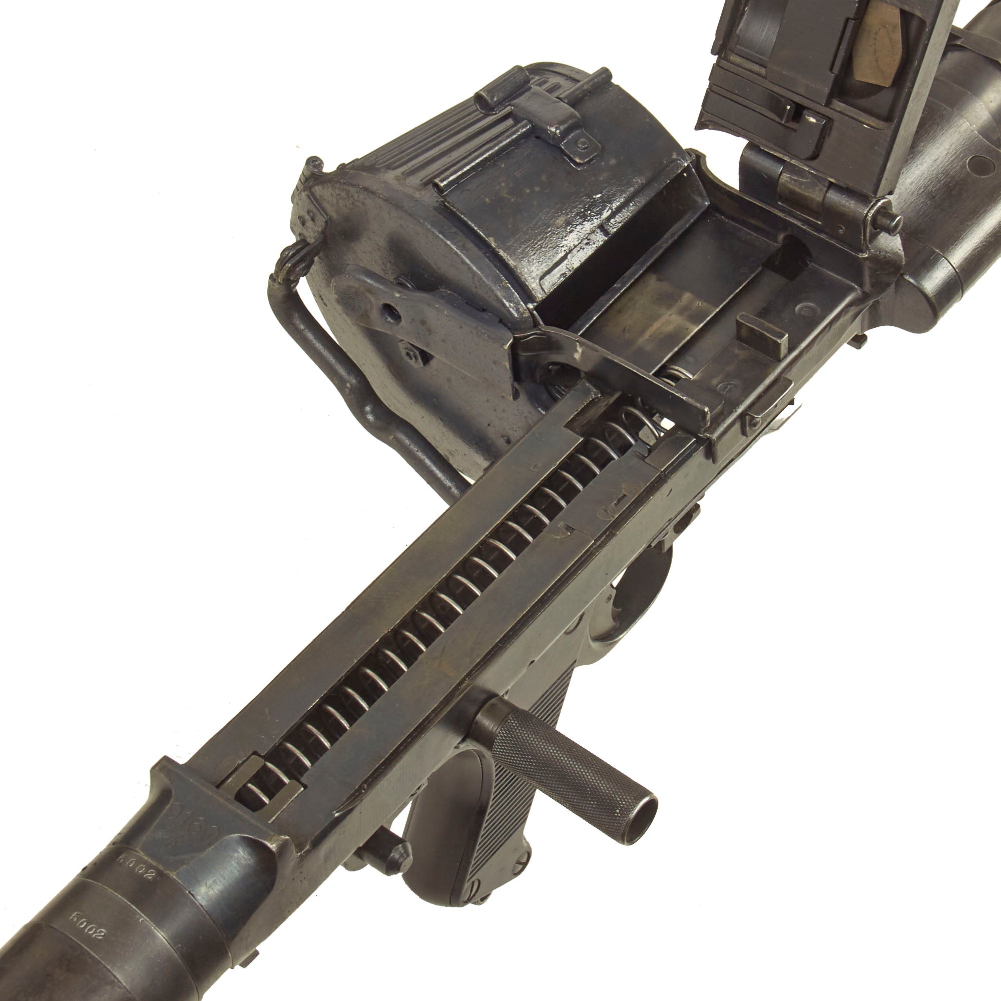 The front and rear sight still flip up and function correctly, and the bipod folds away and locks in correctly. The rare bakelite butt stock is in excellent condition, with no issues to note. The basket belt carrier properly locks onto the feed tray, and the top cover can be opened as well. The butt stock and bipod can be removed, and the display gun fits perfectly in the original transit chest.