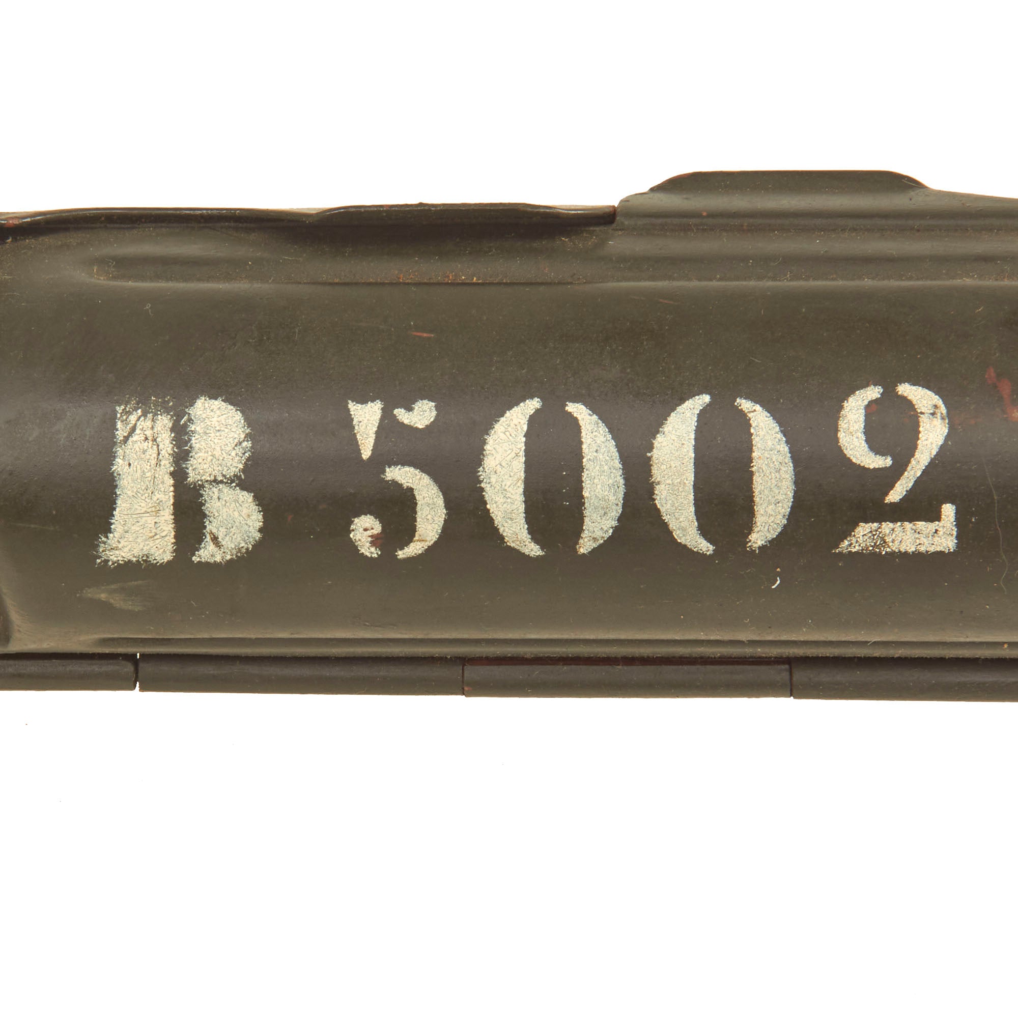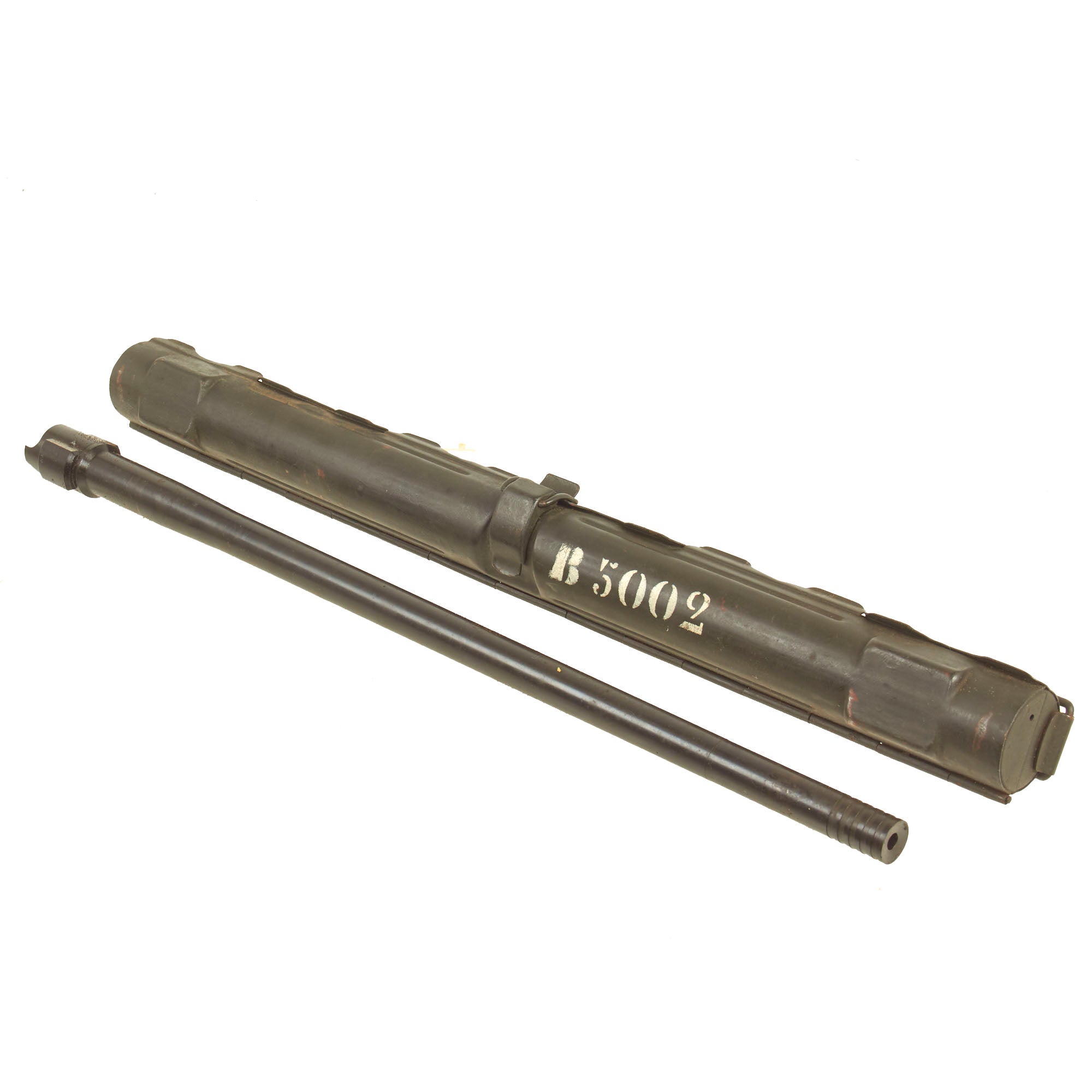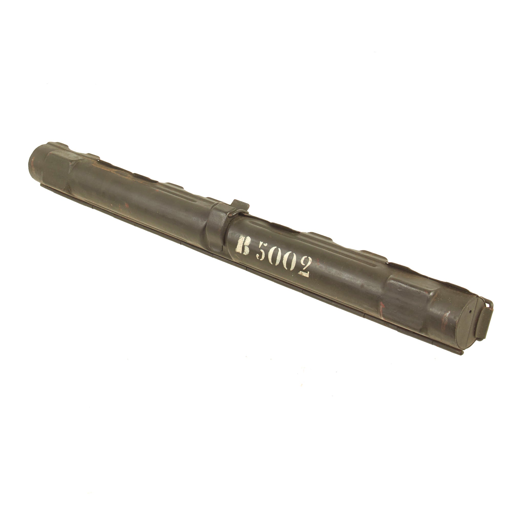 The display gun features a rare and desirable bakelite butt stock, and comes in its original fully marked transit chest, marked Met. 7.9mm m/944 B5002 on the front side. The chest measures approximately 48"L x 11 1/2" x 11 1/2", and still contains most of the original dividers, though many of the retaining slats are now missing. Inside the chest is a serial number matched MG 34 barrel carrier with the matching replacement barrel inside, as well as an original WWII production basket belt carrier in the correct wartime gray blue color. It is marked wc 41, for 1941 production at the Meuselwitz, Thuringia plant of HASAG-Eisen- & Metallwerke GmbH, previously known as Hugo Schneider AG, Abteilung Lampenfabrik. This is truly a great offering, and we do not expect to have another like this anytime in the year future!